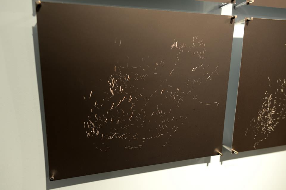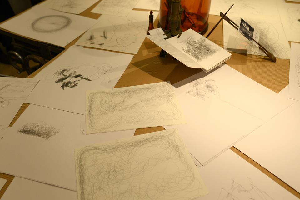 て捉え、手の動きを通して鉛筆の線に変換させるものです。かすかで柔らかな線や何本もの濃い鉛筆で描