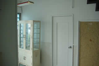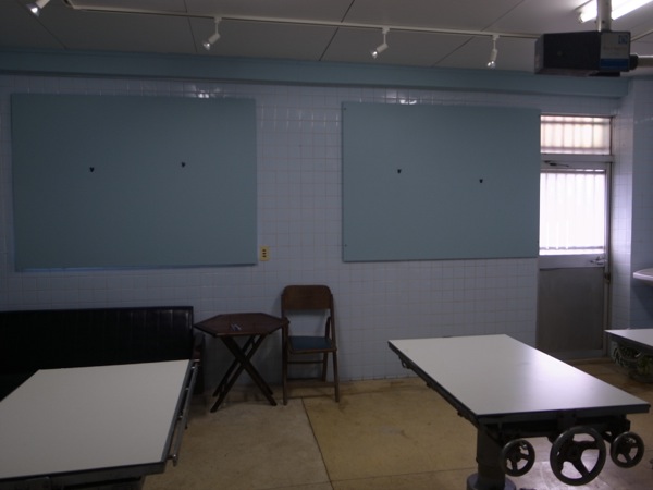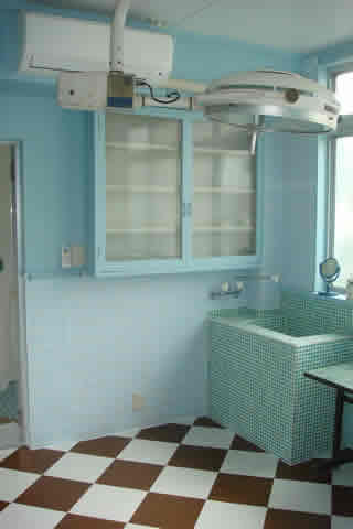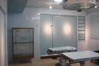 床や壁もタイル張りそのまま、手術台や無影灯、医療器具の棚や容器、薬局・受付を残して展示に利用、