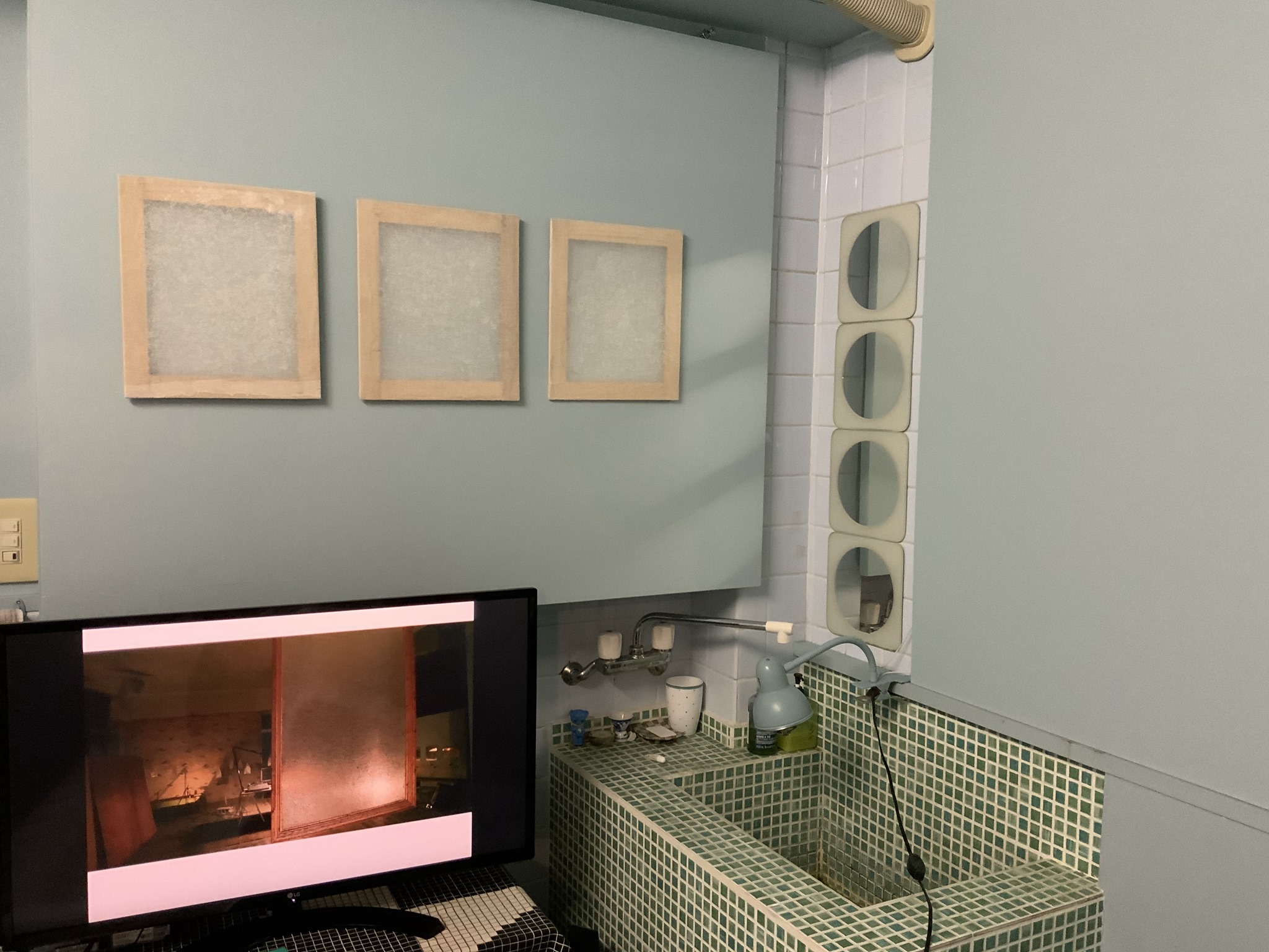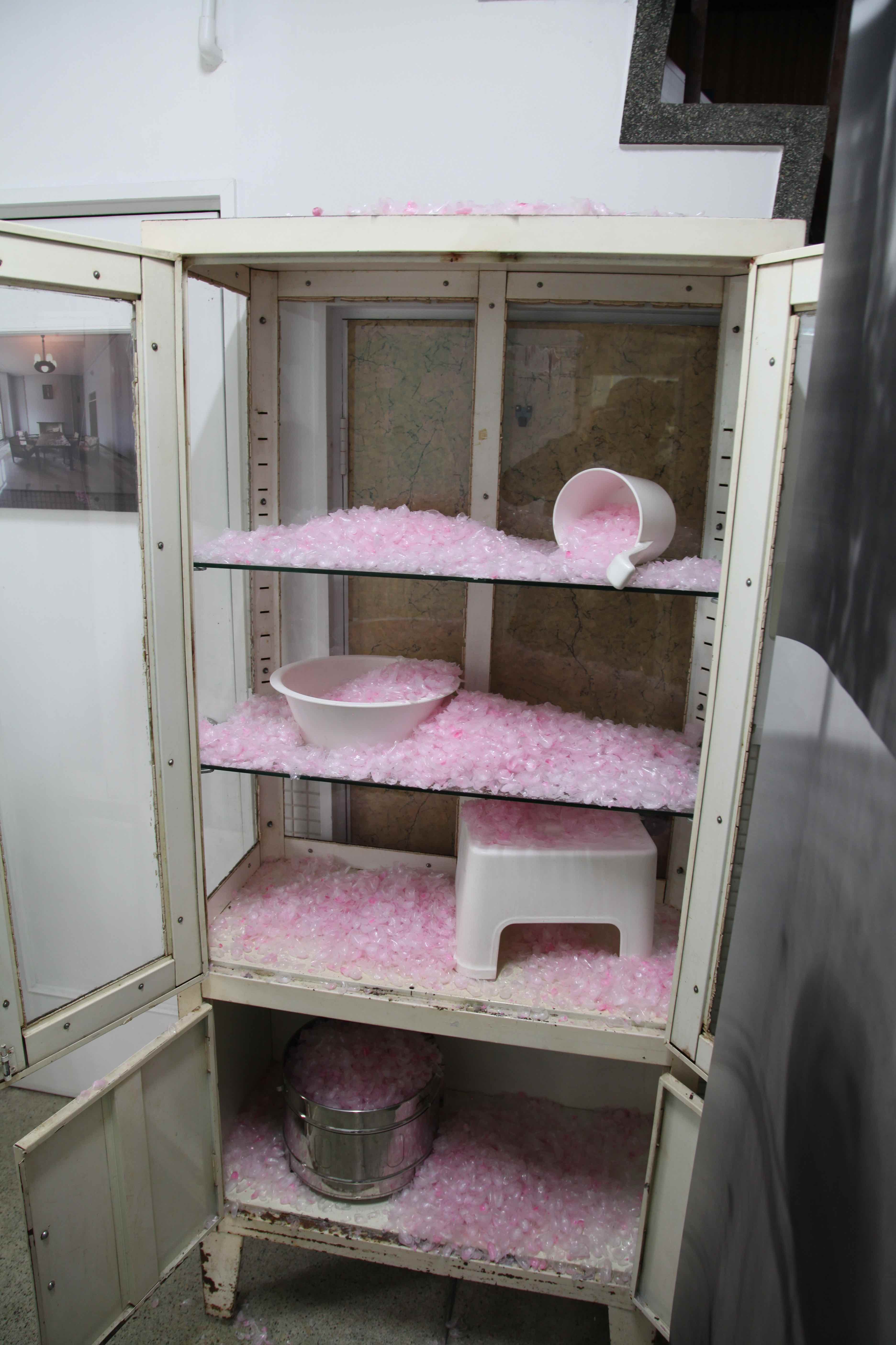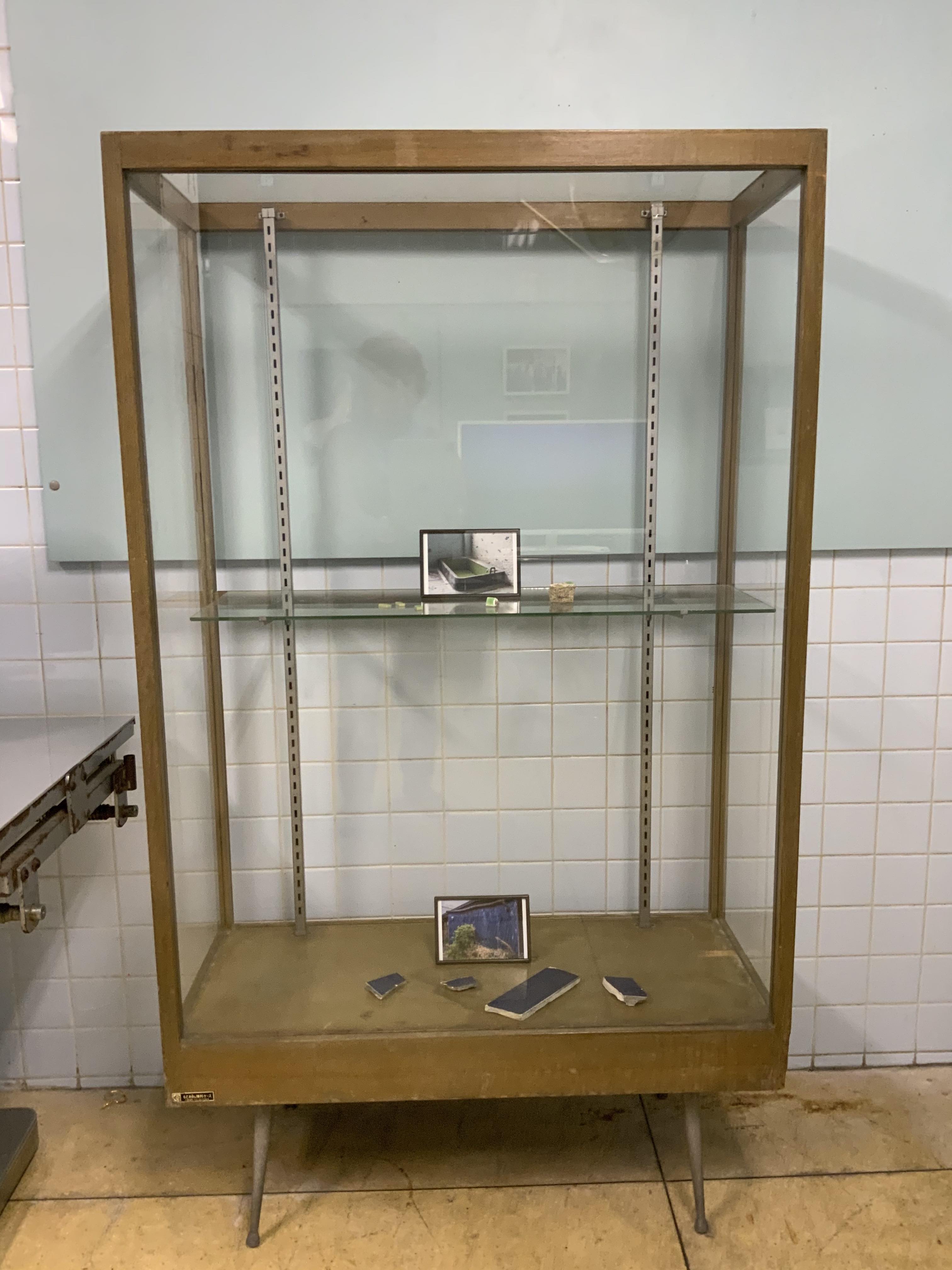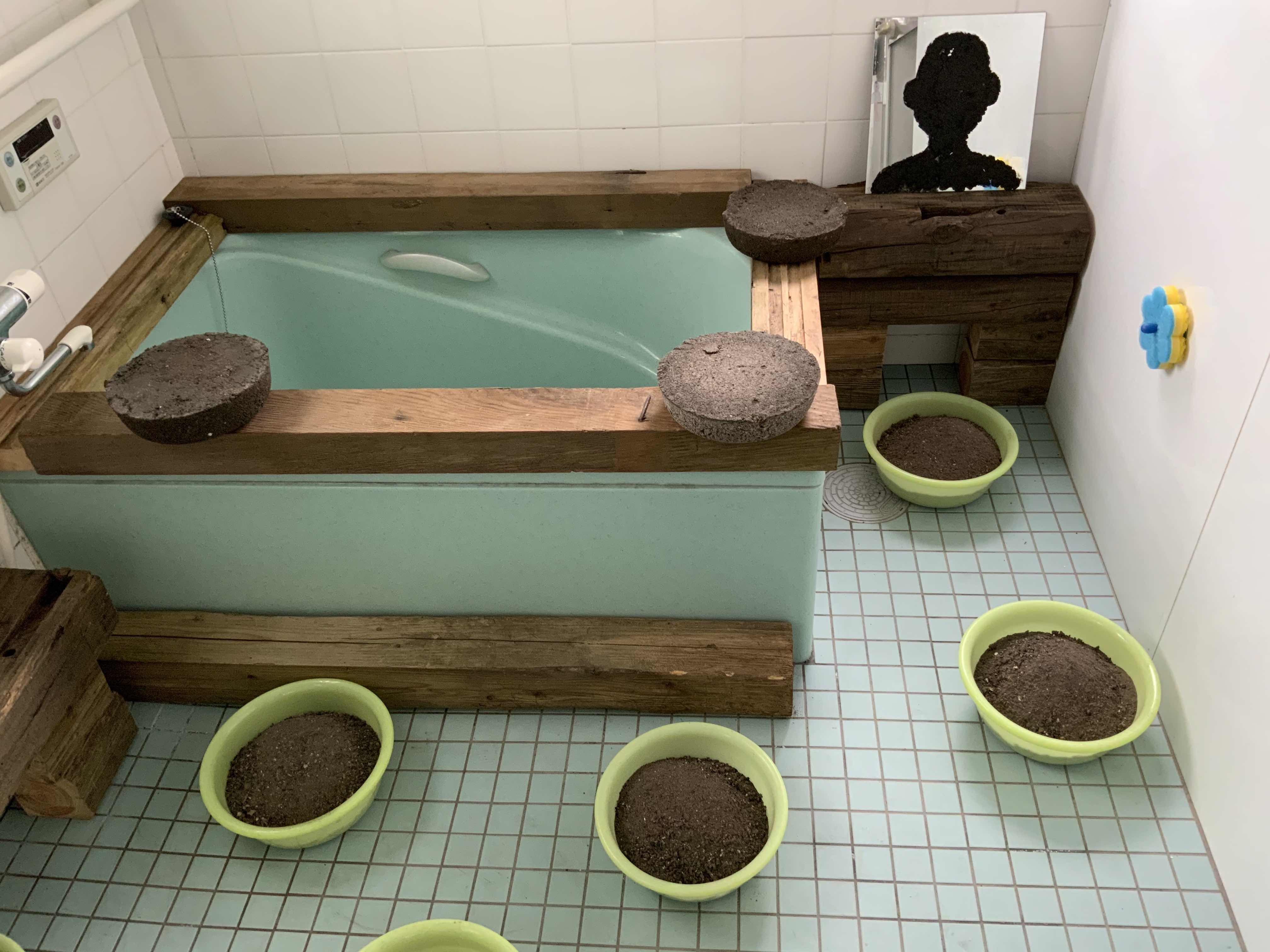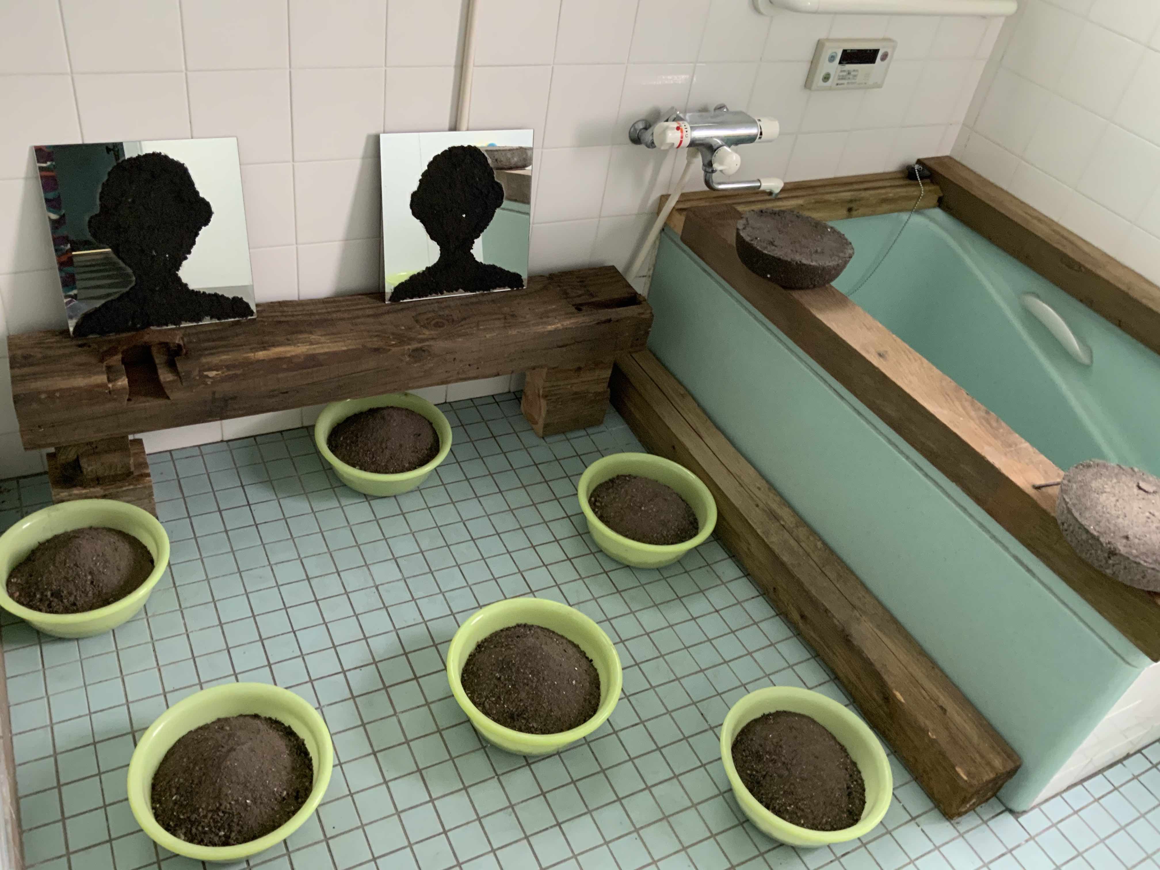 2017年「ずとち」に参加した出品作の再現。八万湯では、並んだ洗い場に残っていた実物の鏡を使ってのインスタレーションだった。八幡東区に残る銭湯では、近隣で処分される個人家屋の廃材を燃料としたそうで、そのような廃材と、それが燃料となって残された灰を固めたオブジェによるインスタレーションだった。今回はQMACレジデンス・ルームの浴室が舞台となった。