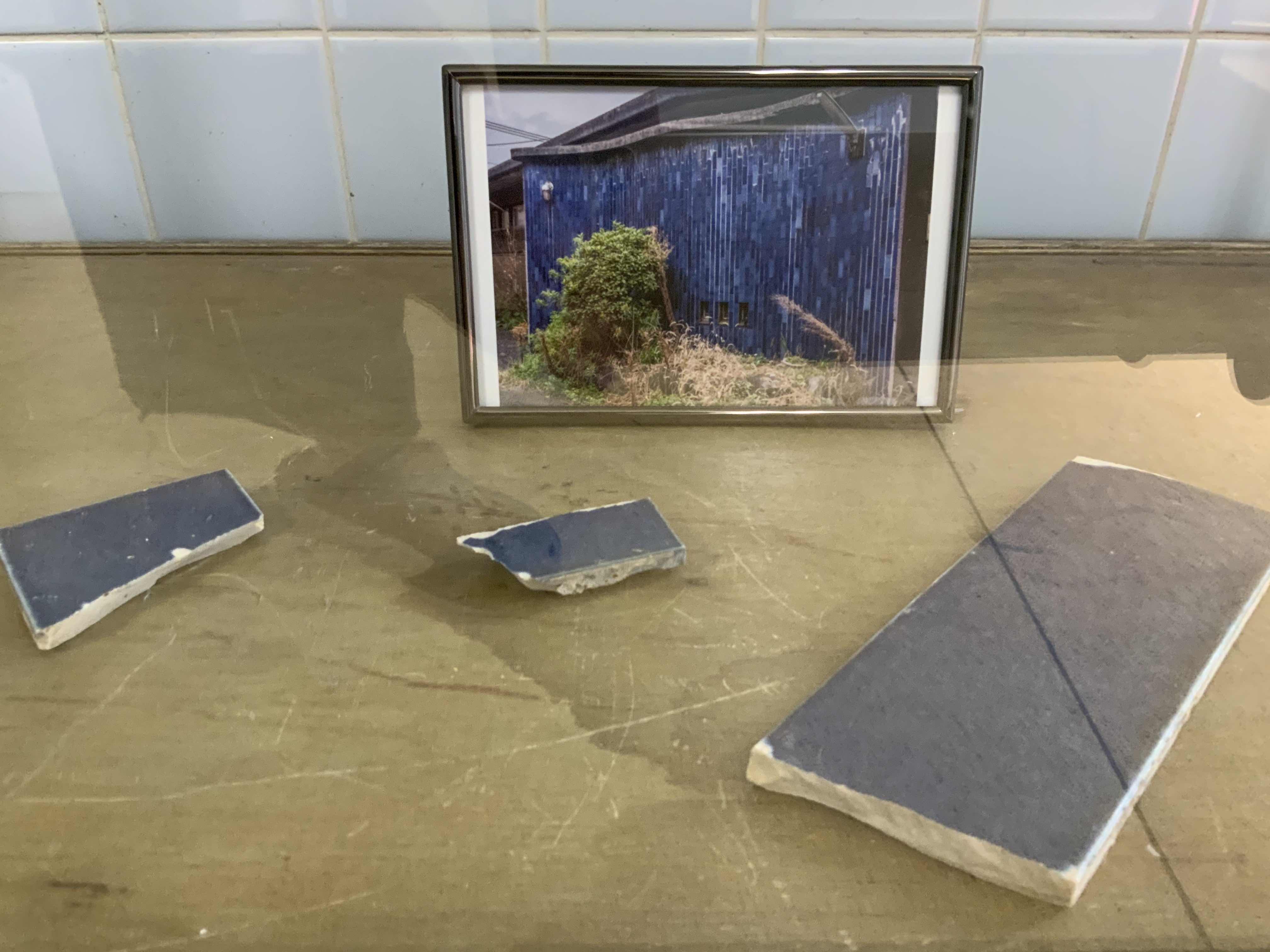 鈴木淳が八万湯取壊しが決定した直後に撮影し、2019年12月31日(火)「今日のこの一週間の写真」(その367)として発表した写真2点、と八万湯の建物が解体されさら地になった場所で土の中から拾ってきたタイルのかけら。