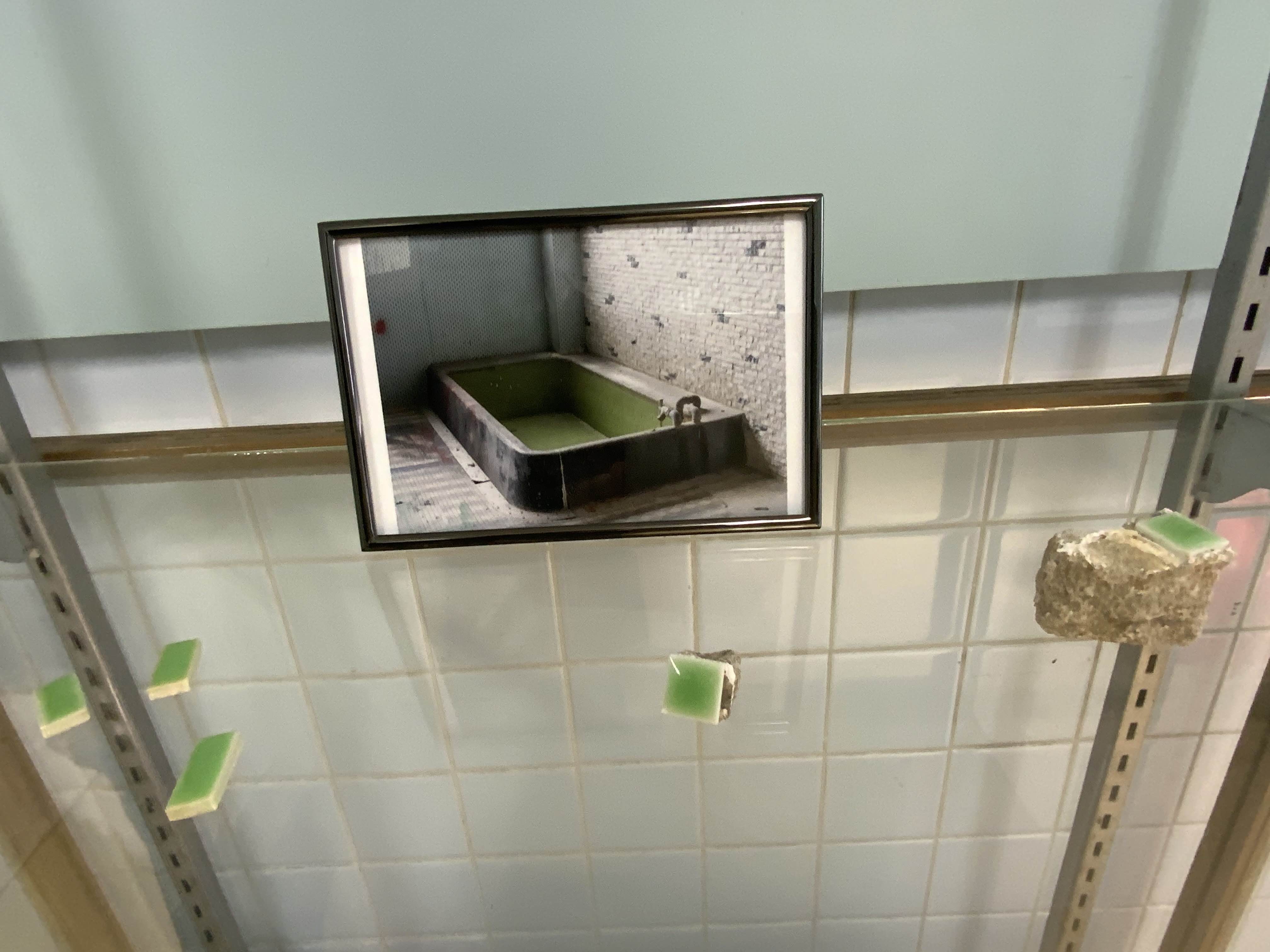 八万湯プロジェクトが使っていた女湯の浴槽写真とそのタイルの欠片。