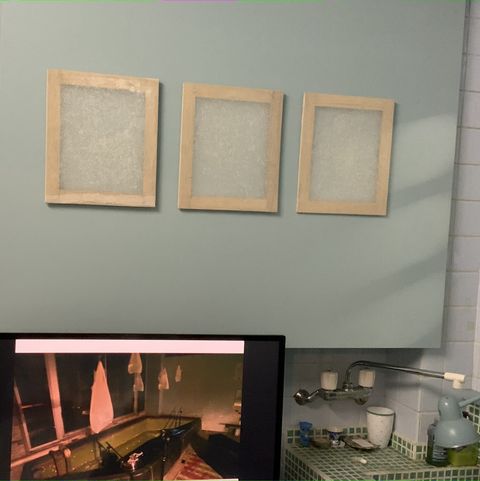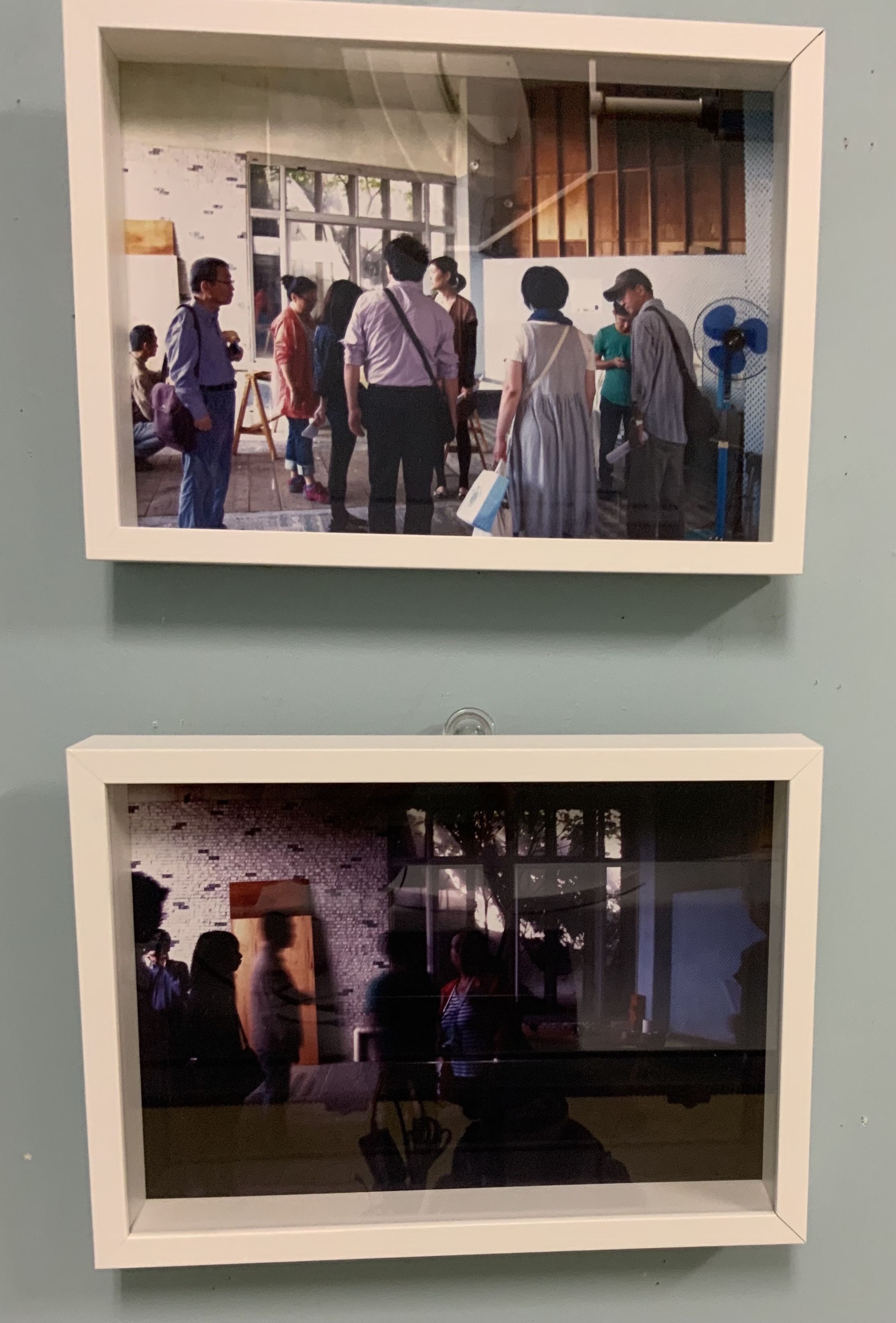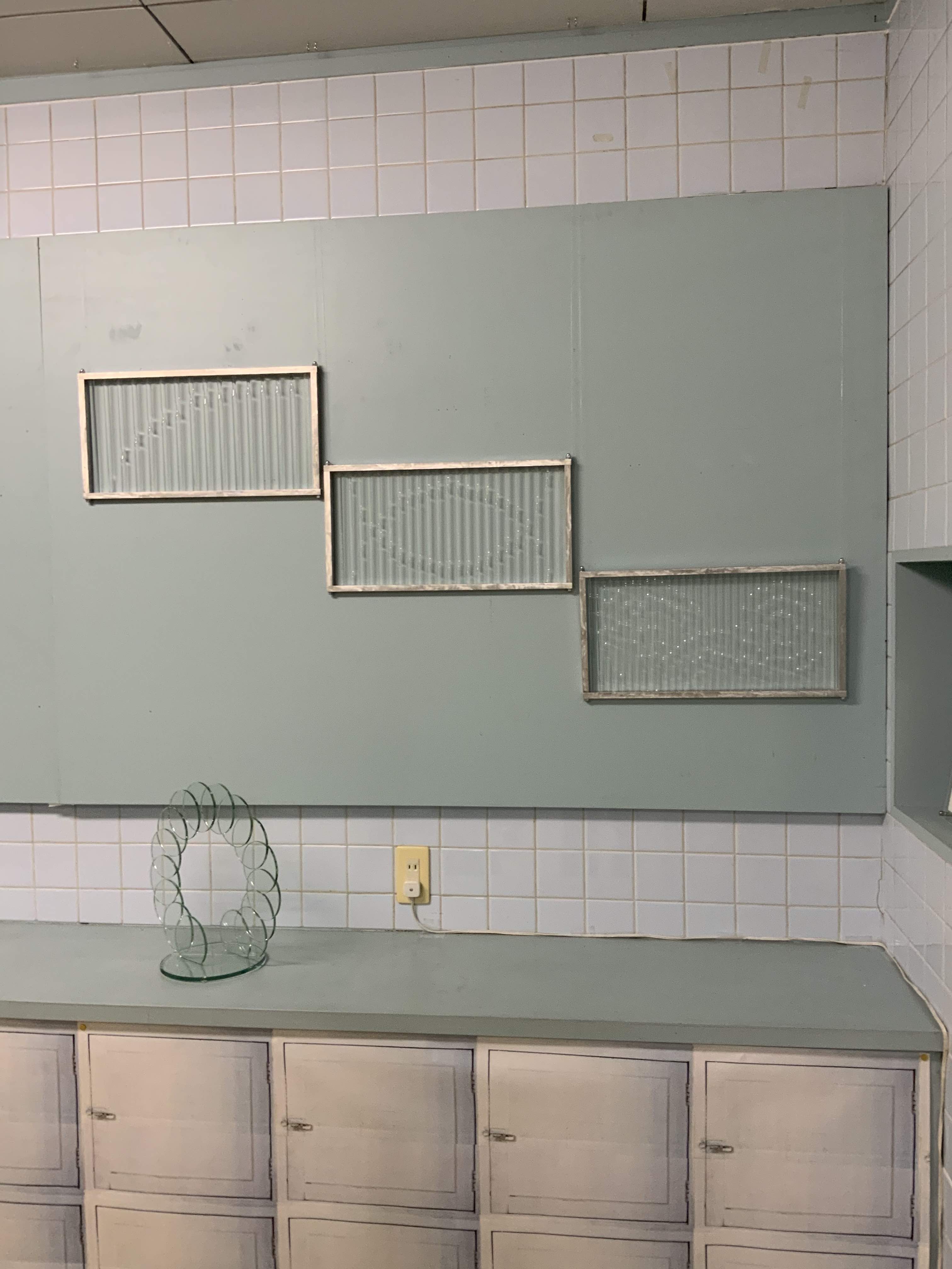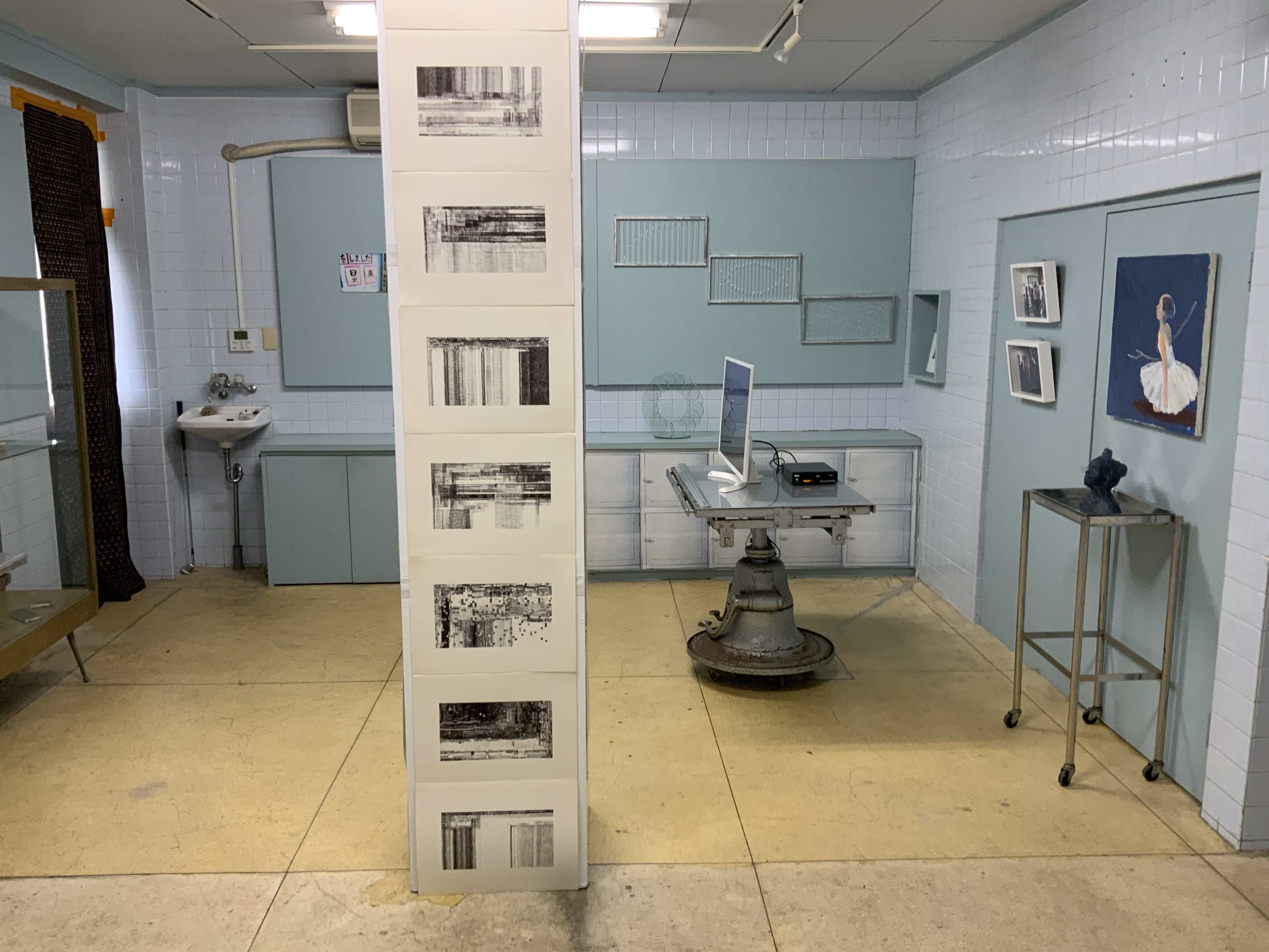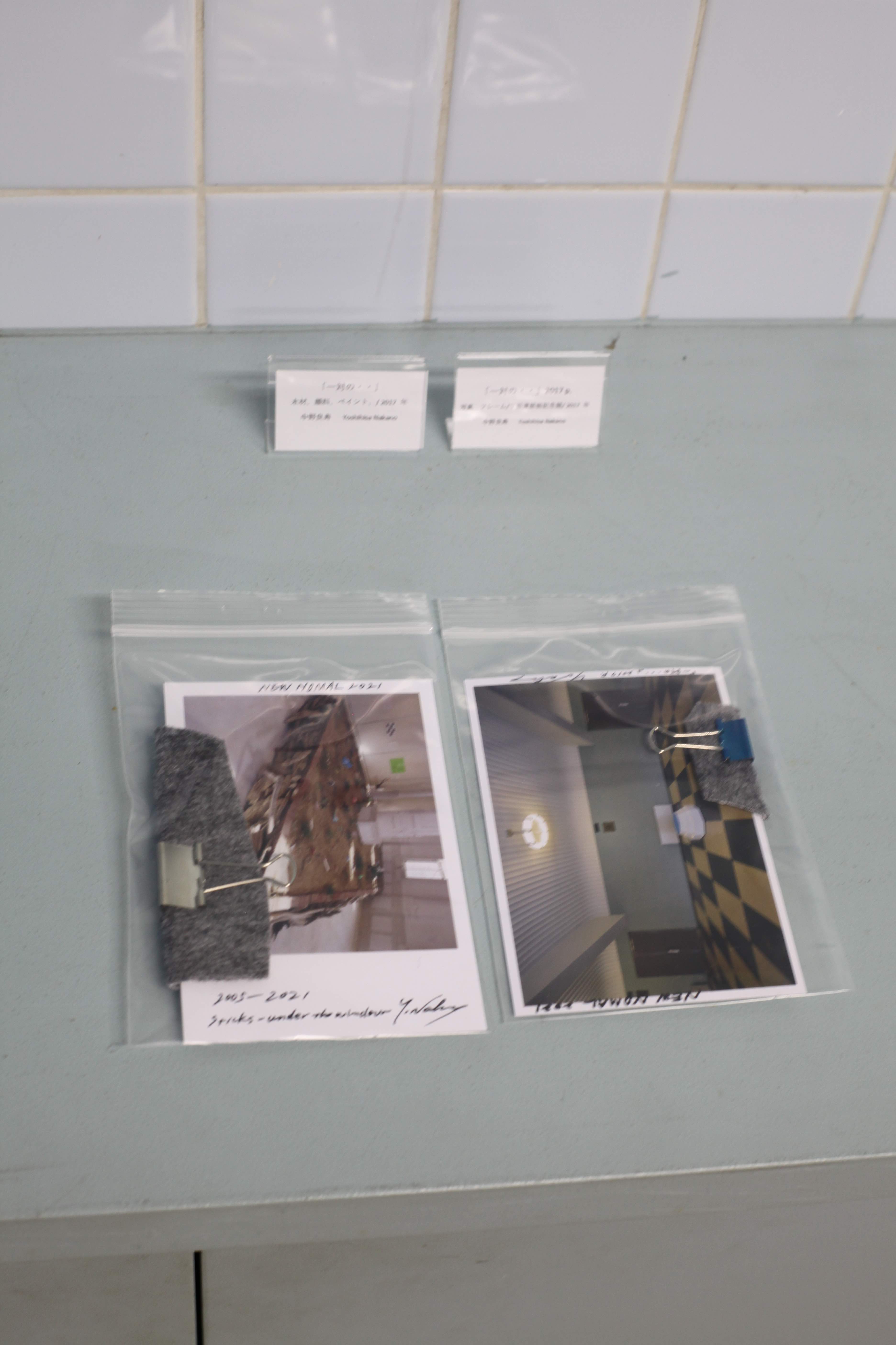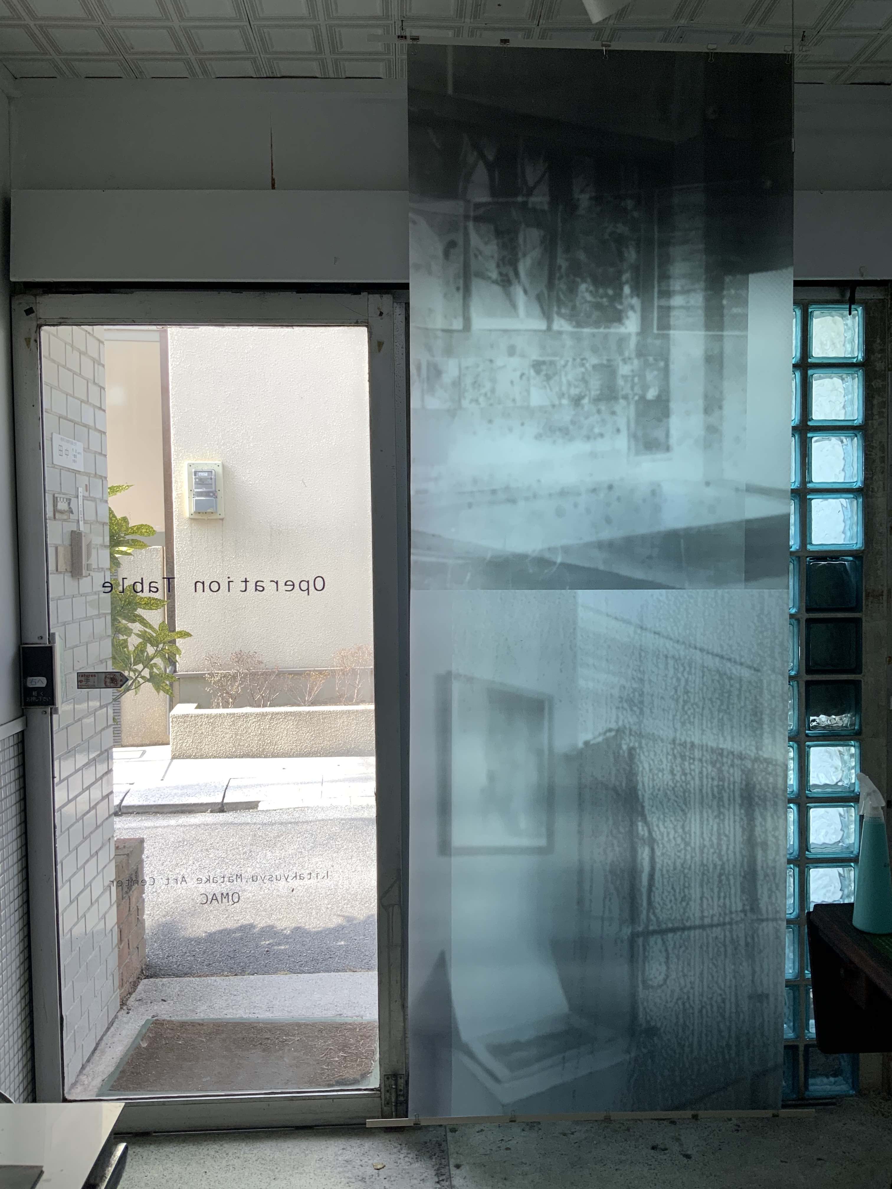 八万湯内部の写真をトレーシングペーパーにプリントした谷尾の作品。上下とも谷尾の作品が掛けられた2017年「ずとち」の展覧会情景が元になっている。
