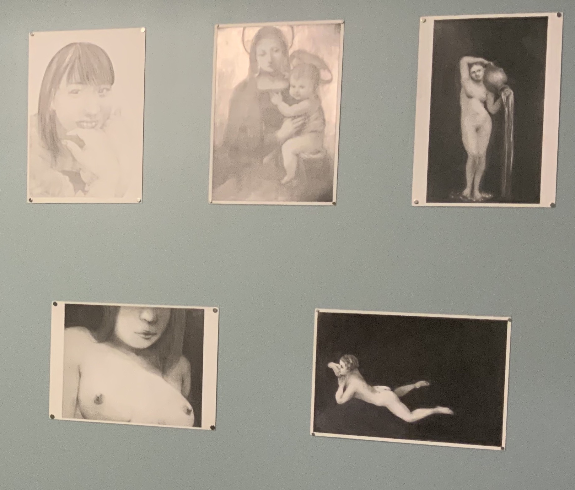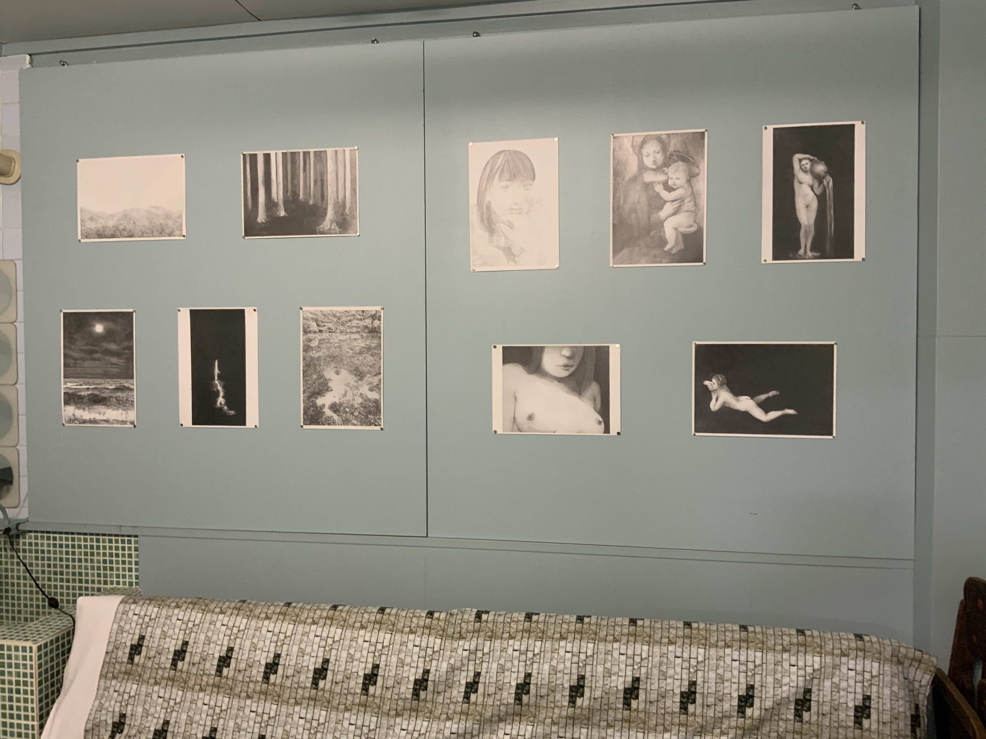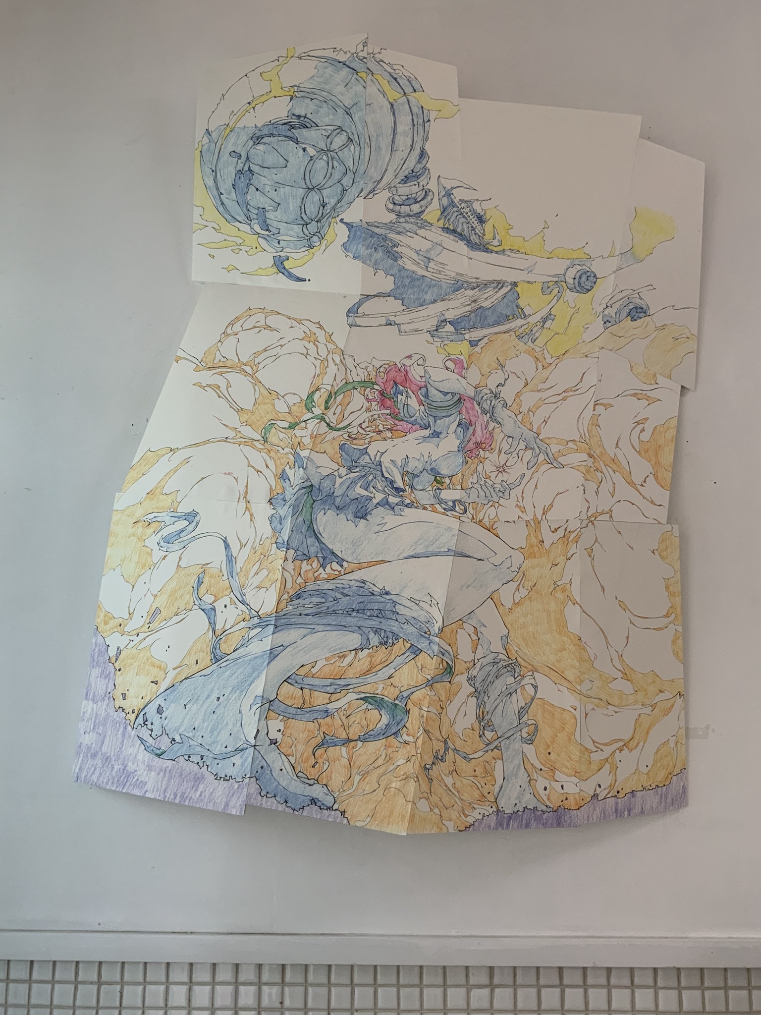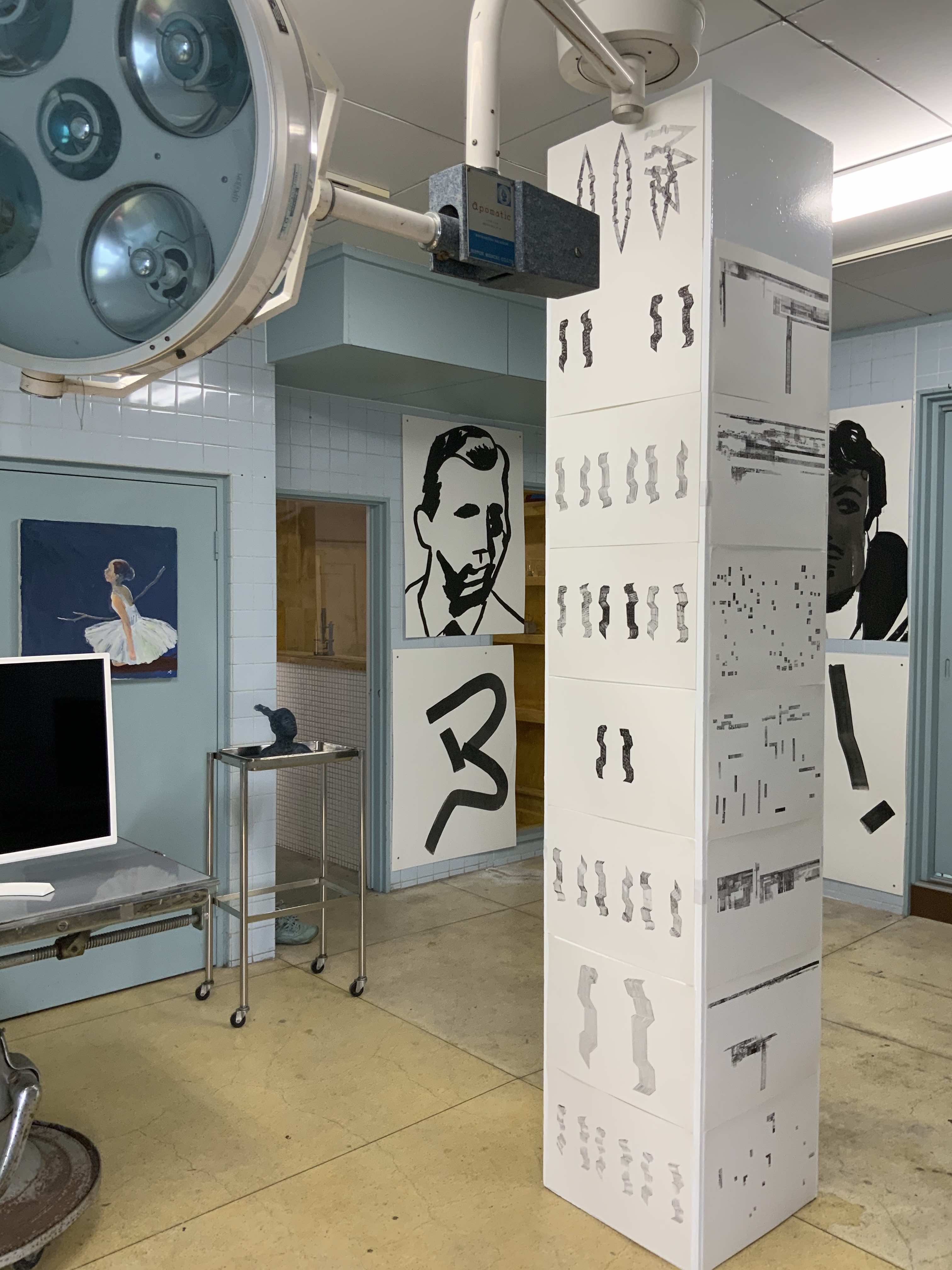 柱の四周にドローイングが貼られている。バグが発生したコンピュータ画面を描写したものらしい。