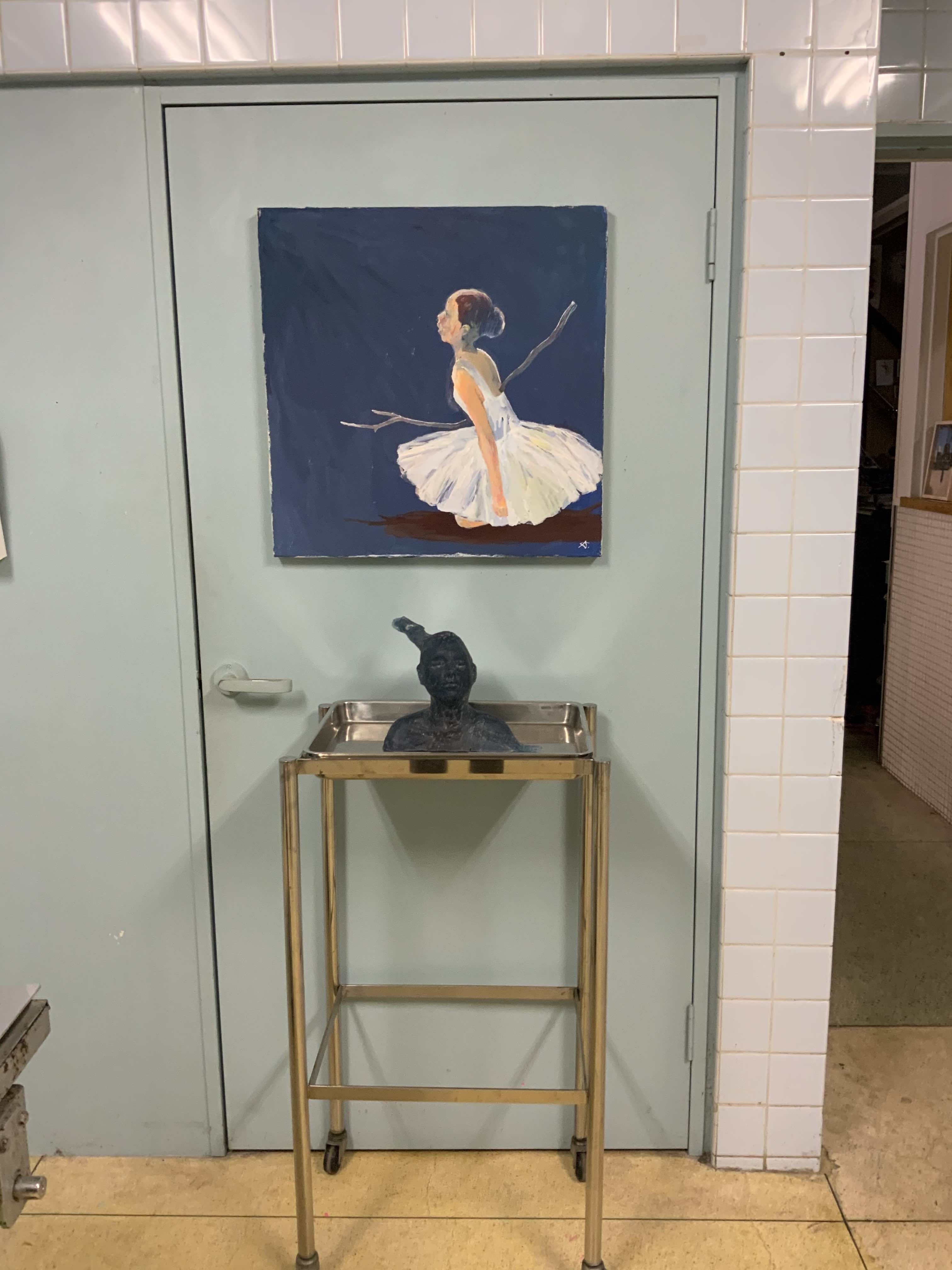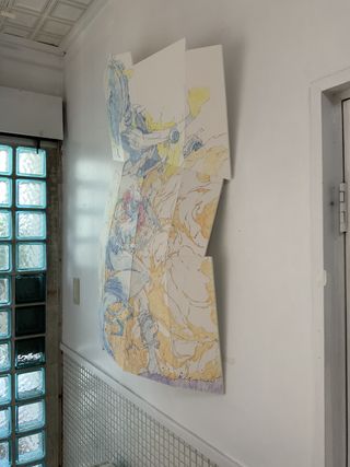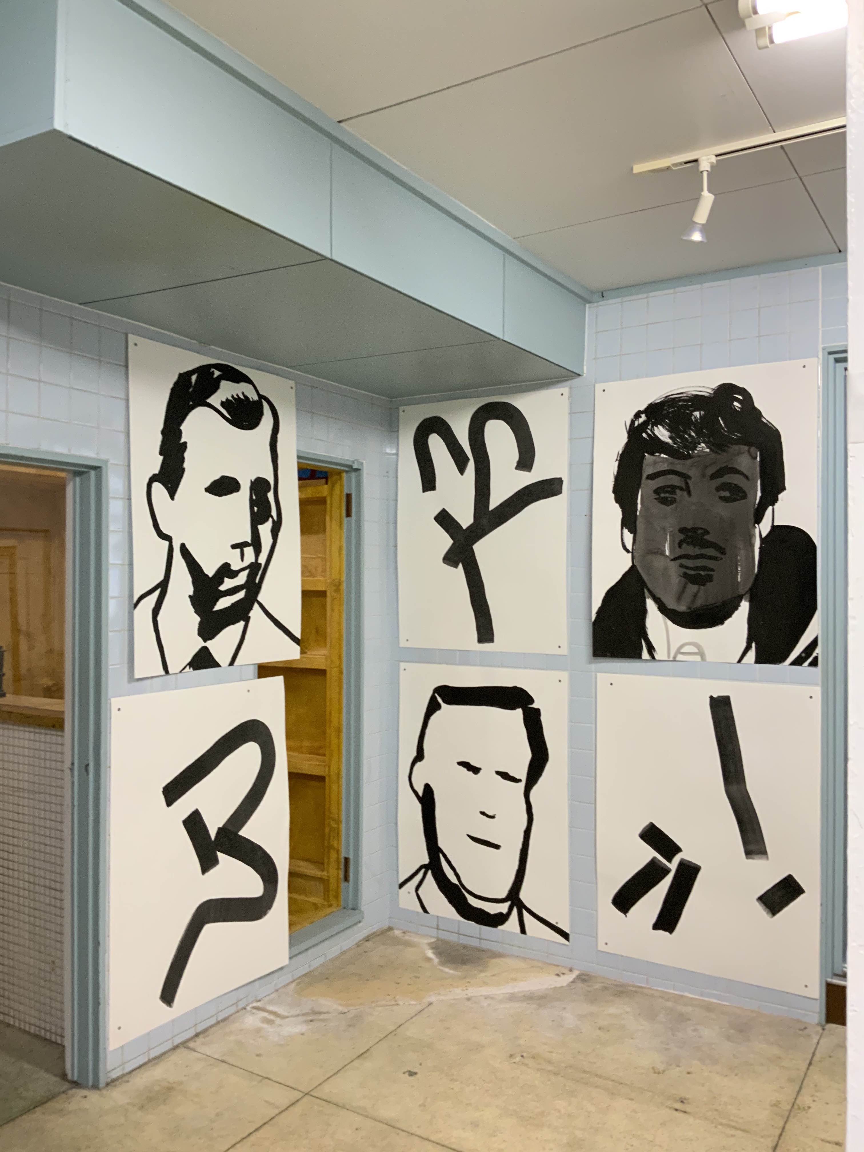 2017年に参加したグループ展「ずとち」に出品していた作品。八万湯のタイル壁に下げた作品だったので、タイルの意匠はないが、Operation Tableでもタイル壁面に展示してみた。カリグラフィーとドローイングの接近を試みた作品。生島国宜のもう1点は舞踏家、松岡涼子を描いたシリーズからのもの。2015年Operation Table企画展「漂着」に松岡が参加したときに、生島に依頼し特別出品していただいた。