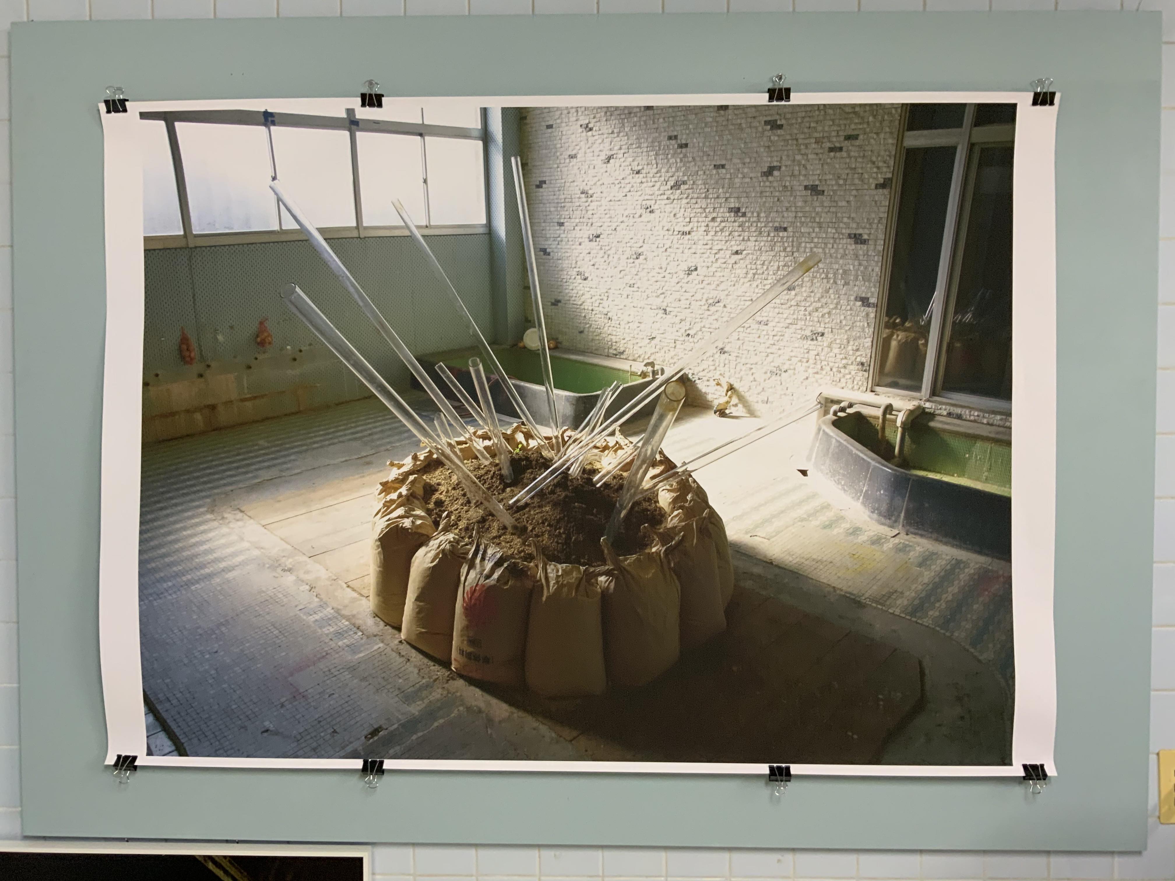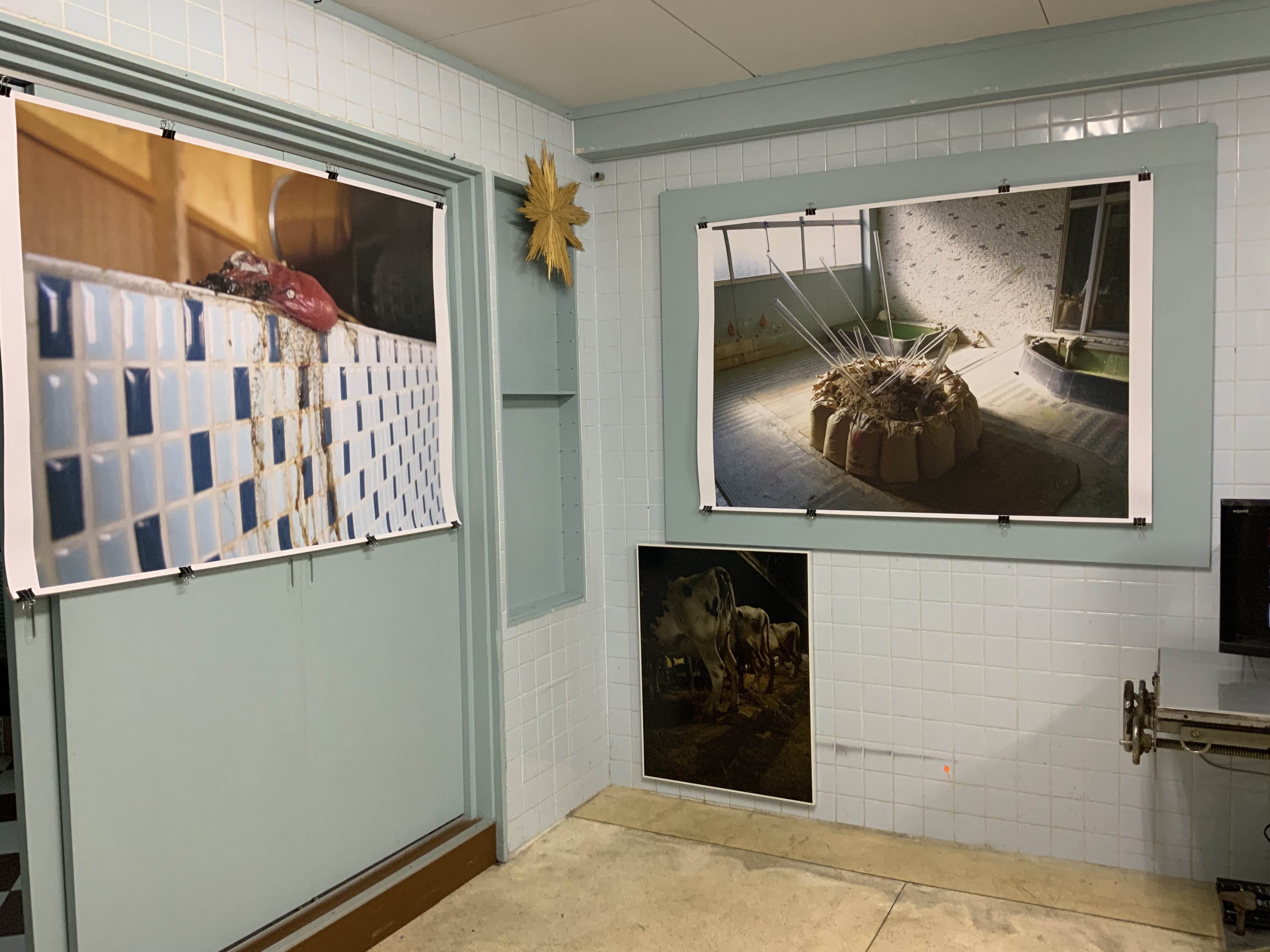 酪農家とアーティストとしての表現活動を併行している松野真知は、作品のテーマも乳牛の生活環境や酪農界が直面する諸問題を社会の構造と結びつけるもの。この作品は、2015年八万湯で開催された「In The Cycles/いくつもの環の中で」展のインスタレーションを記録した画像を拡大プリントしたもの。
