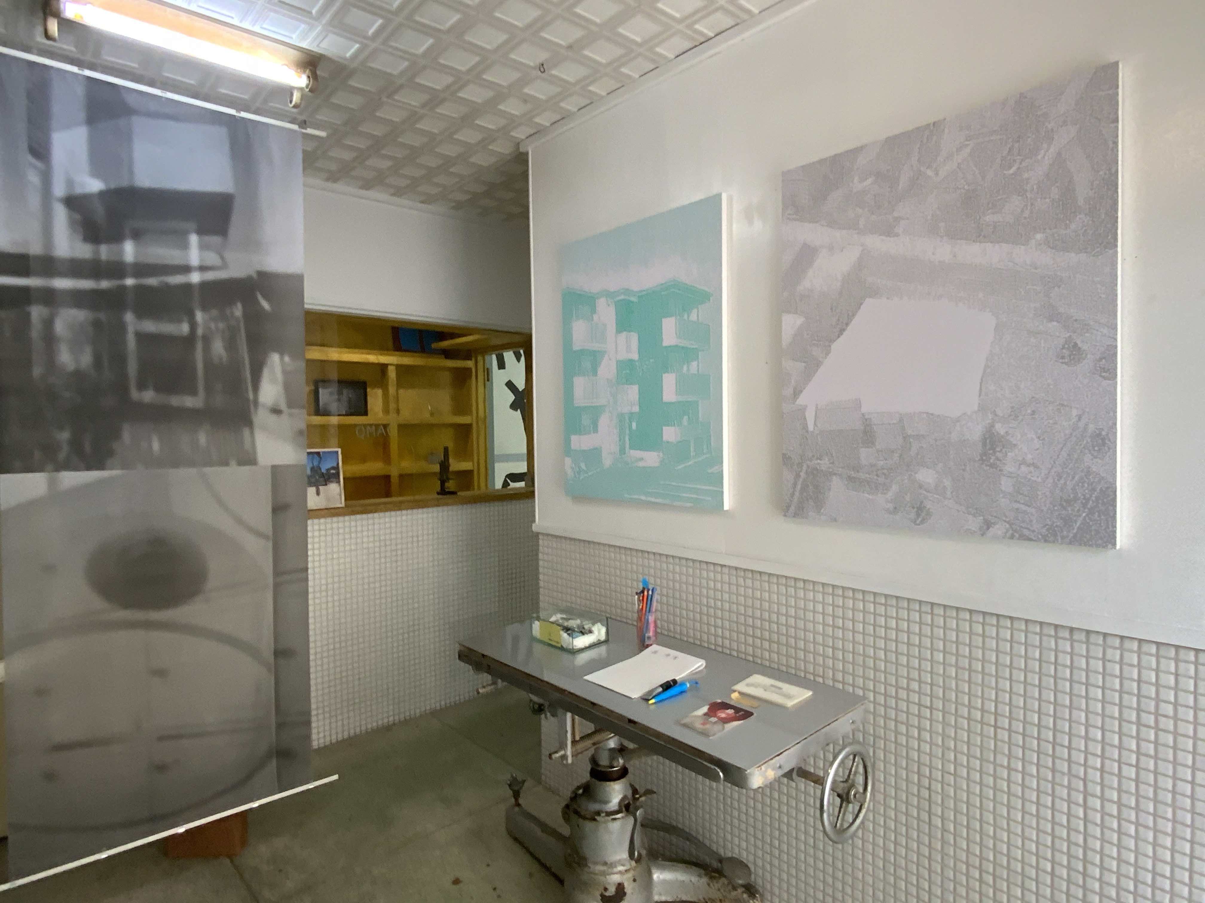 左に下がるもう1枚、上部は八万湯のファサードと女湯入口のダブル・イメージ、下部は並んだ脱衣箱とヘア・ドライヤーの写真。右壁には八万湯跡地とそこに新たに建つアパートの建築予定図、どちらも写真をもとにした谷尾のペインティングである。