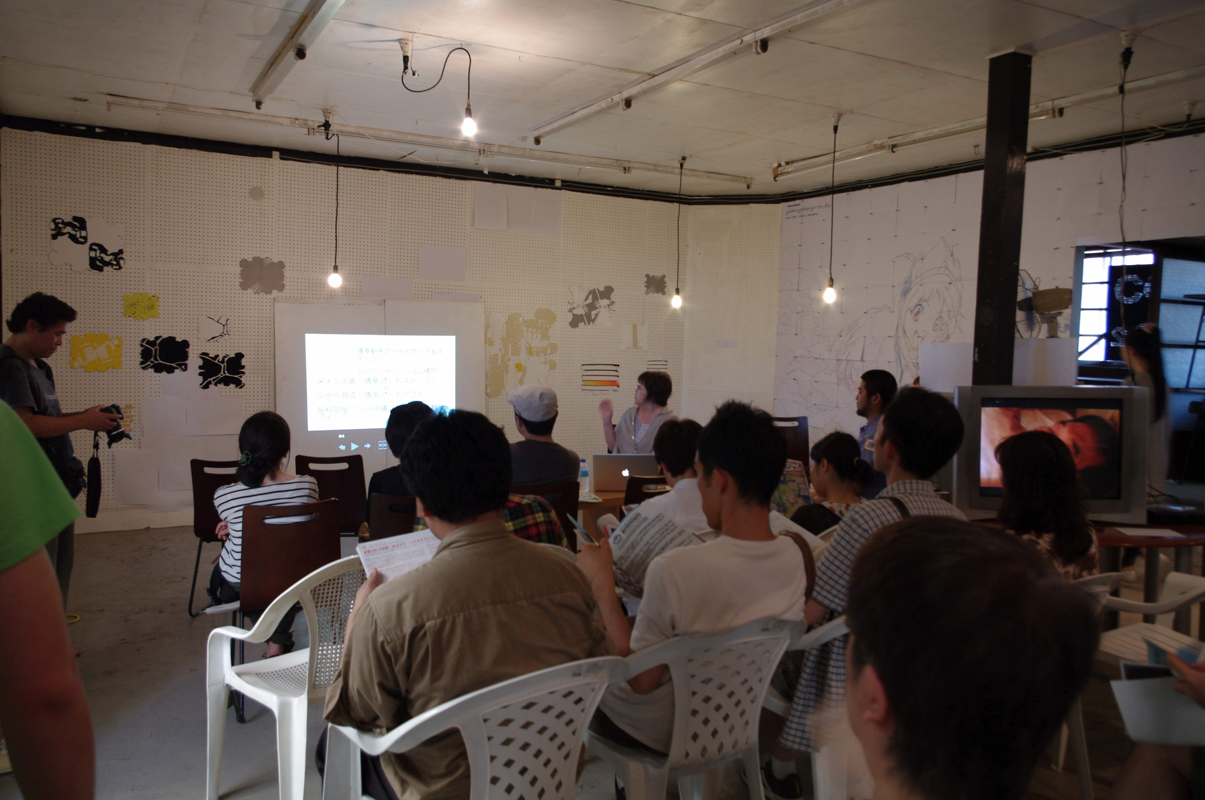 前半では出席者各自が八万湯プロジェクトとの関わり、八万湯を舞台に行ってきたことについて報告、後半では、八万湯の建物が消滅したあと、これからの活動に向けて何が可能か、メンバー各位と八万湯プロジェクトはアートの状況にどう関わってゆくのか、などが語られました。八万湯プロジェクト約20年の活動を振り返ることで、プロジェクトのメンバーが役割分担を固定しなかったこと、各自の作品制作や発表の場として八万湯という場所を利用しただけでなく、展覧会や研究会、イベントの企画をおこない、プロジェクトメンバー以外のゲストを招くなど、八万湯という組織がときには地域を超えたアート状況に介入していたことがわかりました。記録映像をYoutubeにUPしています。撮影と編集は、福岡市在住の映像作家、福田康紀さんによるものです。
