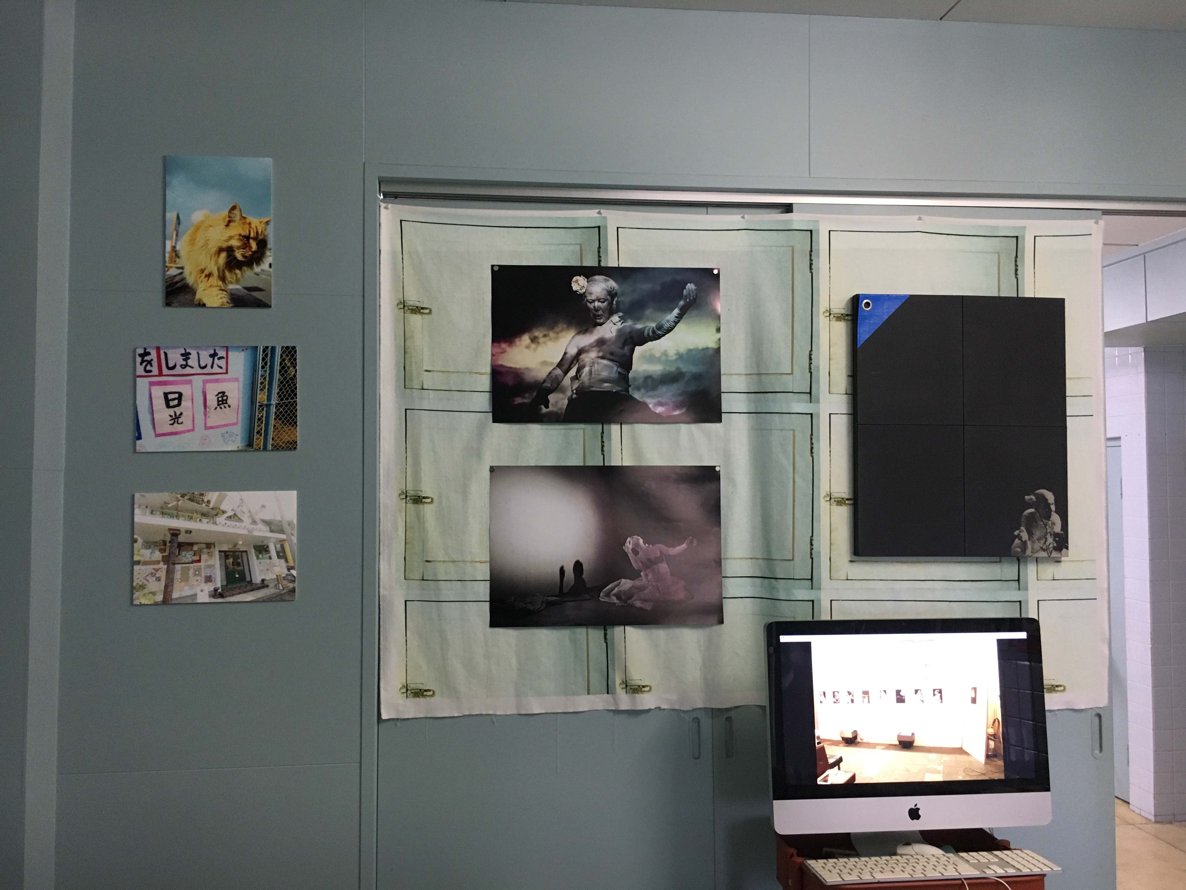 手前のモニターでは森秀信2010年のONE NIGHT SHOWで発表した映像作品、壁面の写真2点は2013年に八万湯企画で開かれた「第3回日本まちあるきフォーラムIN北九州」のプログラムで実施されたエクスカーションのシーン。
