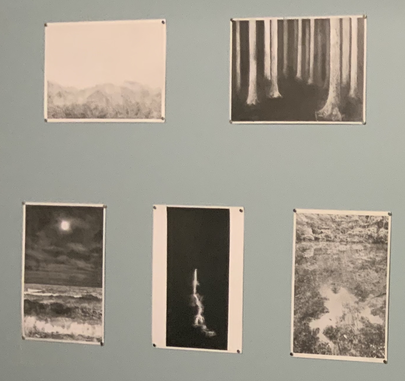 上3枚:「ADIEU HACHIMAN-YU part2」会場、下2点:2009年八万湯での"WATABE YUJI ONE NIGHT SHOW01"展示風景。ほぼ原寸大に描いた森のドローイングを展示し、画面には正面から液晶プロジェクターによる白い光を投射、画面が変わると虹の映像が映し出され、森の絵に重なり、また虹が消え元の画面に戻るという、写実の紙面と映像が重なるインスタレーションを行った。(「八万湯プロジェクト・ドキュメント from ORIGIN to BSS 1996-2012」参照)