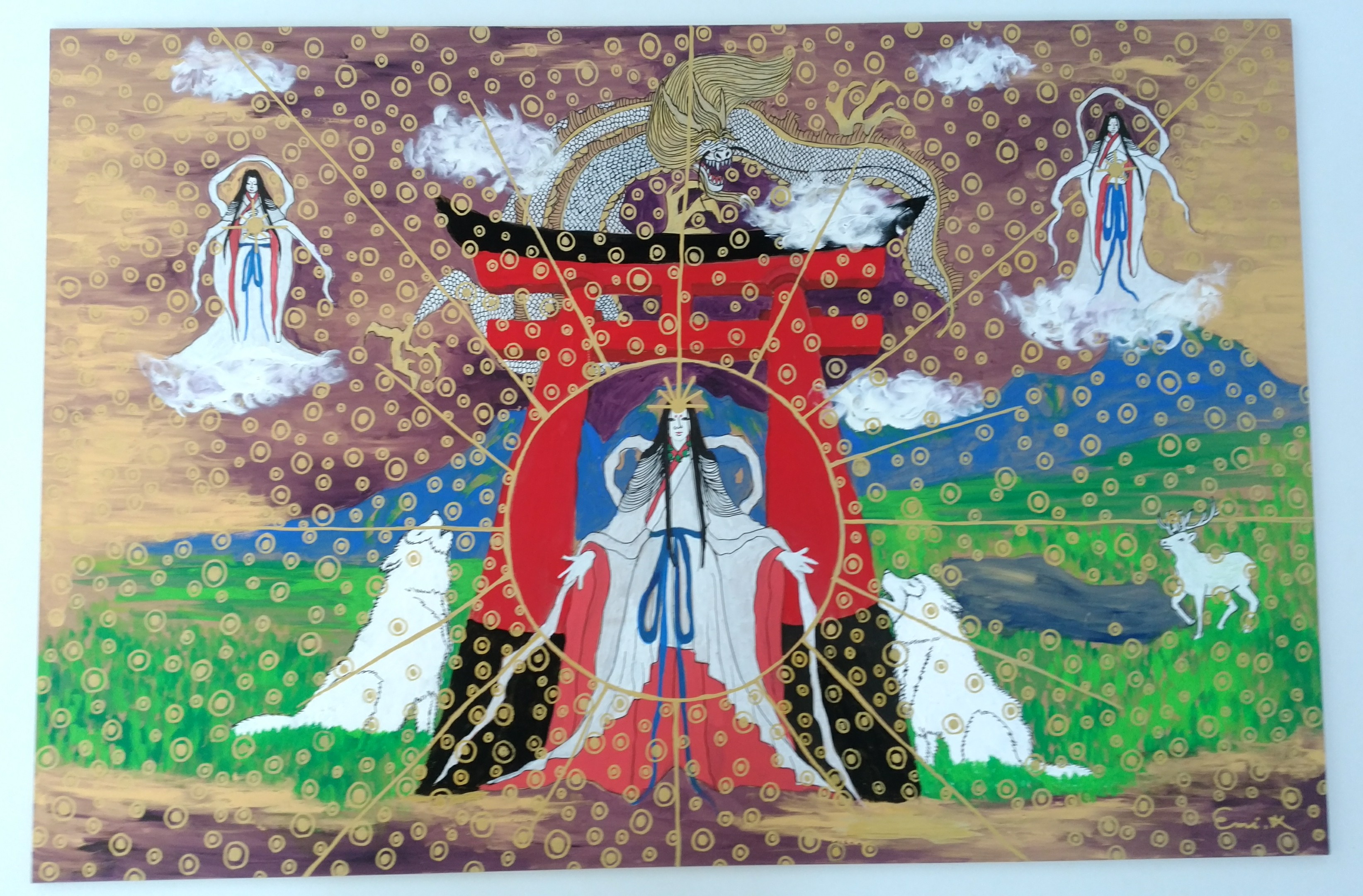 今回の展覧会のきっかけも熊本で起きた別の地震だ。青森市の就労継続支援施設「ほ・だあちゃ」を創作の場とする今恵美子さんは2019年1月、熊本県北の和水町で震度6弱の地震発生のニュースをテレビで見た。「また熊本で」と衝撃を受け、「復興と鎮魂の祈り」(60×90センチ)をアクリル絵の具などで一気に2日で描き上げたという。古代の熊本の風景をイメージし、阿蘇山、卑弥呼のような女神、オオカミ、シカなど白い動物を配置し、思いを画面に詰め込んだ。「熊本に絵を届けたい」との願いは、青森と熊本のアール・ブリュット関係者と交流が深いインディペンデ