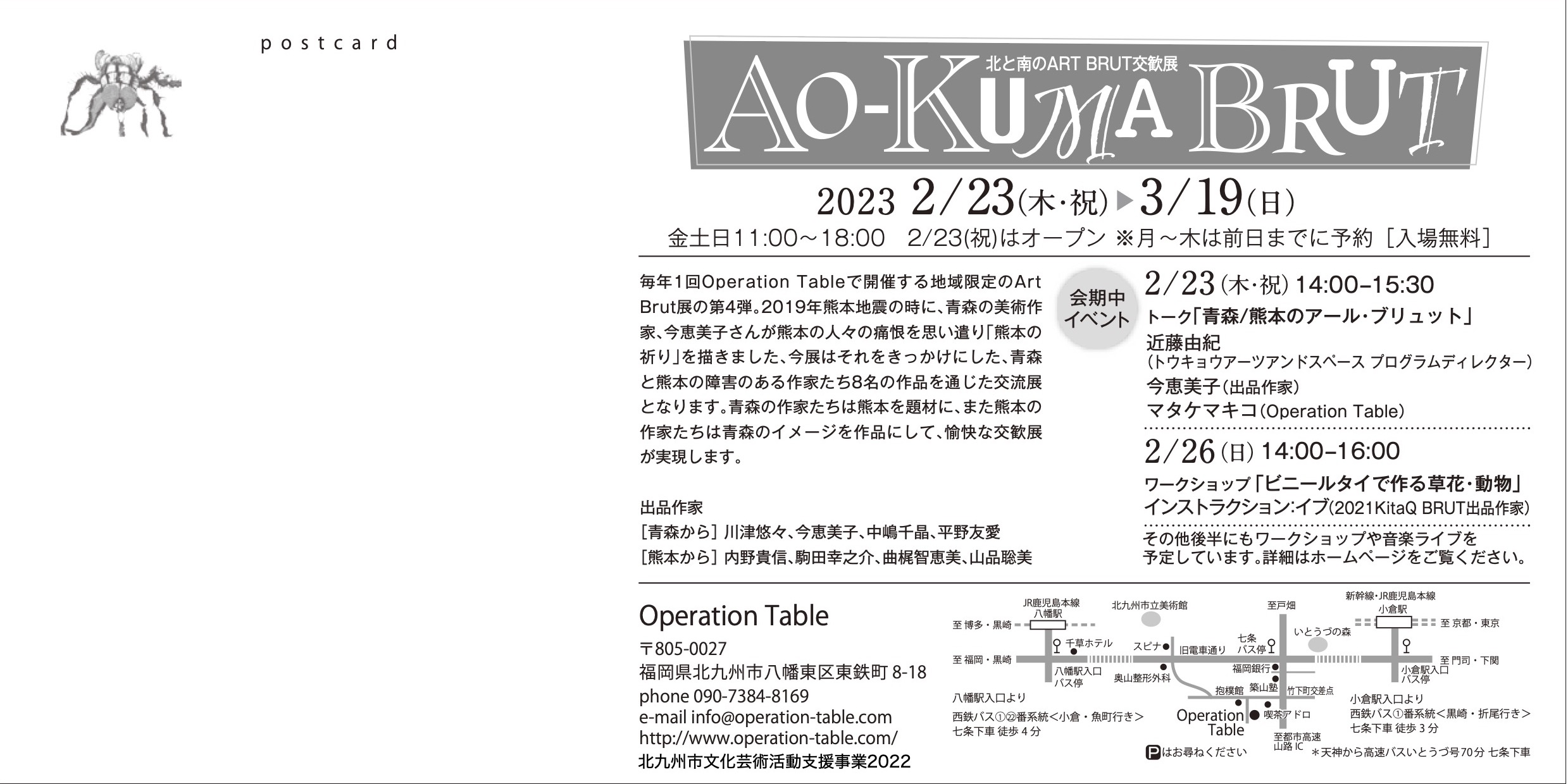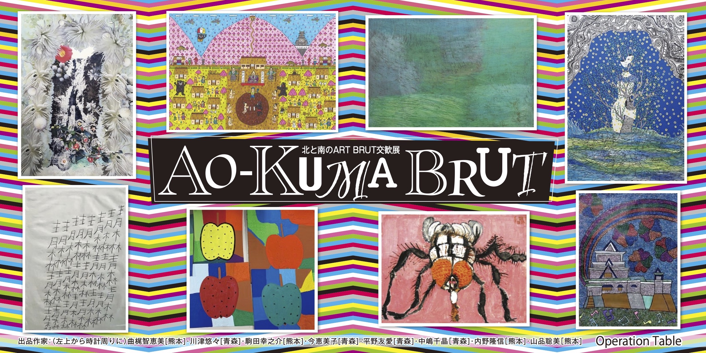 毎年1回Operation Tableで開催する地域限定のArt Brut展の第4弾。今回は2019年熊本地震の時に、青森の美術作家、今恵美子さんが熊本の人々の痛恨を思い遣り「復興と鎮魂の祈り」を描きました、今展はそれをきっかけにした、青森と熊本の障害のある作家たち8名の作品を通じた交流展となります。青森の作家たちは熊本を題材に、熊本城やくまモンを描いてくださいました。また熊本の作家たちは青森のイメージから、ねぶたやホタテの絵、八甲田、恐山、走れメロスなど文字の作品も登場して、愉快な交歓展となりました。