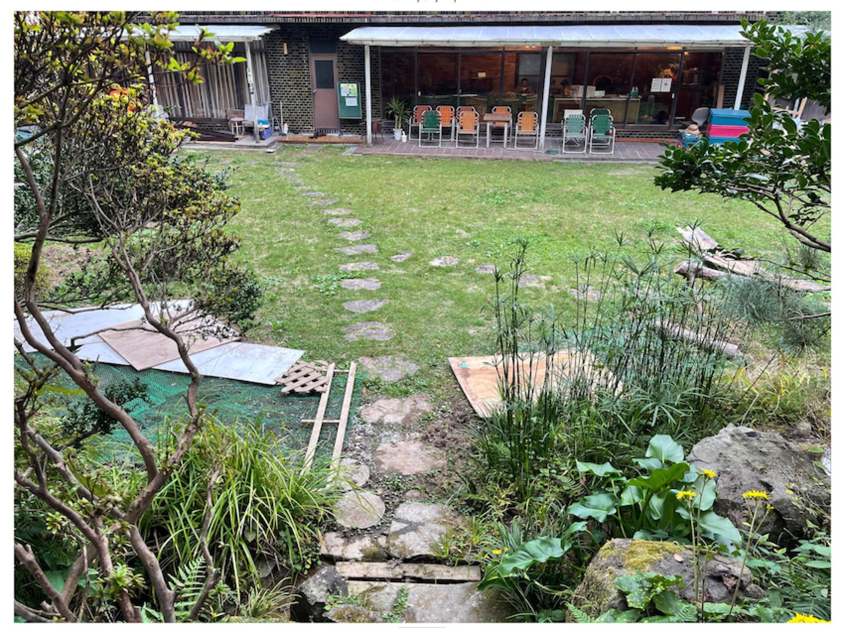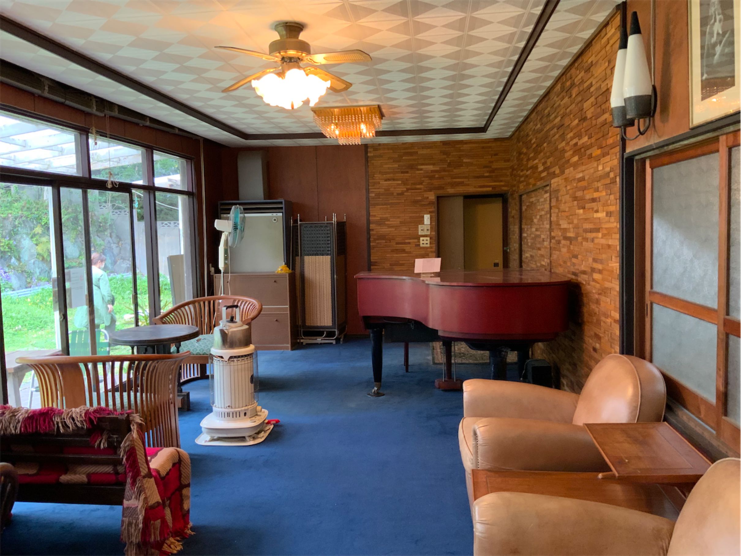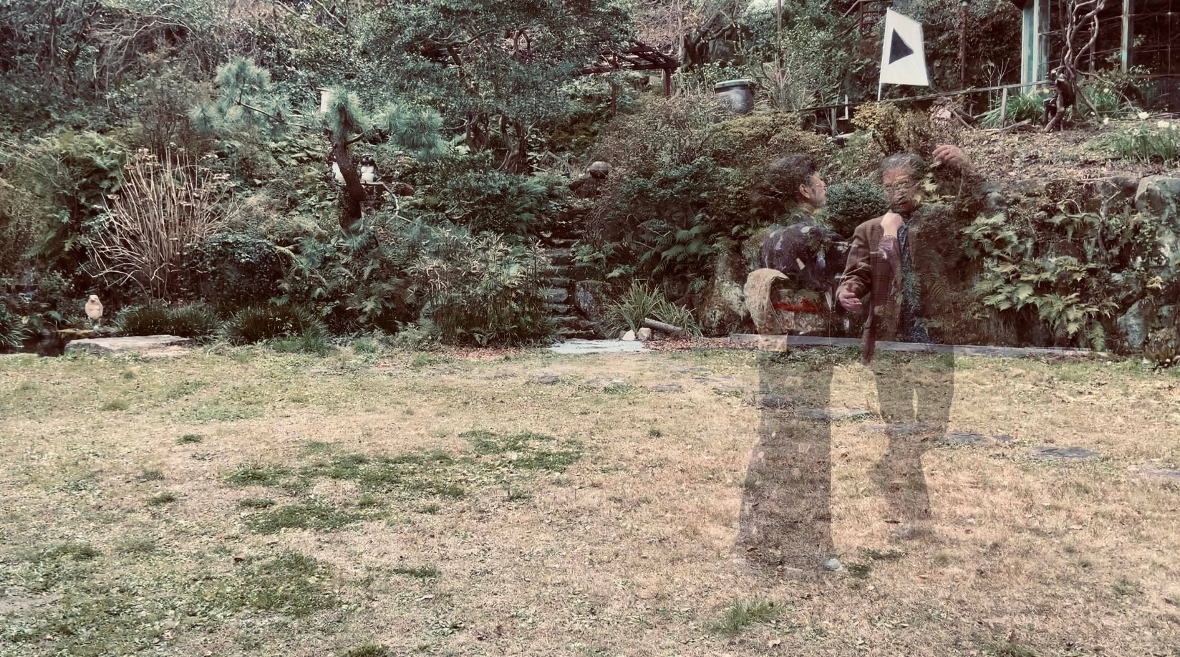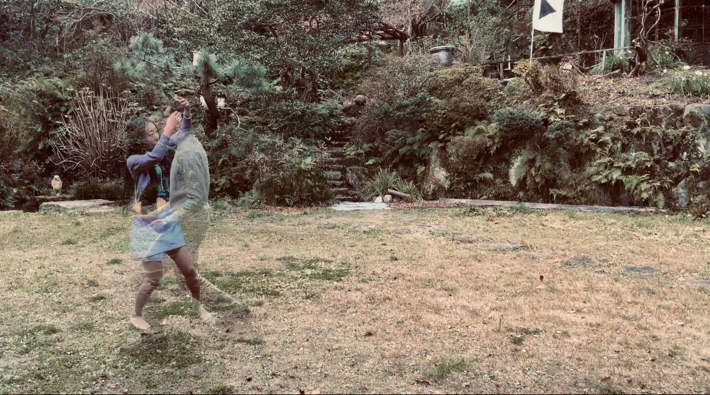 岡田裕子のメインの映像作品《Shall we SOCIAL DISDANCE?》(2022)は、「パンデミックが起こり、蔓延防止対策として社交ダンスが禁止された時代。ひとり孤独に踊るソーシャルディスダンスパーティがベラミで行われていた。」という設定の下、映像制作に参加した男女がベラミ山荘の庭で各自ひとりで踊ったダンスを撮影したものを岡田がコンピューターで合成し、あたかも時空を超えてペアで踊っているかに見える場面も創り出す。ピアノ演奏は多芸多才な時川氏。合成するために人物の身体を半透明にしているため、まるでこのベラミ山荘でかつて暮らした昭和の亡霊たちが蘇り、ダンスに興じているかのようにも見えるのは、作者の意図したことか。コロナ禍の接触禁止Social distanceをSocial danseに絡めた、岡田らしいウィットに富んだ参加型アートであった。