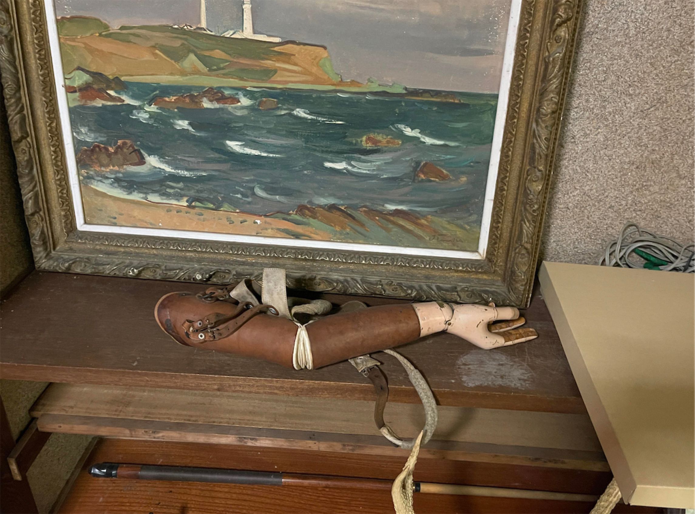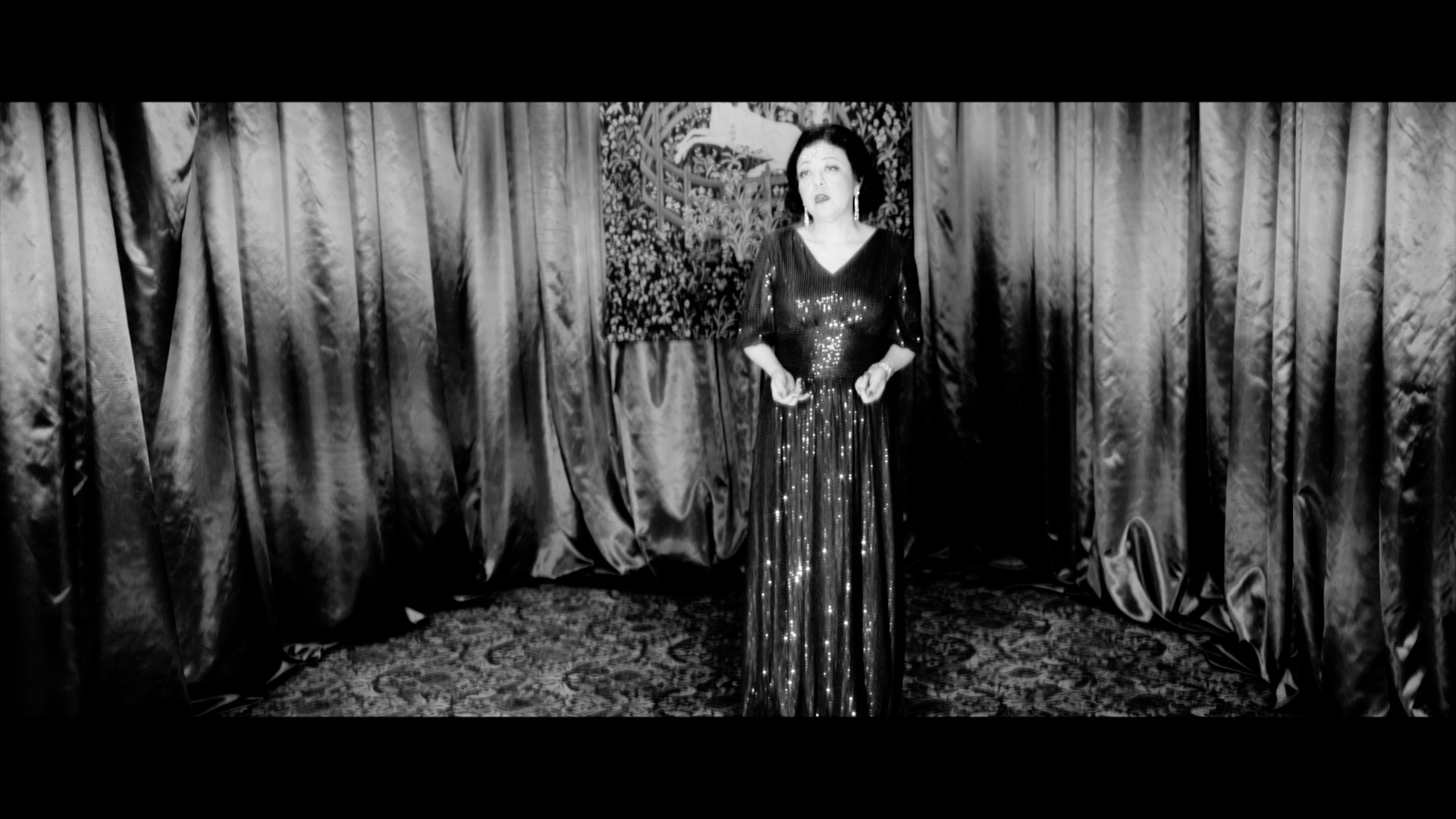 三田村光土里の《CRY ME A RIVER》(2022)は、三田村自身が主演・監督も兼ねる映像ファンタジー。1955年にジュリー・ロンドンが歌って大ヒットしたスタンダード・ナンバー「CRY ME A RIVER」に乗せて、バーで一人飲む女性がワインを飲み過ぎて帰り際に庭で転倒し、額に傷を負うというショート・ストーリーだが、締めには彼女自身が歌手としてライトを浴びてこの歌を歌っており、彼女の額の傷はダイアモンドを散りばめたように光り輝く。これは昨年の三田村の実体験から構想されたそうだが、その心身の「傷」がかくもノスタルジックで陰影に富んだイメージの映像作品に変貌したことに驚嘆する。女性ははじめ客に見えるが、最後には歌手として歌い上げる。その役割の転換がシュールな雰囲気を醸し出す。ベラミ山荘に入居する映像制作チーム Hoshisora Film や、Cinema Book & Music 時川座を構える時川秀希氏(バーテンダーとして出演)などの絶妙な協力を得て完成したという。ベラミ山荘の一角に、大きいスクリーンでの映像上映と、使用した衣装や小道具、一角獣のタピスリによるインスタレーションも設られ、女性歌手の豪華な楽屋のようでもある。