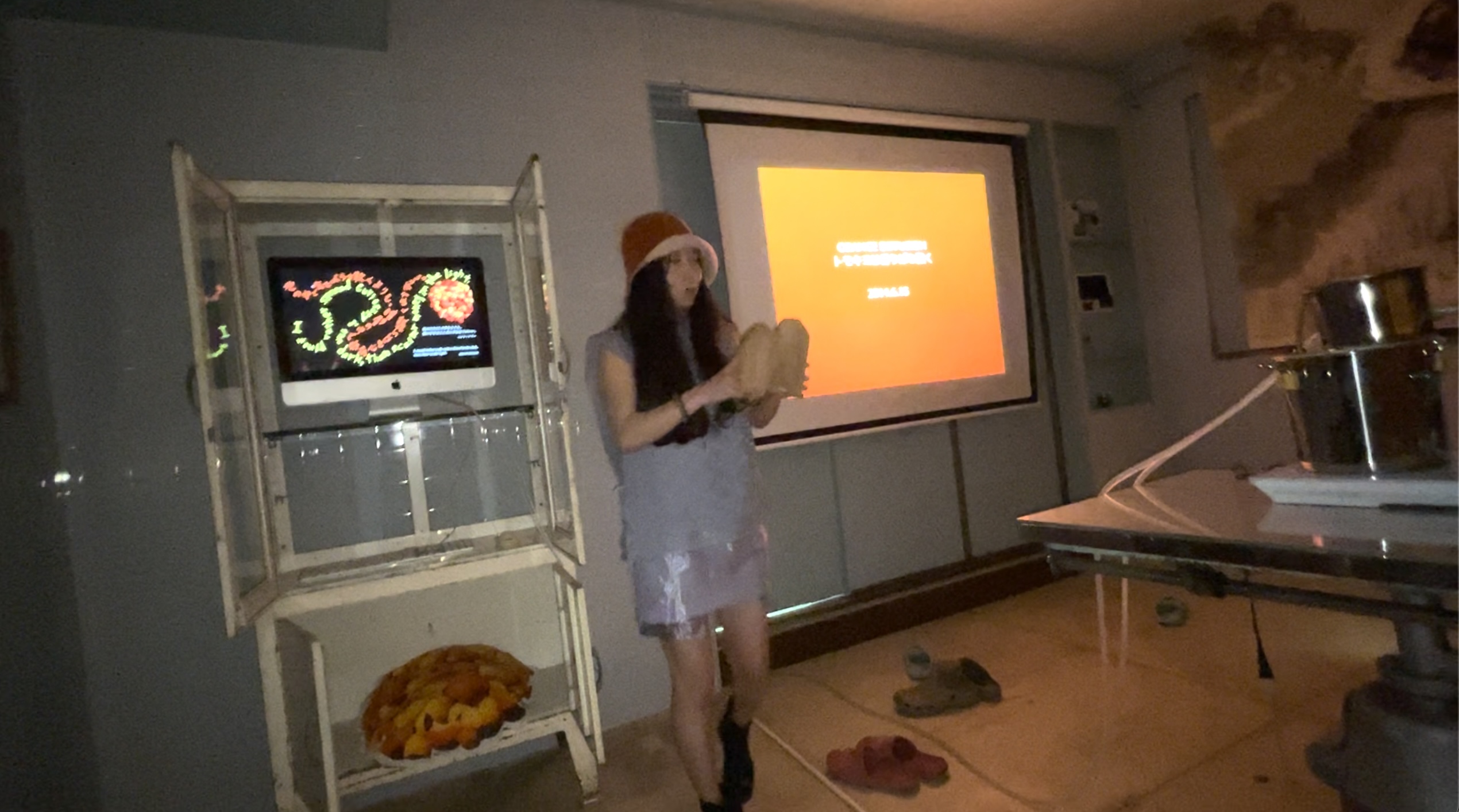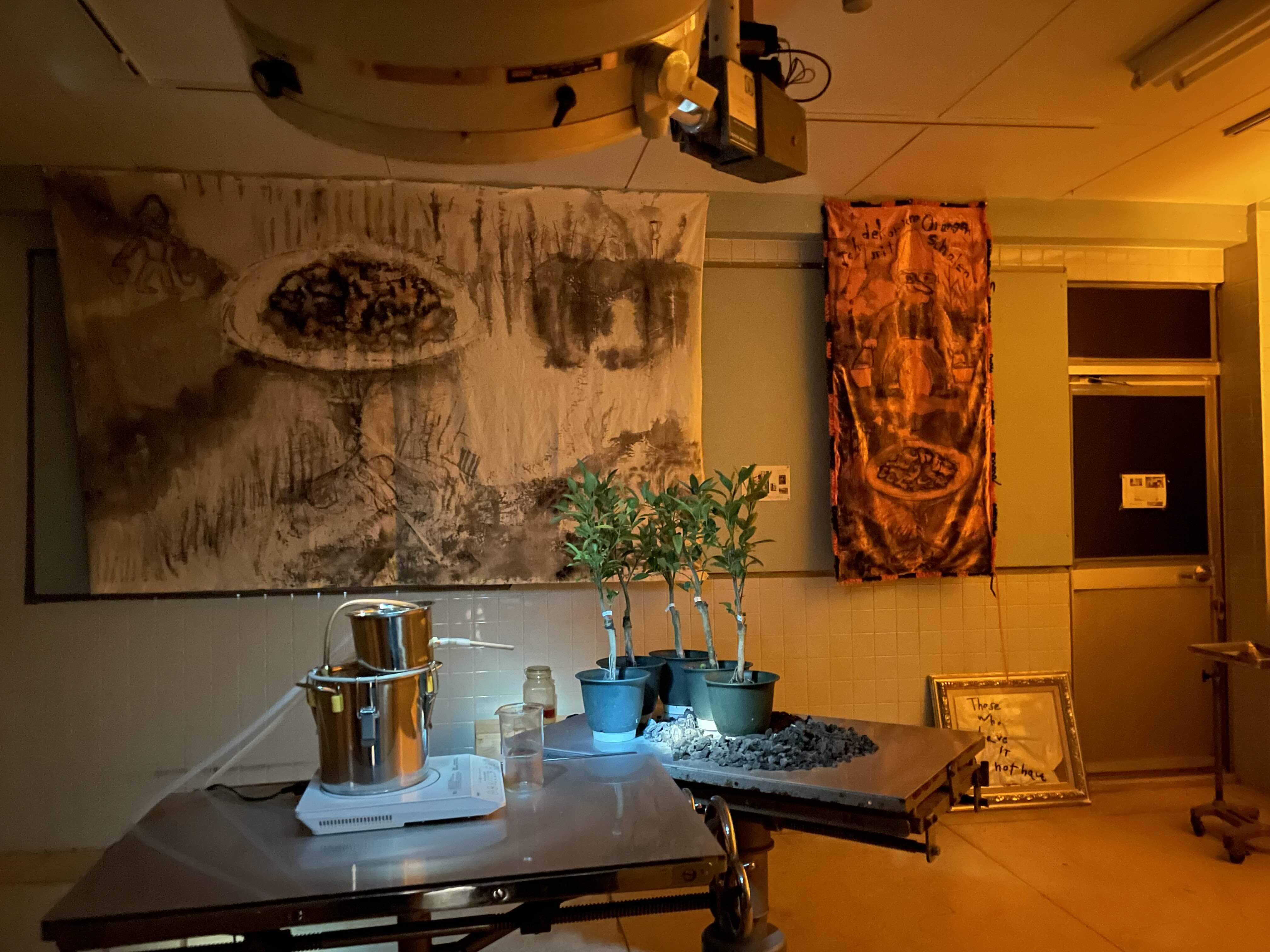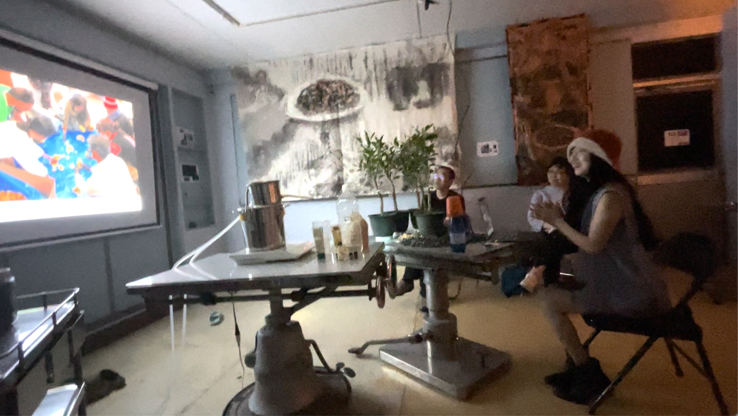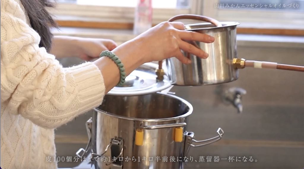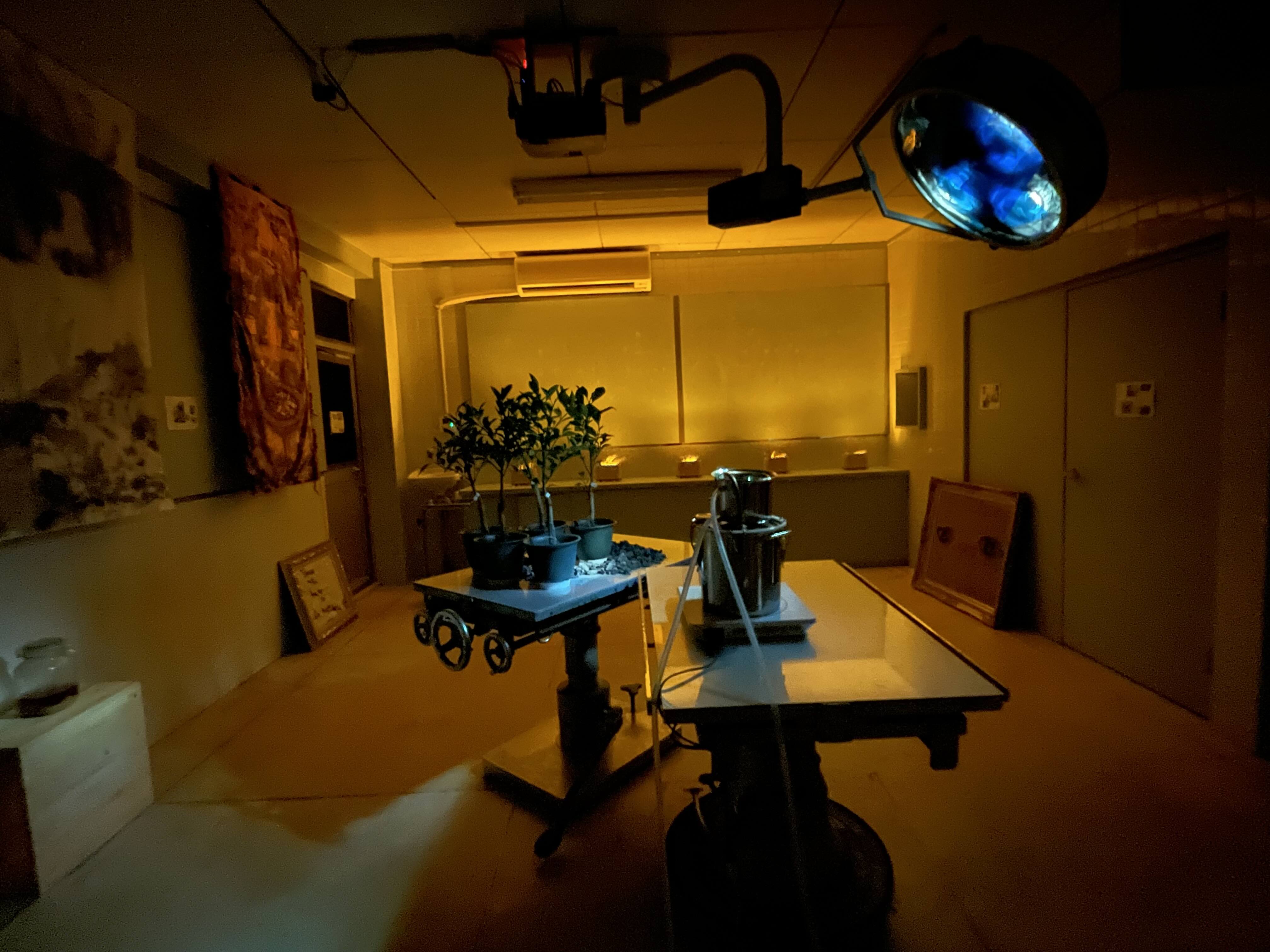 友清ちさとは10 月中旬より旧上庄レジデンスプログラムに参加し、のべ3ヶ月福岡県みやま市で、スタジオとなる廃校の校庭を拠点とし、地域の方を招いた焚き火会、特産品の山川みかんの皮を使ったアロマを蒸留をした。人口減少が進む地域で、高齢の方や精神的な病や困などをきっかけに訪問看護を利用している皆さんを含めた近隣住民が部分的に関わっている。立ちあらわれた地域の人々の想いや交流、波紋のような目に見えにくいものを映像に留めようとした。精油作りと焚き火開催の二つの活動は看護師さんとの対話と一人の利用者さんの絵から生まれた“希望の樹”というキーワードで交わり、焚き火の灰や炭、アロマ精製で残った柑橘の皮のごみを堆肥にし、みかんの木を育てられないかという想いに繋がっていく。作品はこの活動の過程を成果展に合わせ記録したのもの。
