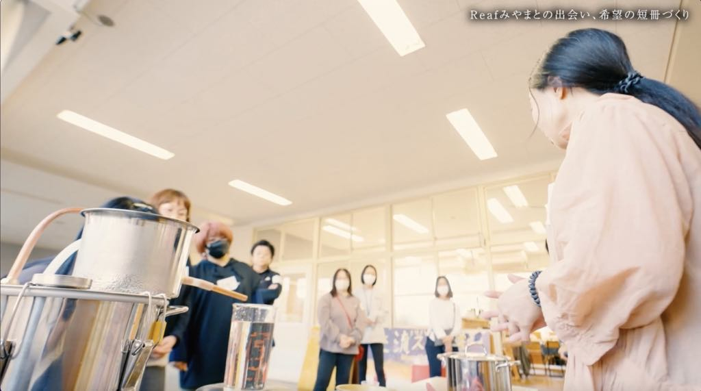 訪問型看護施設Reafみやま出張所の皆さんとの関わりでは、蒸留所見学を経て、アロマ精製をしながら精神療法WRAPにちなみ短冊に”希望”について書く。ここで言う希望とは、ハマるものや生きがい、元気が出るもの、自分を後押ししてくれるもの。看護師さん自身もハマるものを自身のケアに役立てそれがケアの質を上げると語ってくれた。一人の利用者の絵を原画に壁画を皆で描く。一方で連日行う焚き火では火を見つめたり、食べたり、時にはオープンダイアローグをし、高齢の方も含めながら人口減少したこの地域の課題や孤独などについてそれぞれの思いを語った。参加者から後に持ち込みコンサートの依頼が来るなどして、制作をサポートしてくれる地域の高齢の方などのハマるものや生きがいも聞き、ケアの連鎖に想いを馳せた。