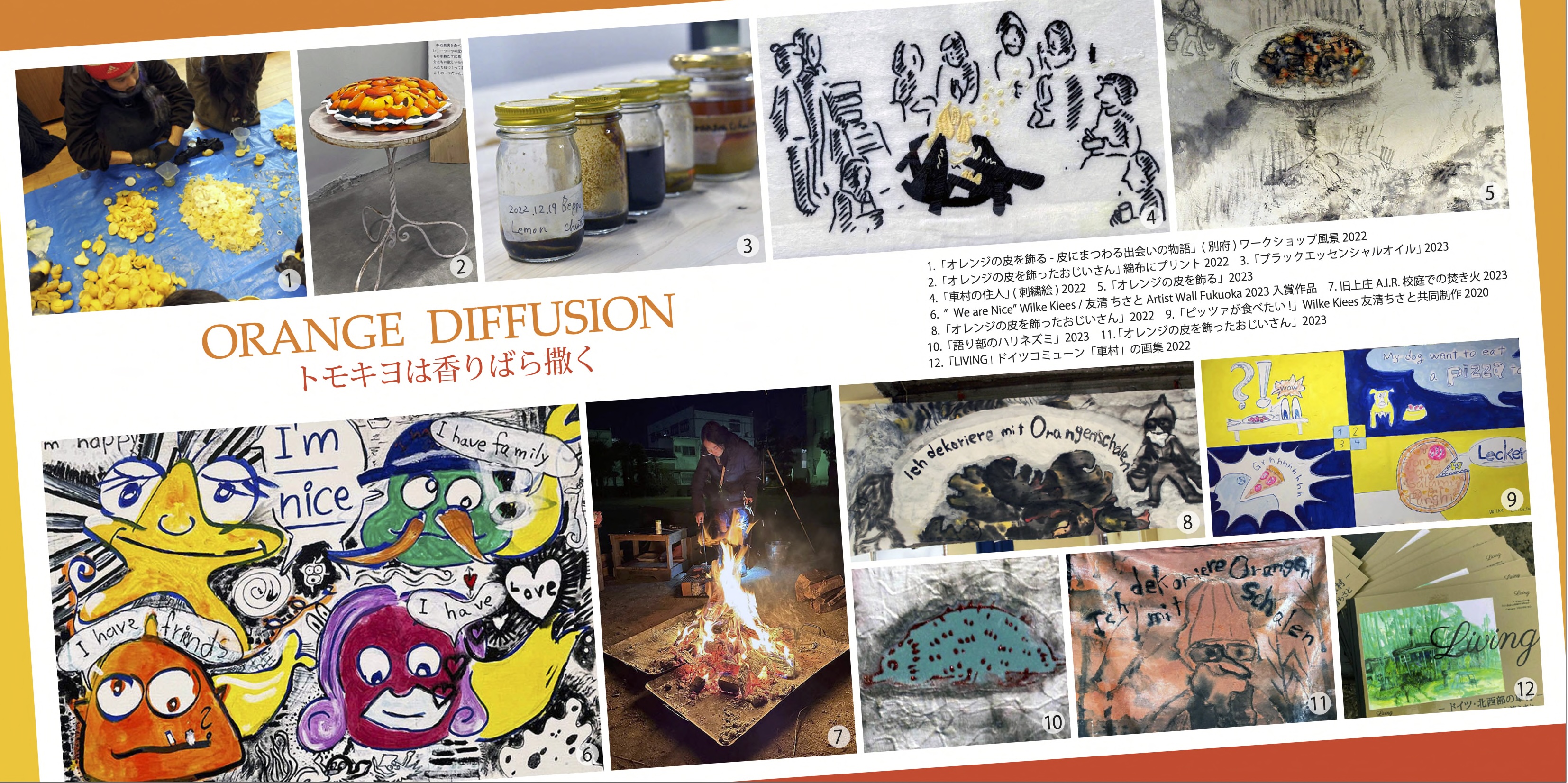 オレンジや柑橘という素材はある種、媒介となって、皮を集めるという行為をとおして人々と交歓し意思を伝達し合うという密かなねらいに繋がります。今回の展覧会でも、来場者や地域の人々との対話を通じて、これまでのオレンジ+柑橘にまつわる話題が他の領域へとさらに拡散する機会となるでしょう。抱樸館はOperation Tableの超近隣施設ですが、その入所の方々と交流したり共同制作に挑む計画もあります。また2023年まで滞在していたドイツでは地域の人々との共同制作として壁画を発表しましたが、当地にも現存しないその再制作(公開)も構想中です。
