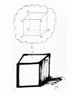 ダントは友人の漫画家、ソール・スタインバーグ 【Saul Steinberg 1914-99】 のドローイングを持ちだす。ありふれた箱が、完璧なエッヂと角を持つ幾何学的なキューブを夢見ている作品である。それはまさにウォーホルの夢であった。ダンボールではなく、木製のボックスを制作しようとした決断したときのウォーホルの幾何学に対する夢である。
