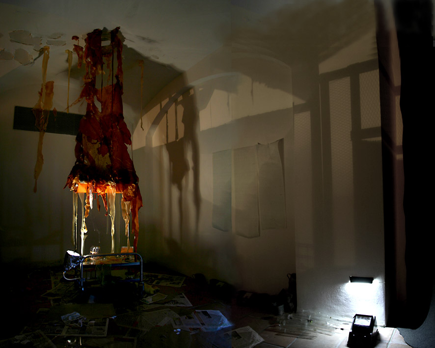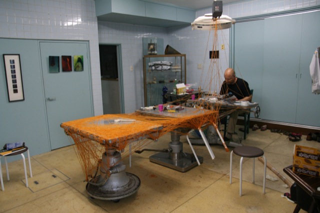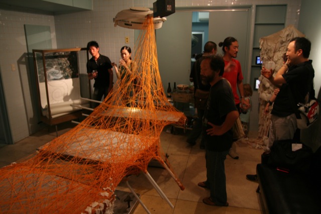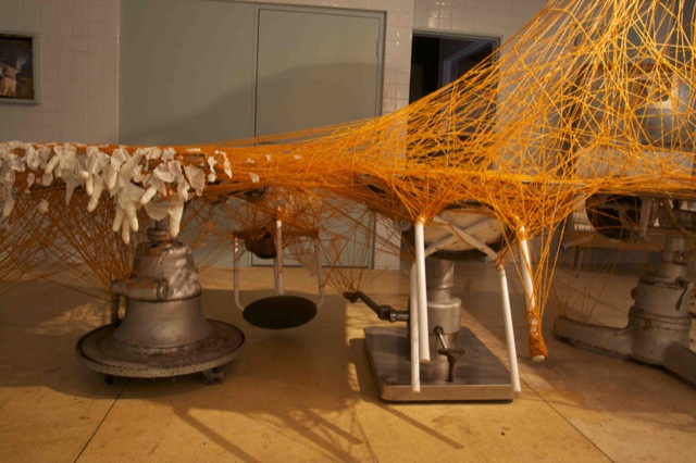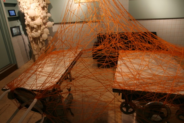 幾重にも重なり連なり結ばれ、皮膚のようなゴムの外膜を引きちぎり、突き破って増殖し続ける。強い力で重たい手術台やイスだけではなく観客さえも巻き取り、引き寄せる絶対的な存在でありながら、出来の悪い放蕩息子のように、あてのない欲望を持てあましているようにも見える。