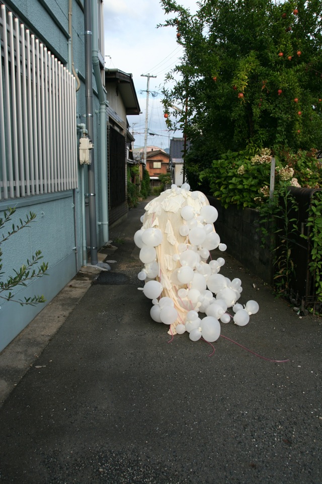 In the course of an hour an amorphous white substance ? an unknown species resembling a giant amoeba ? will creep along the balustrade which surrounds the ground floor studio at Chiyufku. This entity lives off the tiny particles of Sake which have been left from the production of the former factory.