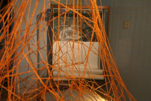 そんなオブジェを産みだしたのは、作家自身を飲み込むような一部屋ほどのuterus(子宮)であり、彼女はその中で、持ち前のユーモアと論理性をかぎ針としてし巣喰う虫のようにゴムを編み上げたのだ。内部でありながら外部である彼女の肉体を含め、二重三重の入れ子のuterusを通じて、逃れようとするもの、生まれようとするものと留まろうとするものの拮抗を感じたのは、僕がその身に内部を宿すことのない男性だからなのだろうか。僕は、行為そのものの代償としての産物、行く当てのないその生き物に奇妙な親近感を持った。