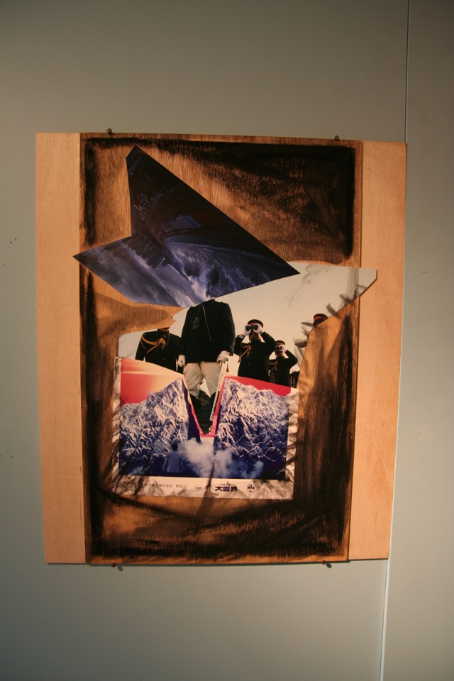 壁に貼られた作品は、あたかも地図。 その座標には、スチール写真の中のスクリーン、幾重にも重なる映画の物語が転々と描かれている。コラージュとは、異なったイメージを寄せ集めてさらなる意味を加えるものだと思っていたが。彼は、意味を重ねるどころか、人形のように手足をもいで裸にしてしまう。その意味さえ留める必要がないとうち捨てて、 無邪気な子どものように 遊び続けている(そうだこれは、終わらない旅なのだ・・・)。