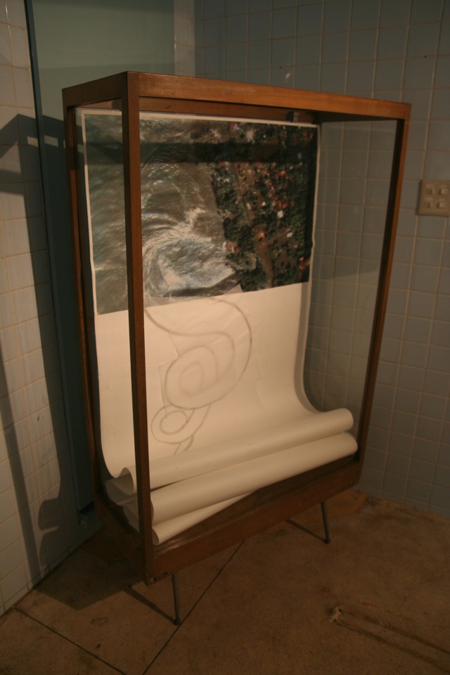 エッガーはパフォーマンスが主要な表現手段ですが、ゴム素材が空間内に蔓延り、手術台と呼応する驚異的なインスタレーションを制作しました。アイトナーは時代物の映画ポスターや新聞の写真を使ったコラージュ・ドローイングによって、一見かけ離れたイメージの共存を新しい意味に転化させます。これまで2名が同じ空間で作品を発表することはほとんどなく、作品の傾向も全く異なるものでしたが、Operation Tableの空間ではみごとに共鳴していました。エッガーの輪ゴムをつないで手術台を取り囲んで出来上がったインスタレーションは、床の排水口から侵入した奇妙なモンスター、一方、日本の印象をもっぱら3.11の自然災害と原発事故の重大さで捉えるアイトナーのコラージュにもいたるところに、自然の脅威と人間の仕業から産み出された怪物が潜んでいました。