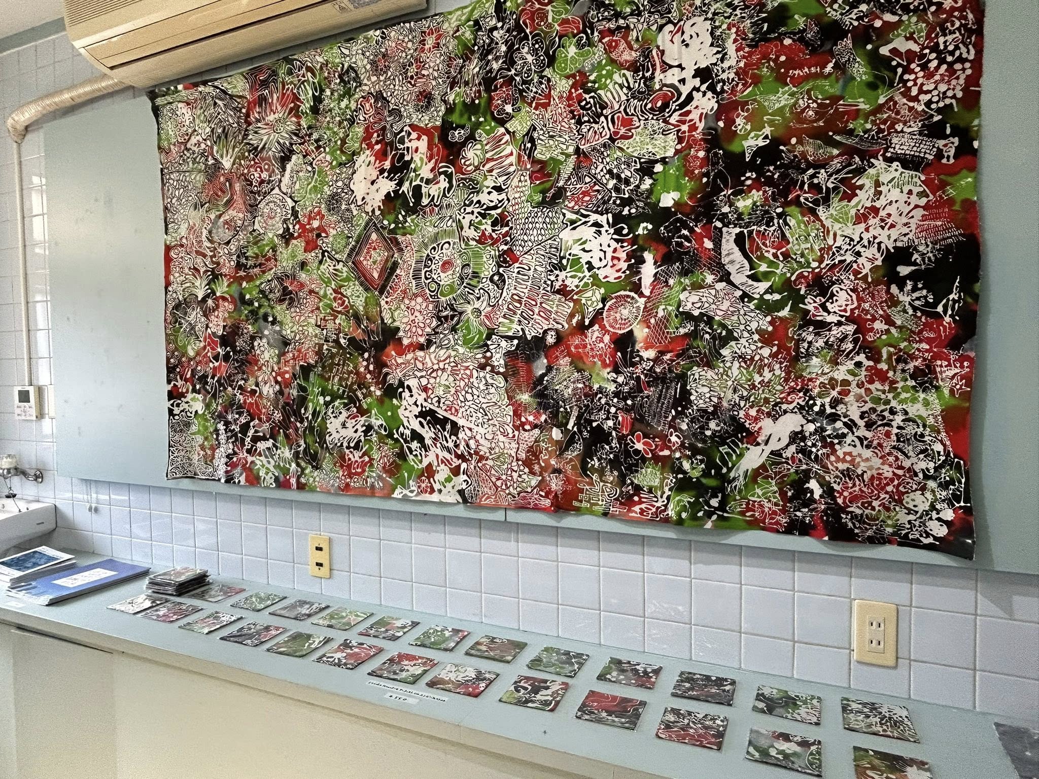 Much to our surprise, immediately after returning to her home in Indonesia following that summer stay, she launched her first solo exhibition in Indonesia, titled “OVER AND ACROSS.” This exhibition took over a large-scale venue, where the first floor showcased Tanaka’s works (including pieces previously exhibited at Gallery SOAP), while the second floor served as an interactive, collaborative space. There, visitors could join in the creative process by applying wax to large cloths spread across tables using canting (a traditional batik tool).