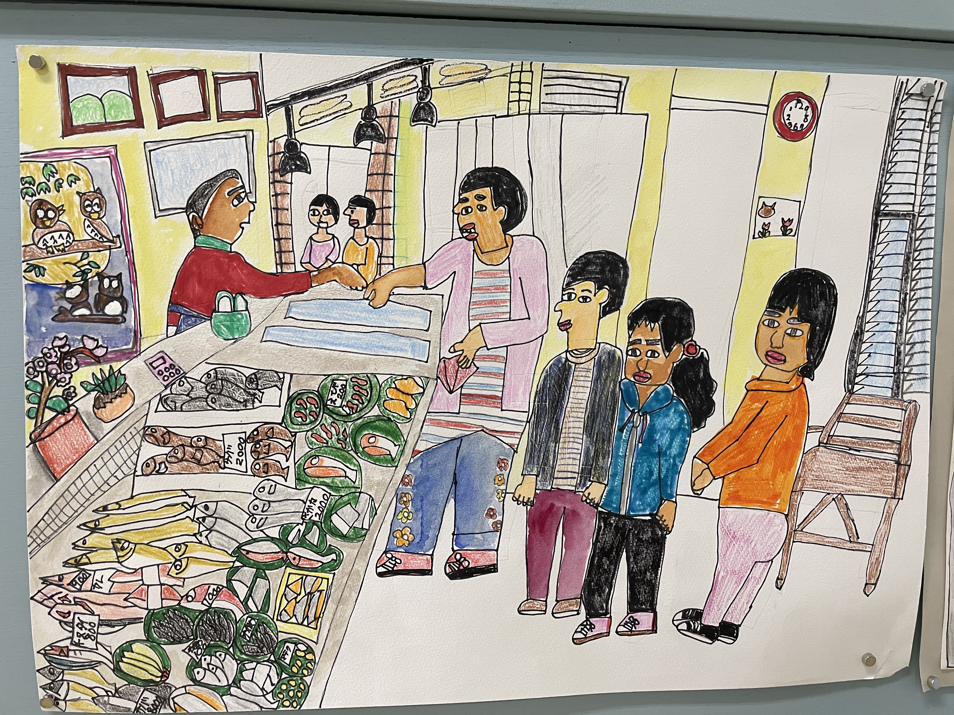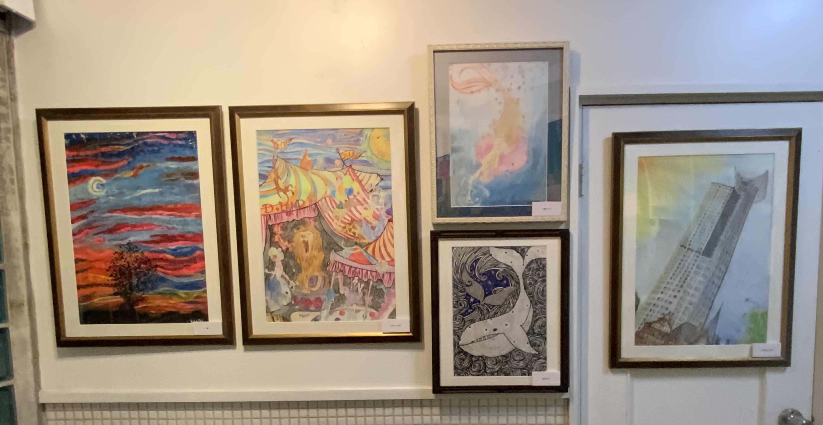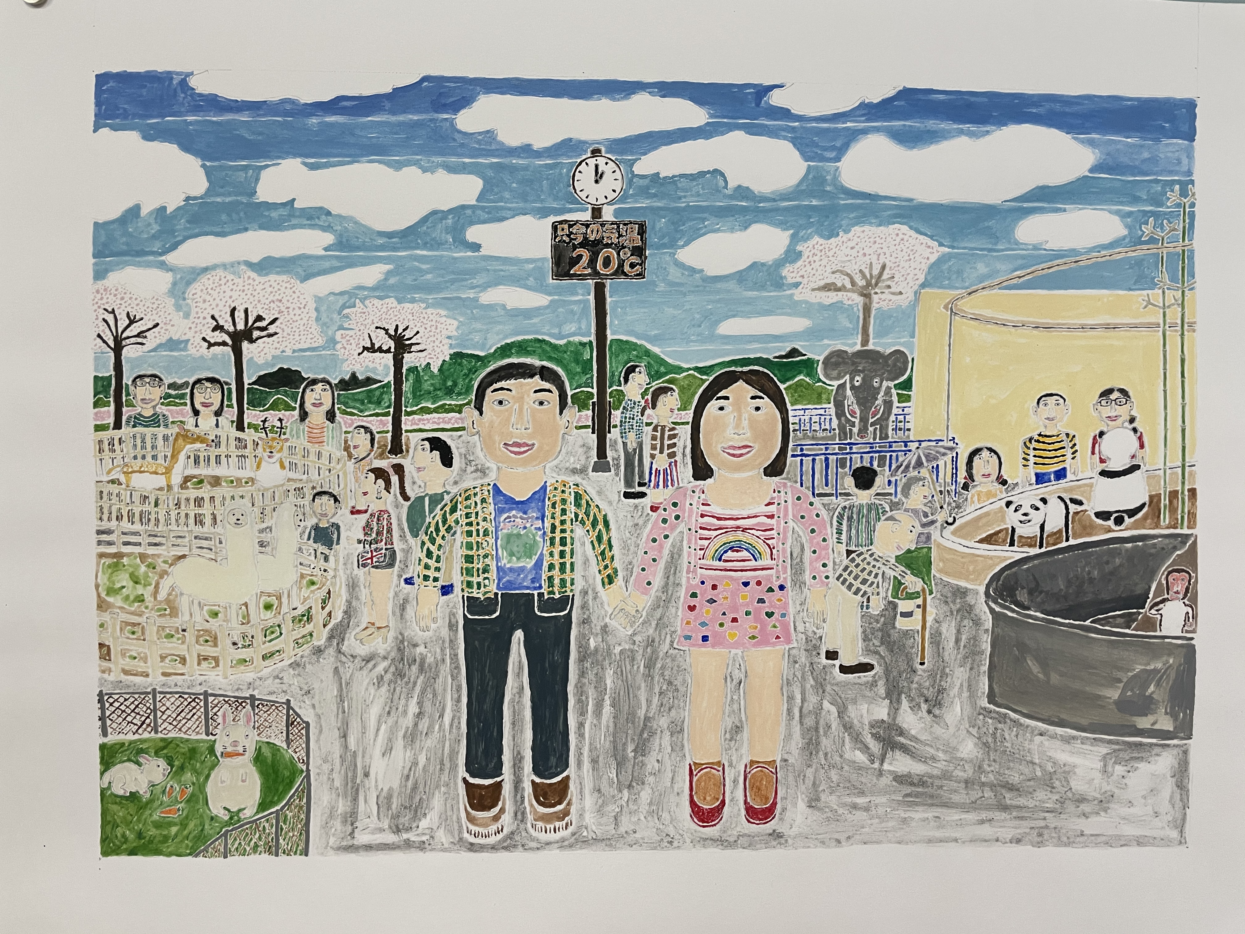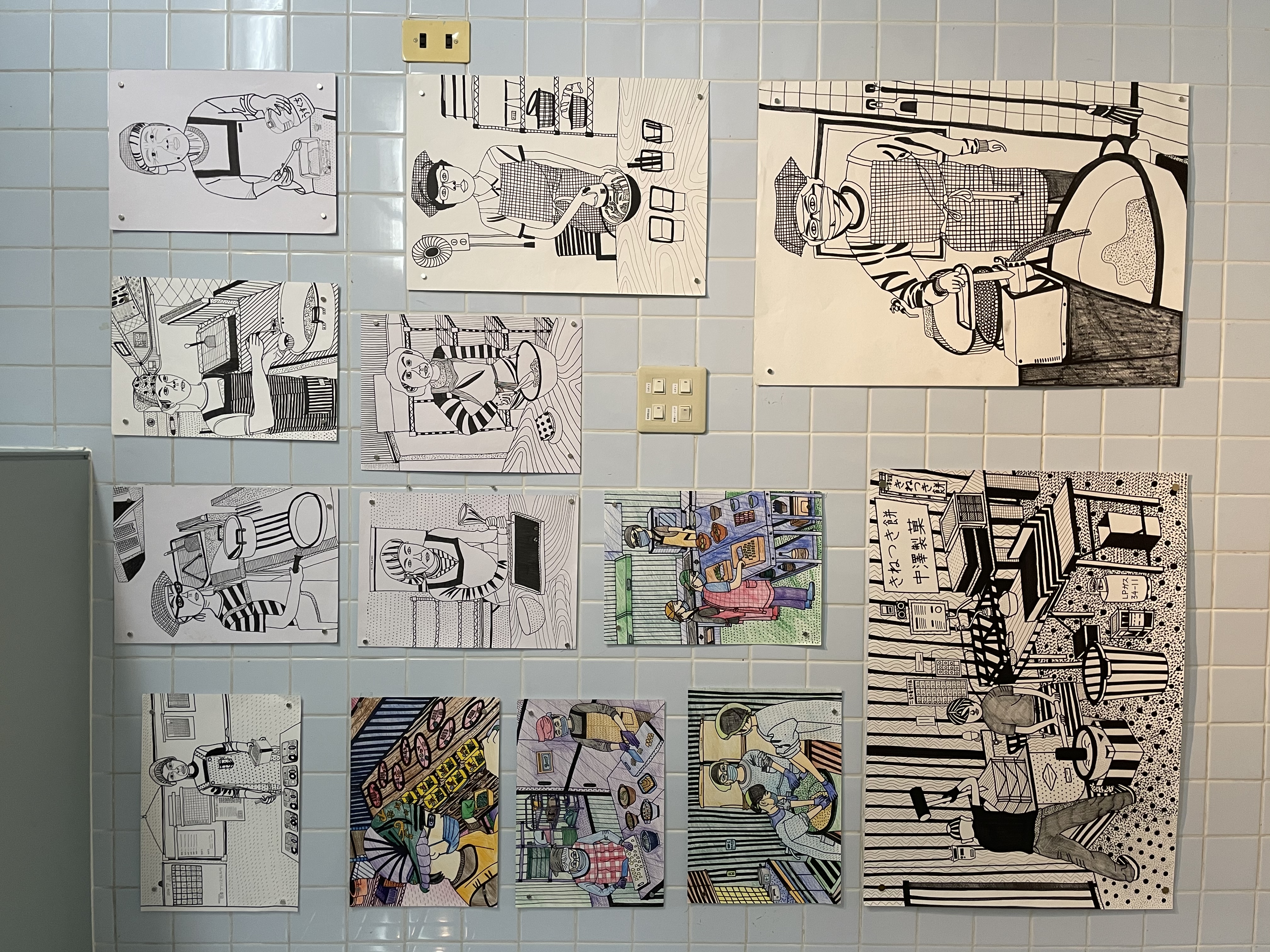My夢という八幡西区本城の施設に所属して活動している斎藤龍樹。斎藤は電車が大好きで、線路や高架橋、電線などがある風景画もおもしろいし、動物や植物の絵も得意なのだが、今回は厨房で働く人々の描写がユニークなシリーズになっているので、それだけを集めてみた。料理するひとたちの姿、美味しいものができあがりそうな情景が生き生きと描かれている。斎藤さんは写真が趣味のお父様と二人で展覧会をすることも多く、その機会にはおやこコンサートを開かれるとお聞きした。この展覧会期中にもぜひ、とおねがいして2022年1月16日(日)に、お父様のオカリナ演奏で龍樹さんが歌うコンサートが実現した。