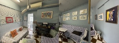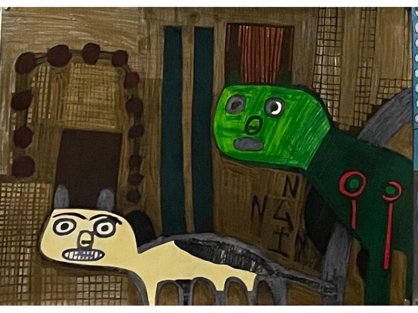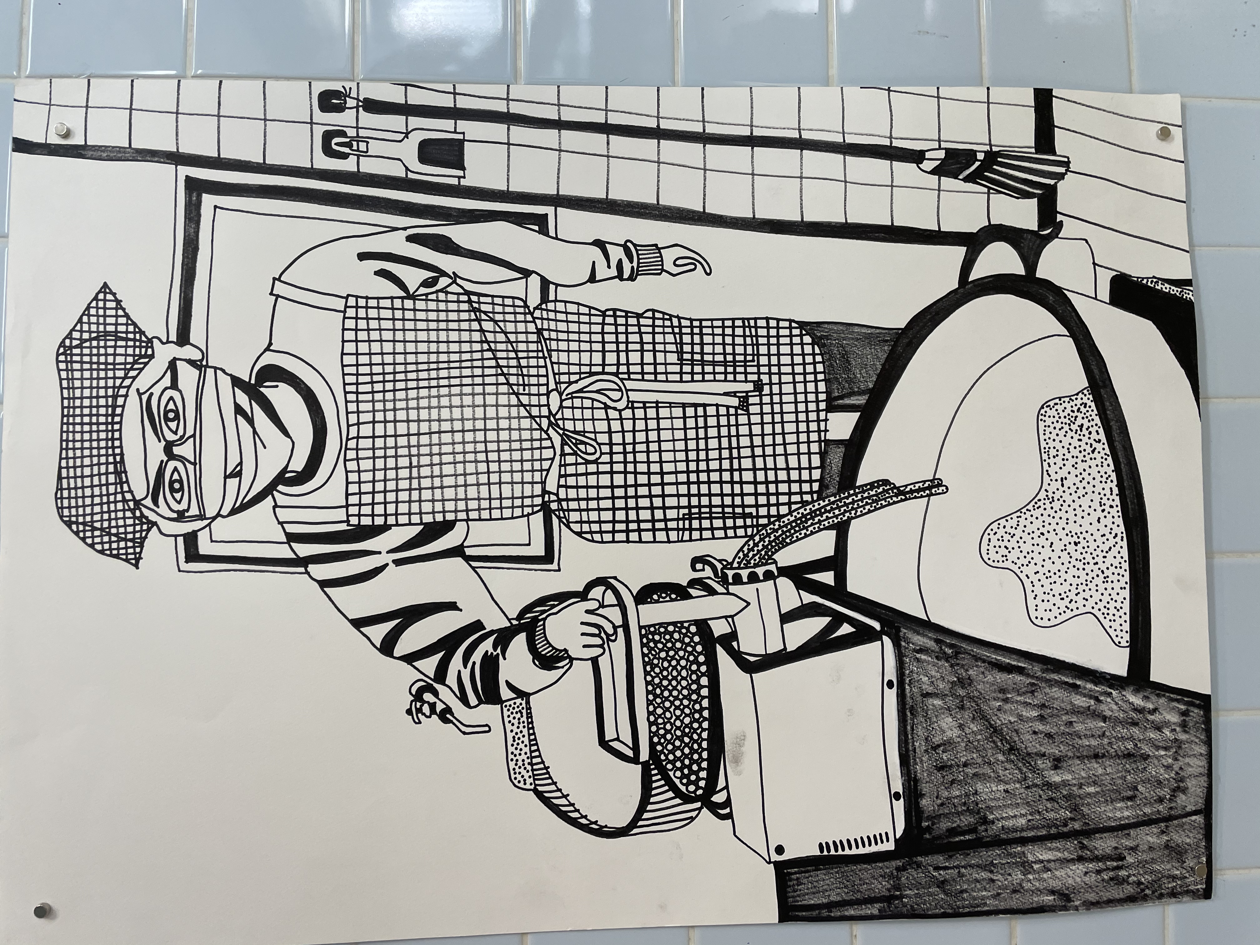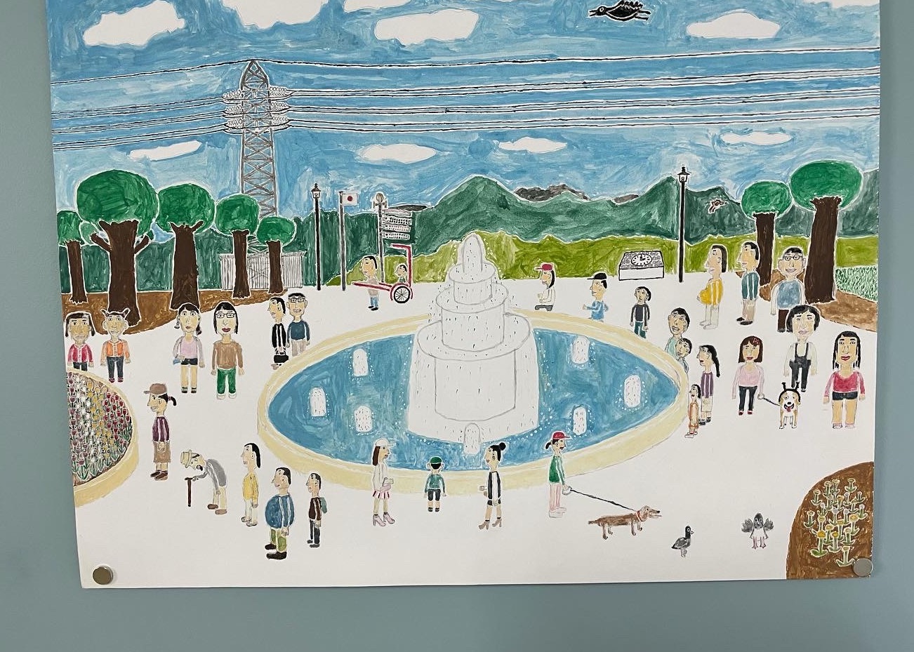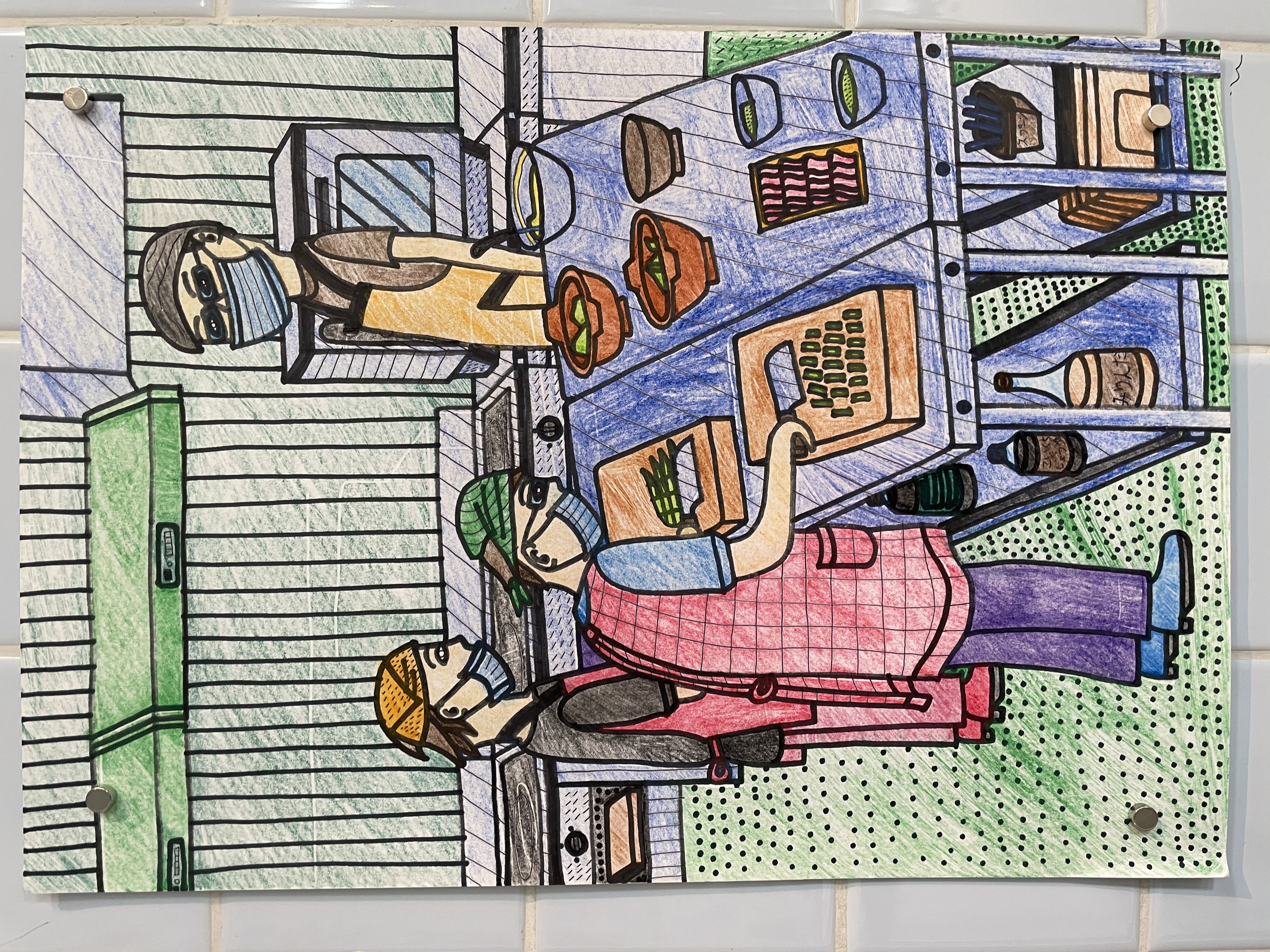 My夢という八幡西区本城の施設に所属して活動している斎藤龍樹。斎藤は電車が大好きで、線路や高架橋、電線などがある風景画もおもしろいし、動物や植物の絵も得意なのだが、今回は厨房で働く人々の描写がユニークなシリーズになっているので、それだけを集めてみた。料理するひとたちの姿、美味しいものができあがりそうな情景が生き生きと描かれている。斎藤さんは写真が趣味のお父様と二人で展覧会をすることも多く、その機会にはおやこコンサートを開かれるとお聞きした。この展覧会期中にもぜひ、とおねがいして2022年1月16日(日)に、お父様のオカリナ演奏で龍樹さんが歌うコンサートが実現した。