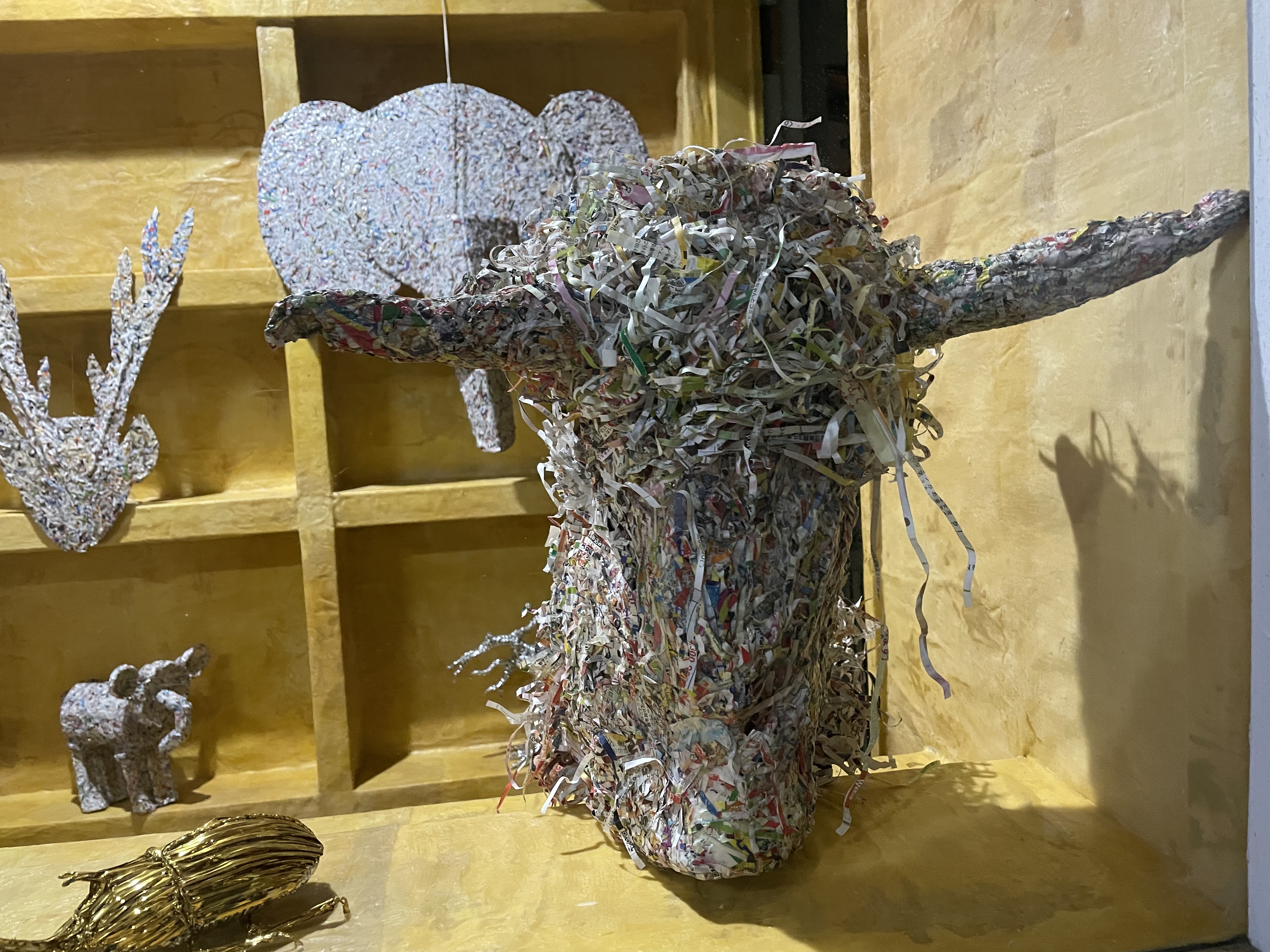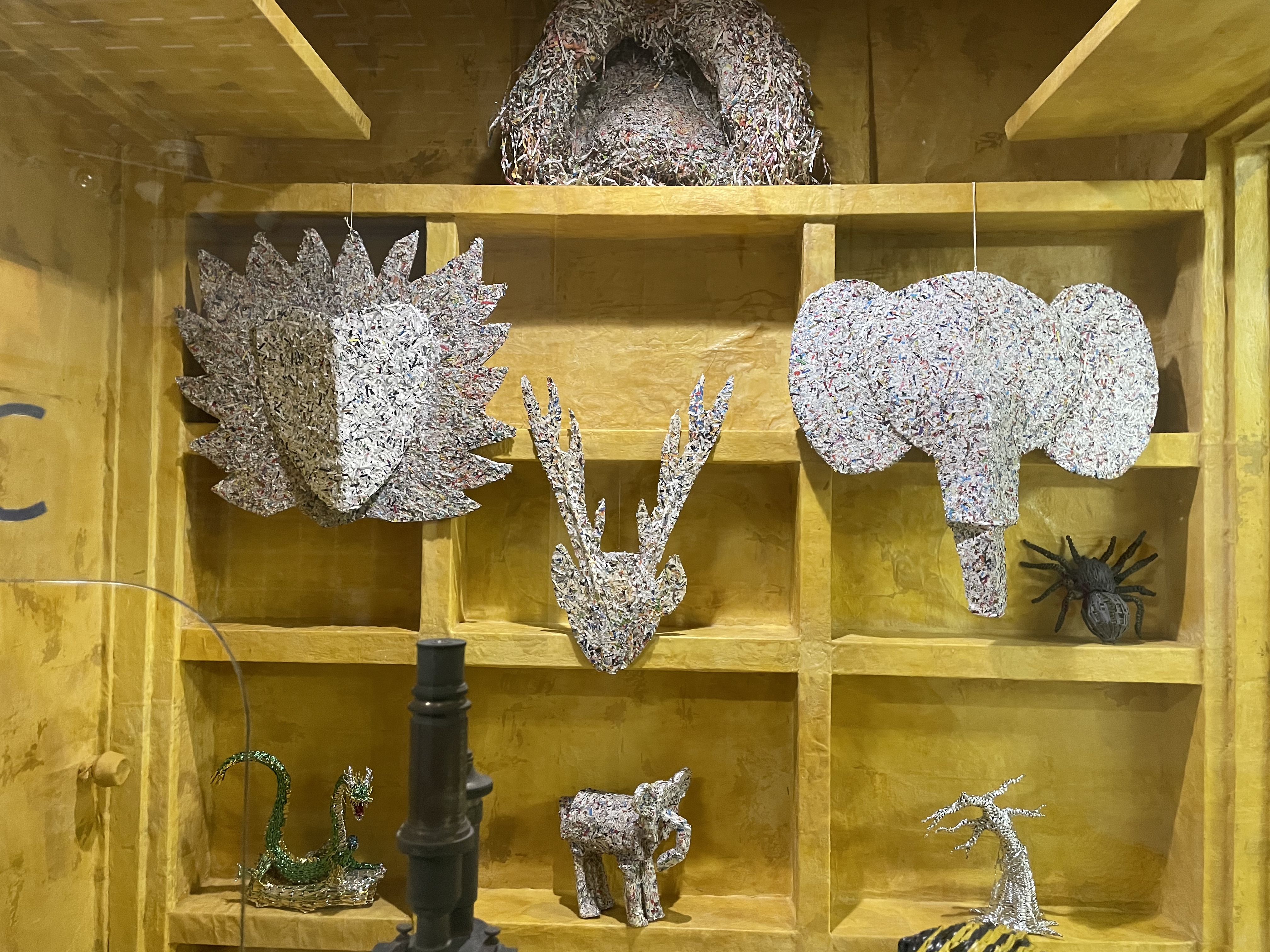 シュレッダーを回すのが大好きな網岡俊介。シュレッダーから出た紙切れをボンドで固めて動物 やいろんなものの形をつくる。はじめは動物の形を小さな立体にしたものだったは、最近は仮面のようなレリーフ型になっている。