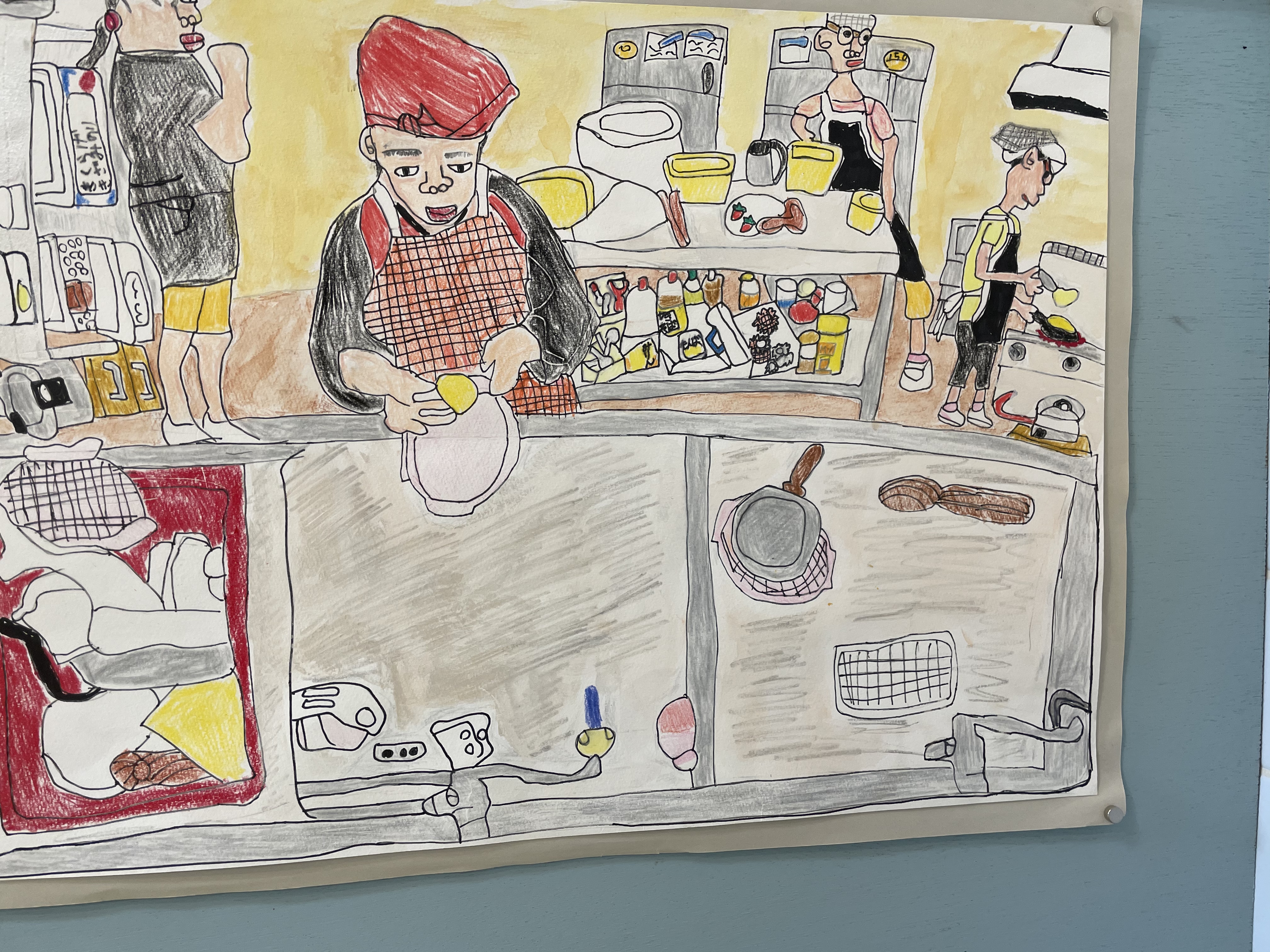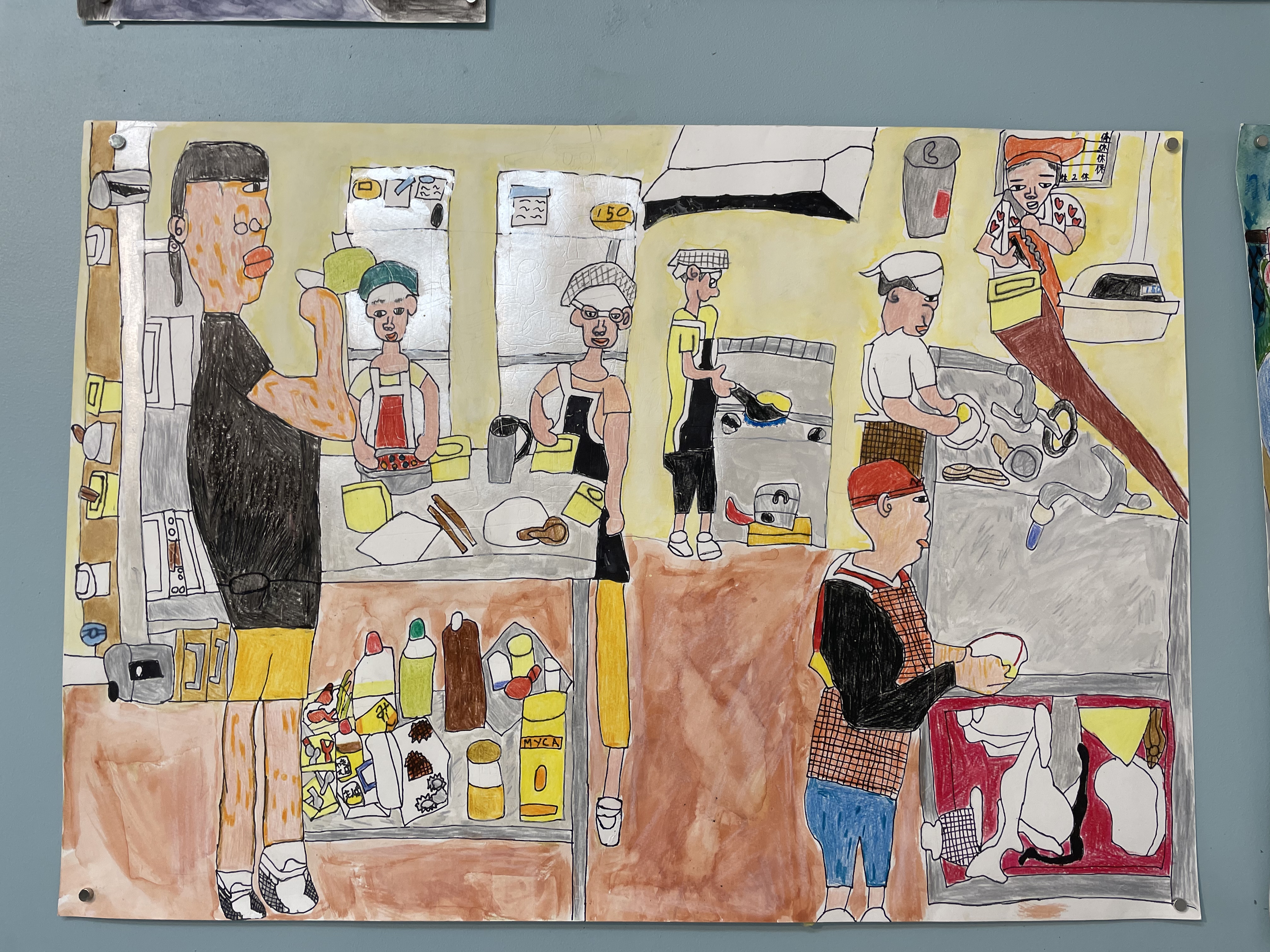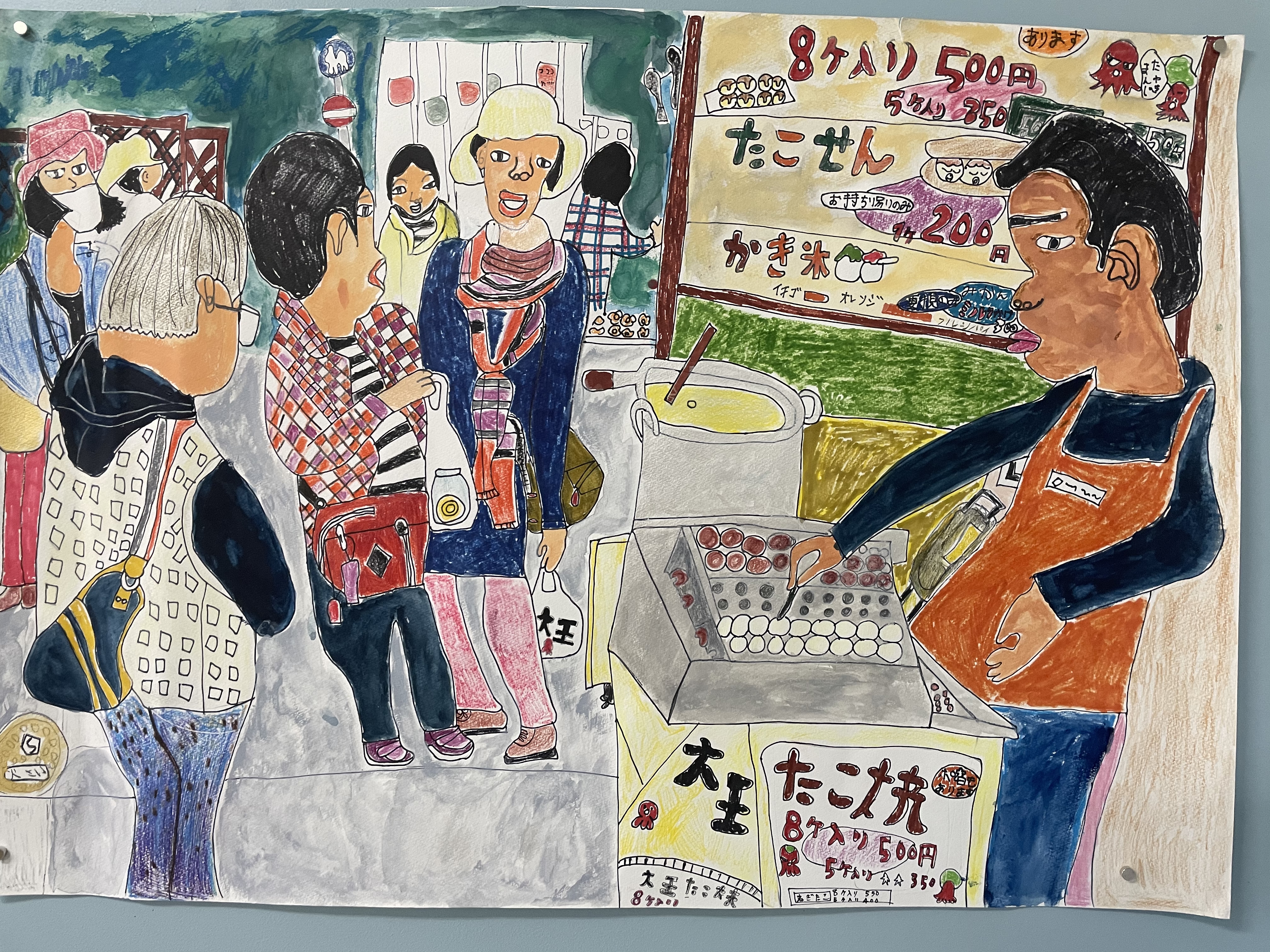 福田しずかは市場の魚屋やたこ焼き店、ステーキハウスのパフォーマンス・シーンなど、街で見られる日常の光景を描写している。福田がとらえるひとりひとりの人物の表情や姿勢、服装などが個性豊かに描き分られている。福田が所属する施設My夢には利用者の就労の場として大きな厨房があり、そこで味噌、弁当、お菓子が作られている。皆が作業するその厨房も福田の画題となる。おなじMy夢に通う斎藤龍樹の作品にも見られた画題だが、二人の描き方に独自の様式があるのがわかる。