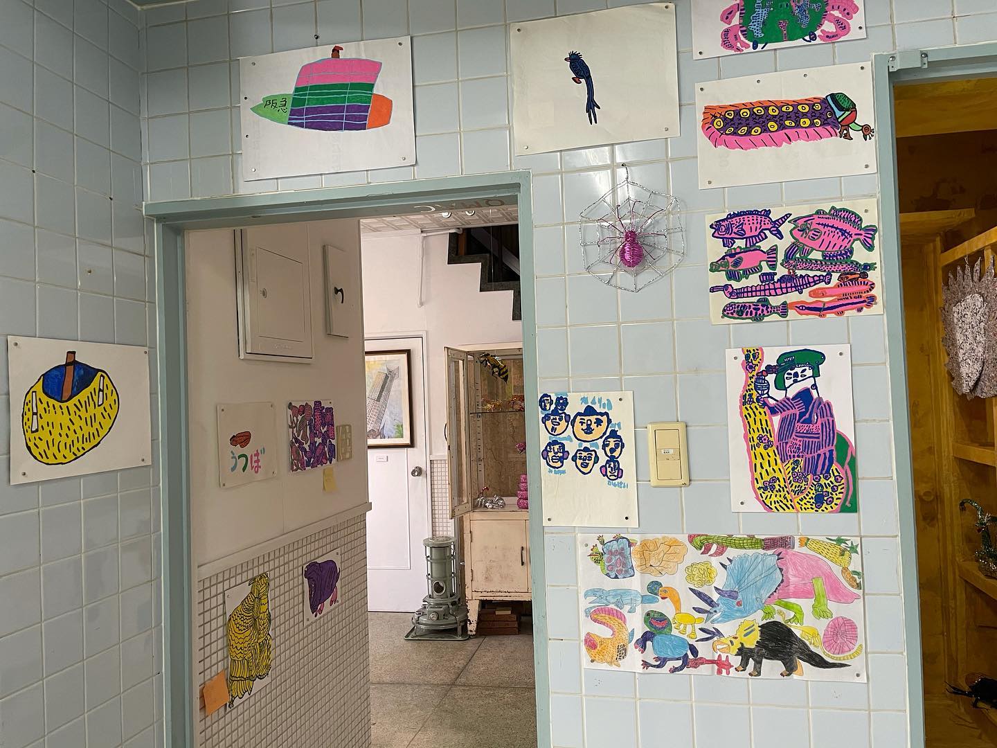 玄関の扉をあけて目に入るのは、一面に広がる友近邦宏やMARUのドローイング作品の数々にカウンターから覗くイブや網岡俊介のオブジェ。Operation Tableに足を踏み入れた瞬間の印象は、展覧会「KitaQ BRUT」を象徴するものでもあるだろう。つまり、表現の横溢。あるいは、生きることの端々からにじみ出るような表現の存在に私たちが気づかされる体験でもある。