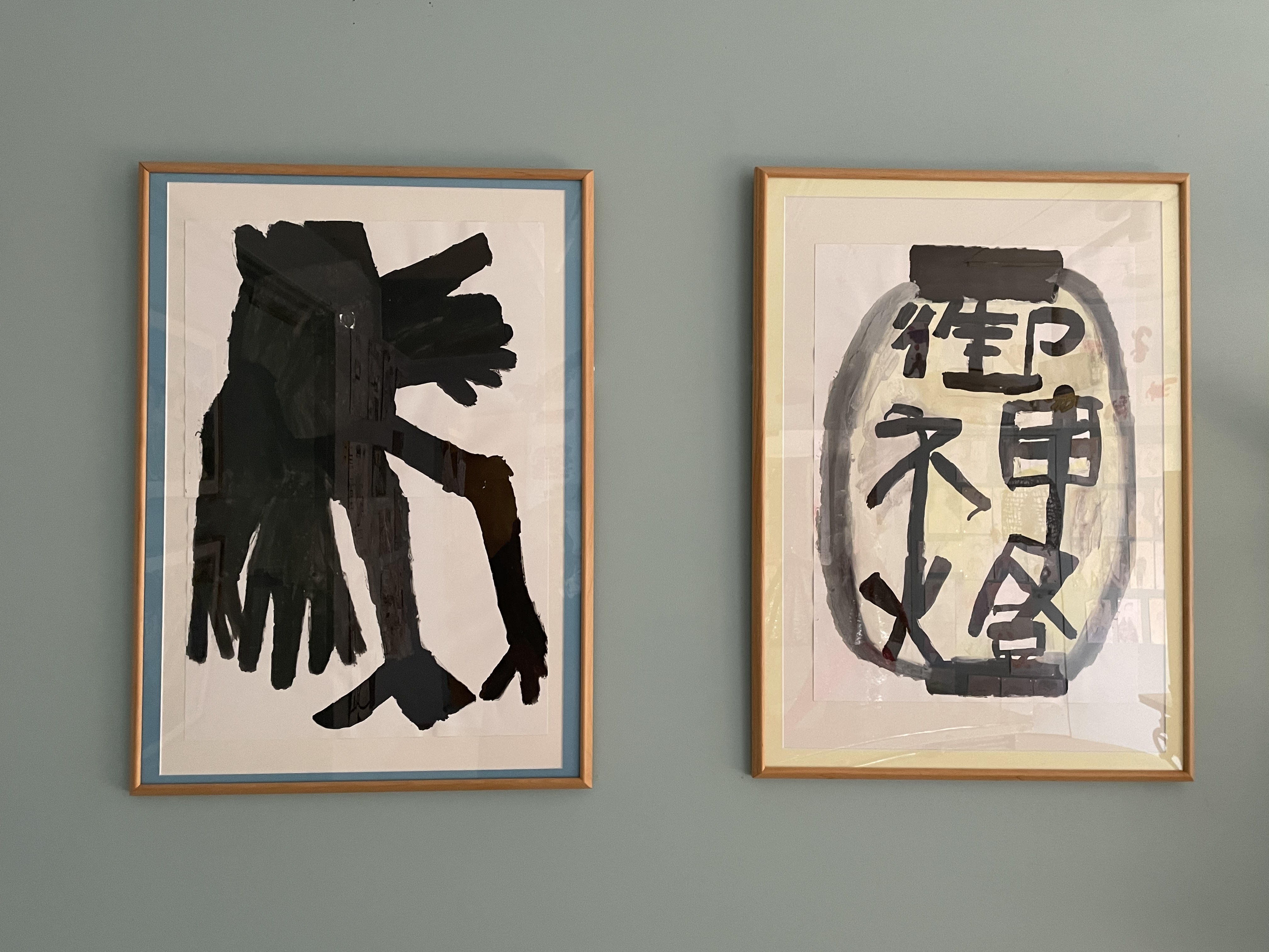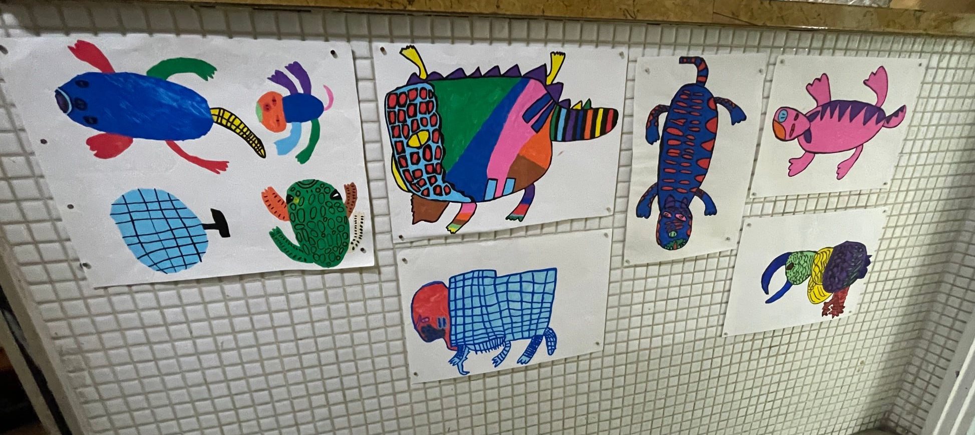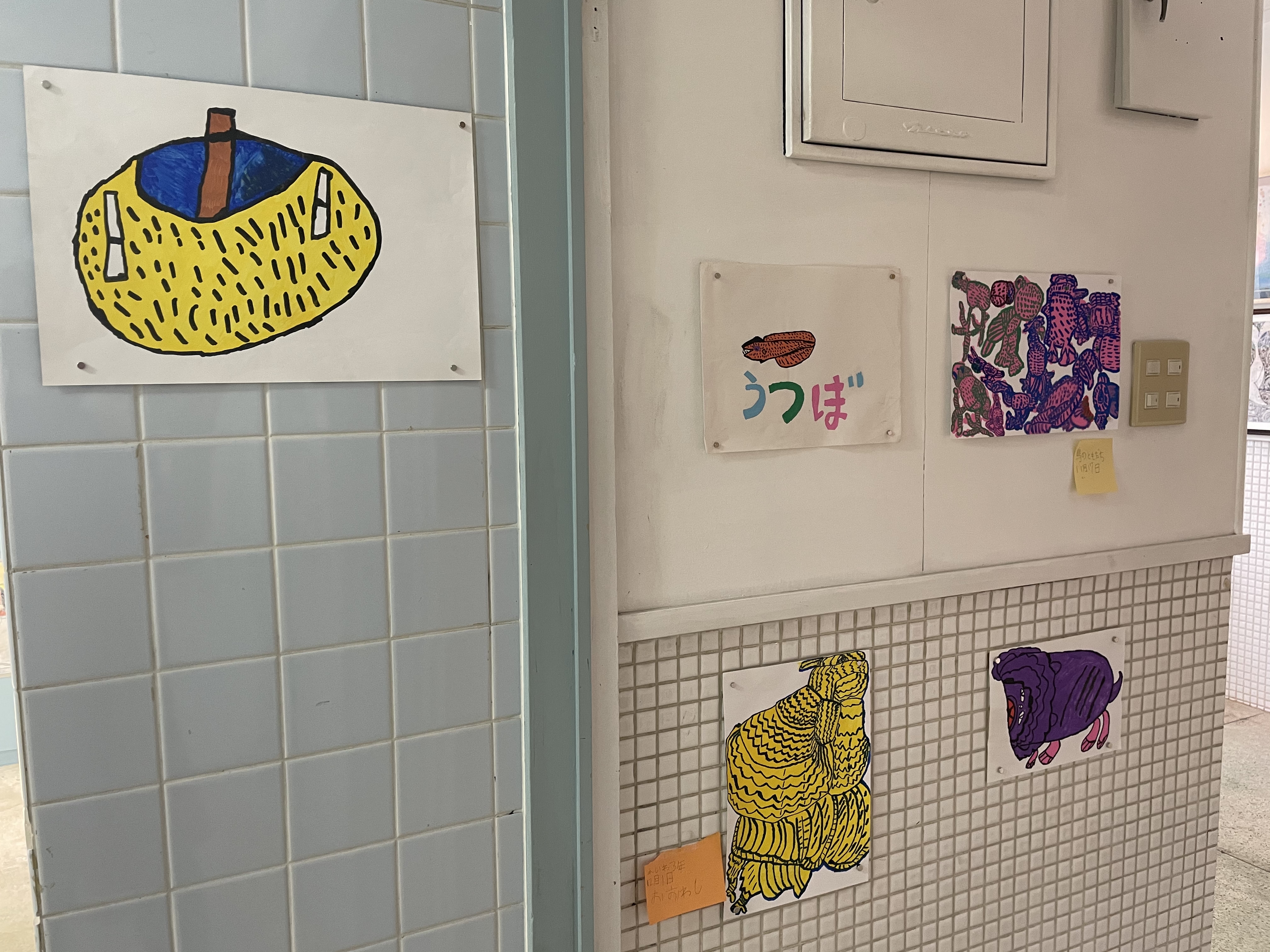 優太の作品はカレンダーの裏紙やノートの切れ端などに、余白をもって動物や昆虫や食べ物がポスカで描かれたもの、一箇所にまとめず、会場のあちこちに貼り巡らした。獰猛そうな動物も毛嫌いされる虫たちも、洒脱な色調で、みなポップに描かれている。タイルの上に貼られた自作品を不思議そうに見ていた優太、「磁石で貼ってるんだ」と気がついて嬉しそうだった。DMのカラー面には優太の作品画像は載っていないが、モノクロ面の切手マークのところに潜んでいる。