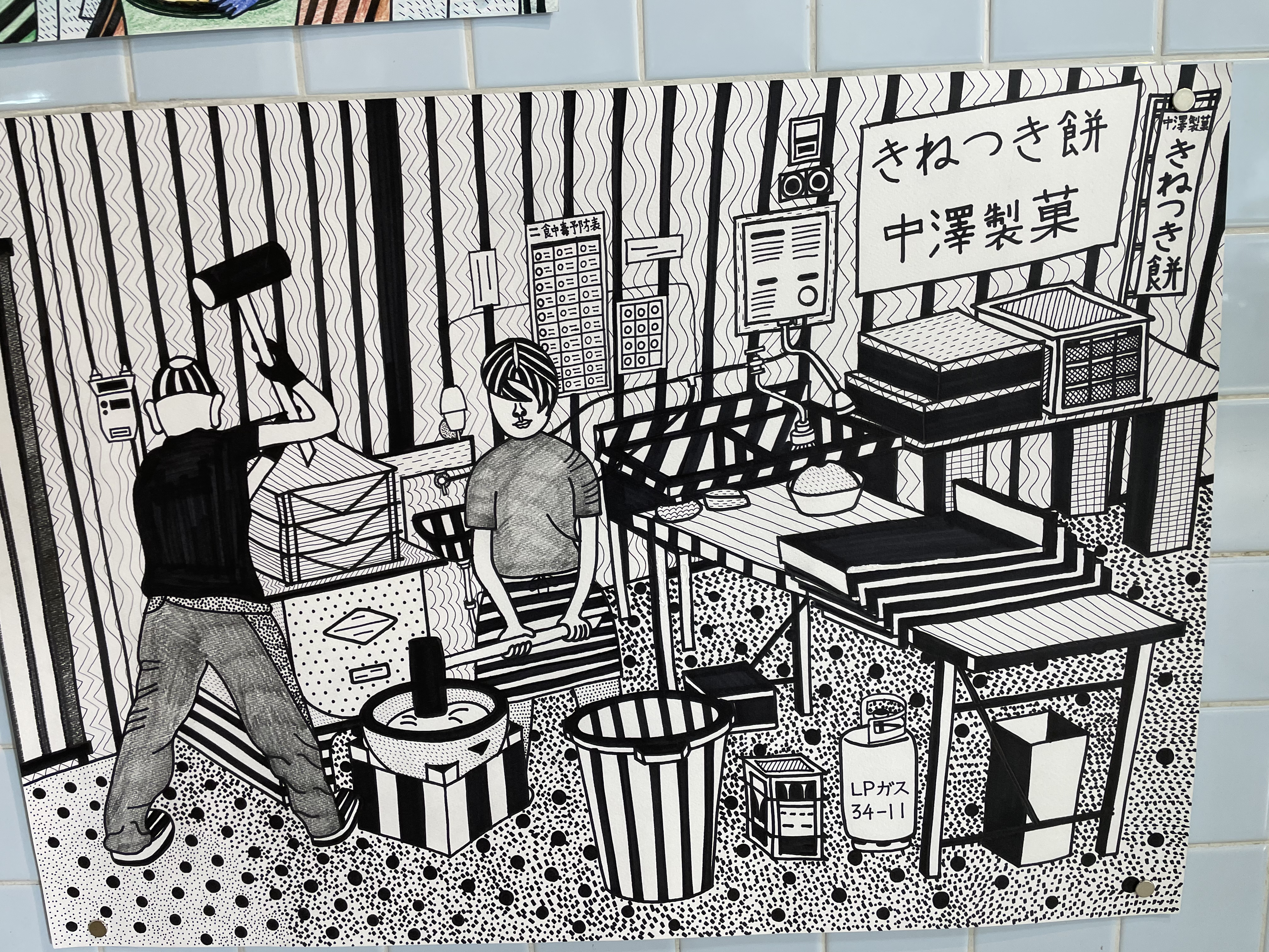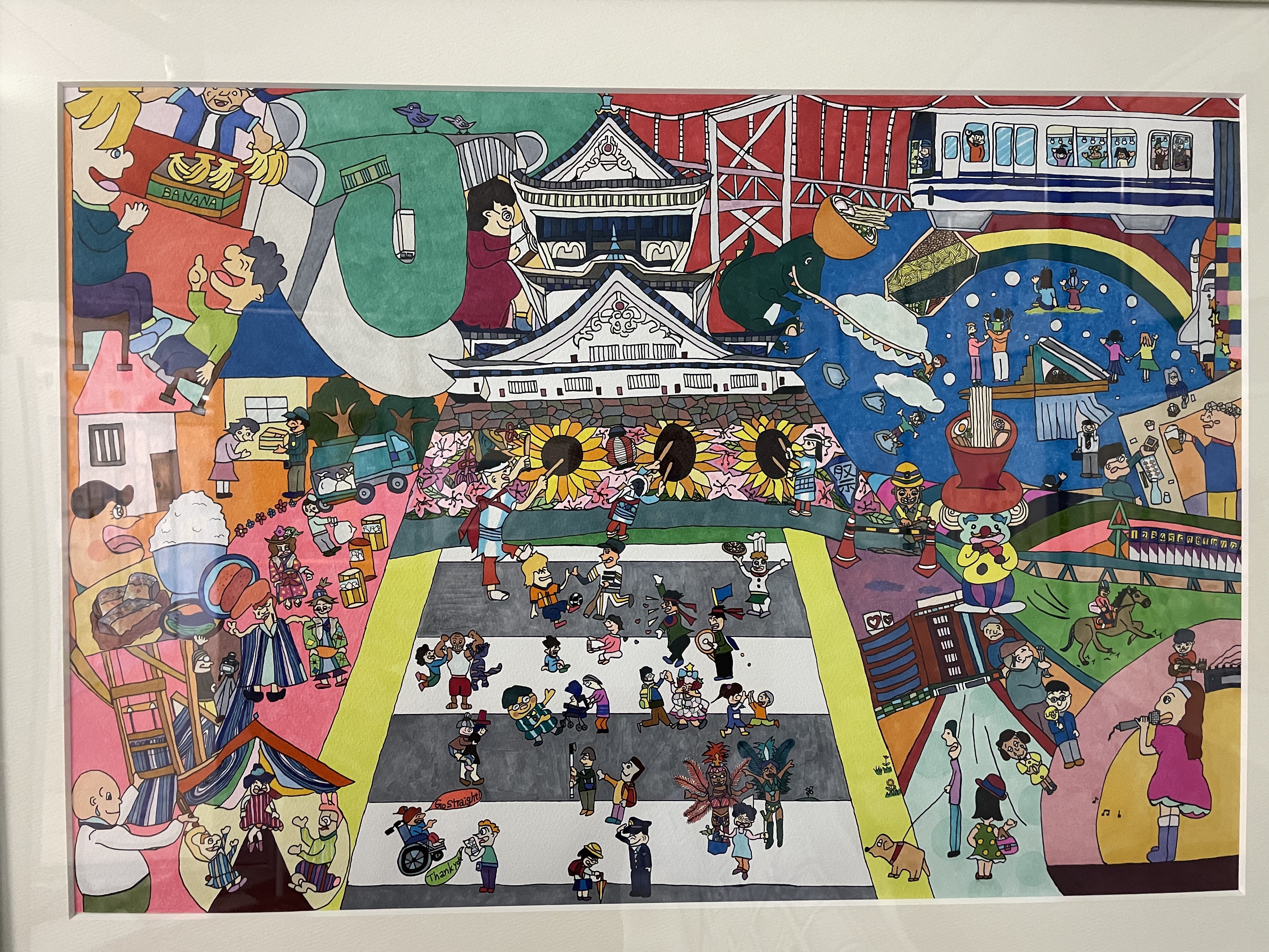 yukiの作品は一枚の紙にたくさんの場面がジグソーパズルのようにぎっしり詰まって組み立てられたもの、見れば見るほどいろんな情景が現れてくる。圧巻は北九州名物を集めた一枚。門司港名物バナナの叩き売り、辛子明太にぬか炊き、画面中心には小倉城と小倉祇園太鼓、その向こうにモノレールと関門大橋、ごぼ天うどんにとんこつラーメン、ラーメンどんぶりのお箸にはなんと暖簾がかかっていて、そこは角打ち酒場、空にかかった虹の黄色い帯は、これも密かな名物、東筑軒かしわ飯弁当の錦糸卵につながっている!ほかにも小倉競馬場や、磯崎新設計の中央図書館の銅葺きドーム屋根、小倉織や分別ゴミ箱まで。北九州の街を知らないヒトはこれで学習できる。