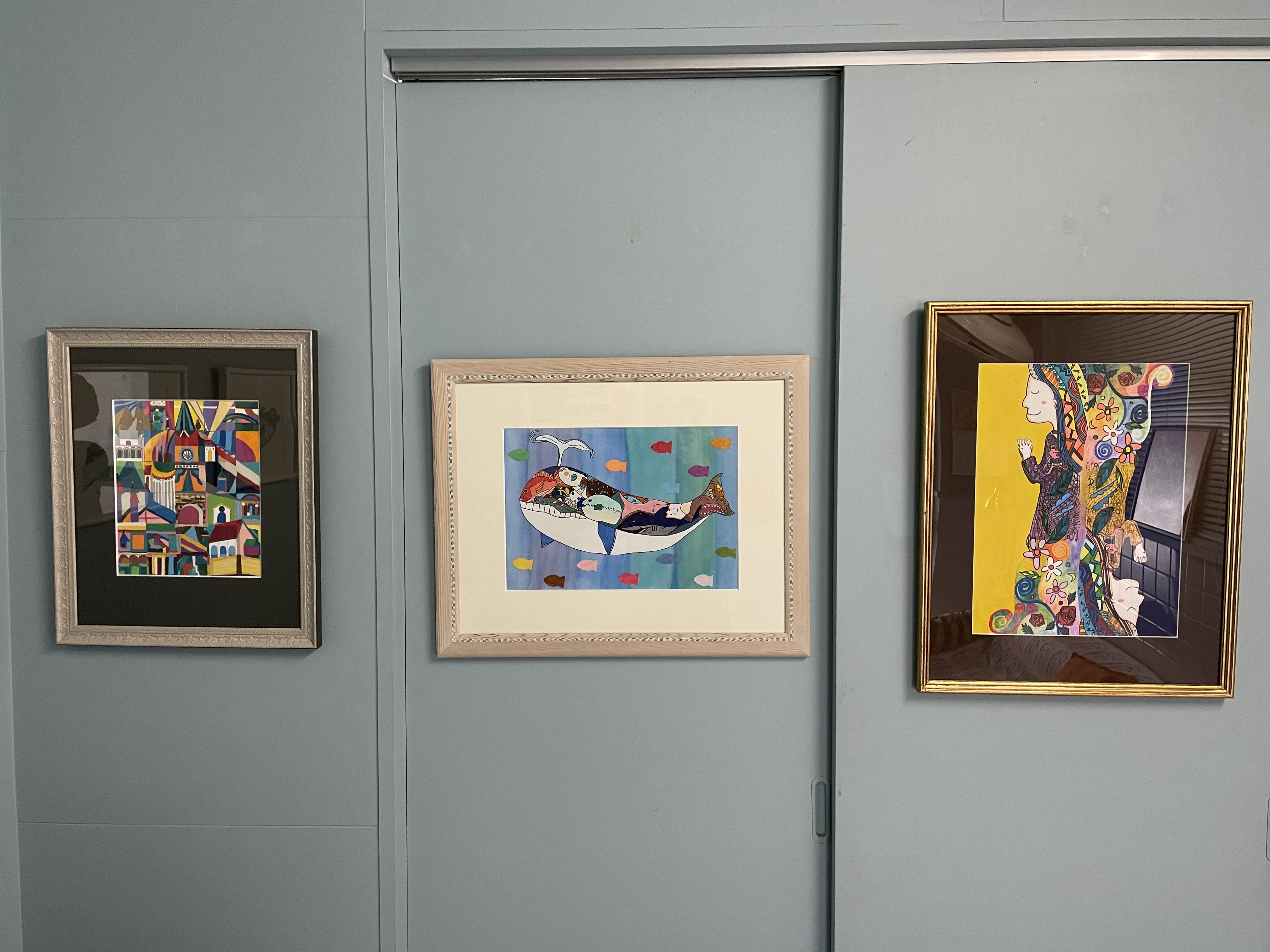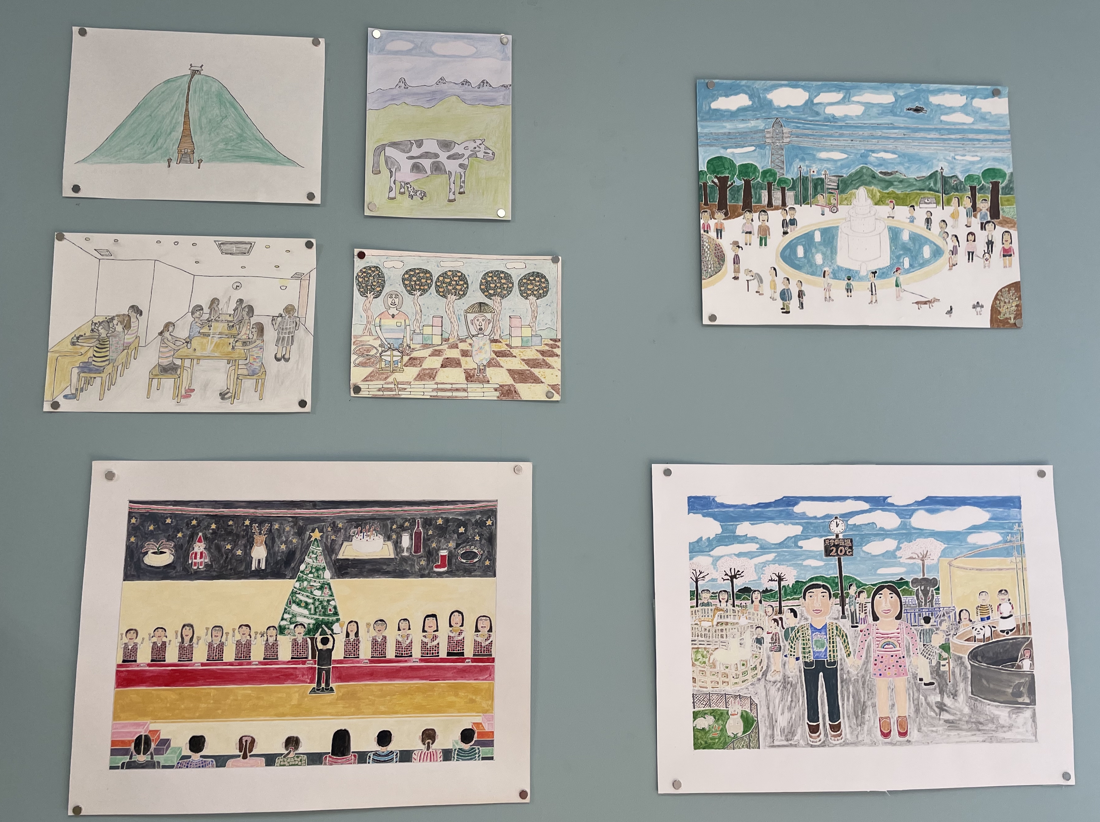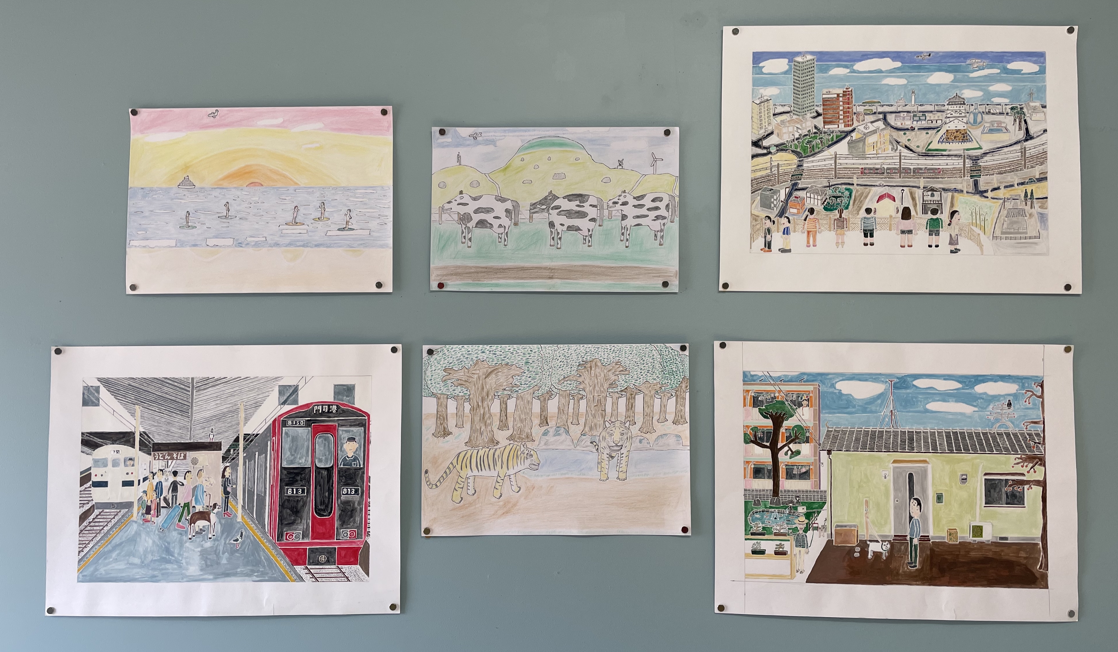 (第3室南側パネル 上左から下右へ) 『大好きな君』『犬・犬・犬・・・?!』(無題)(無題)『アトランティス』『あしたへ』『あしたへ』『地球』『緑の街~KUNITANI 』
