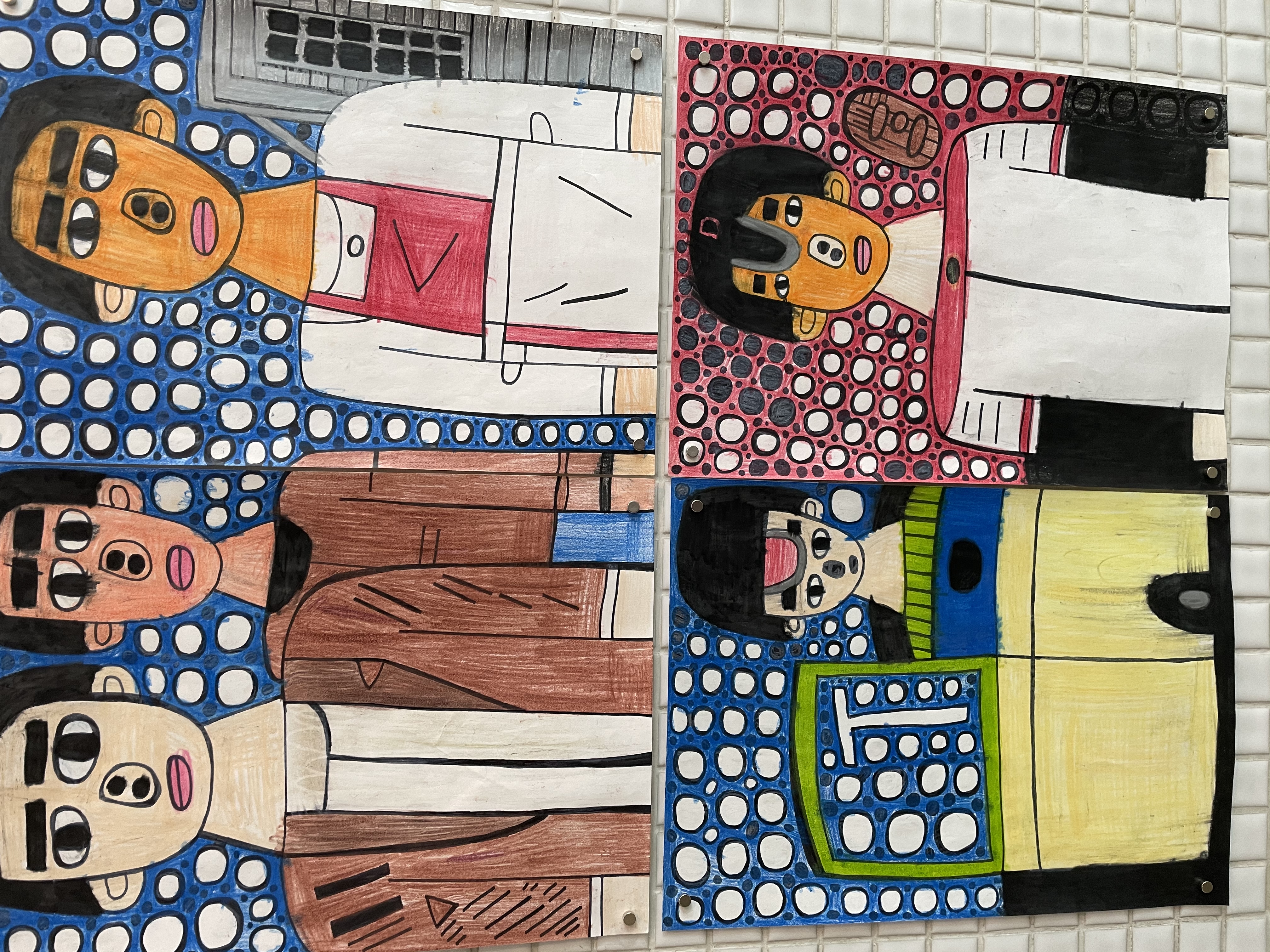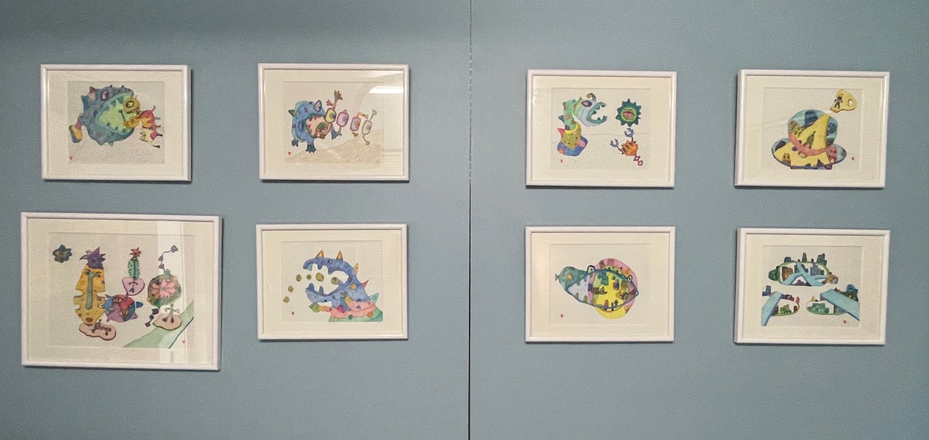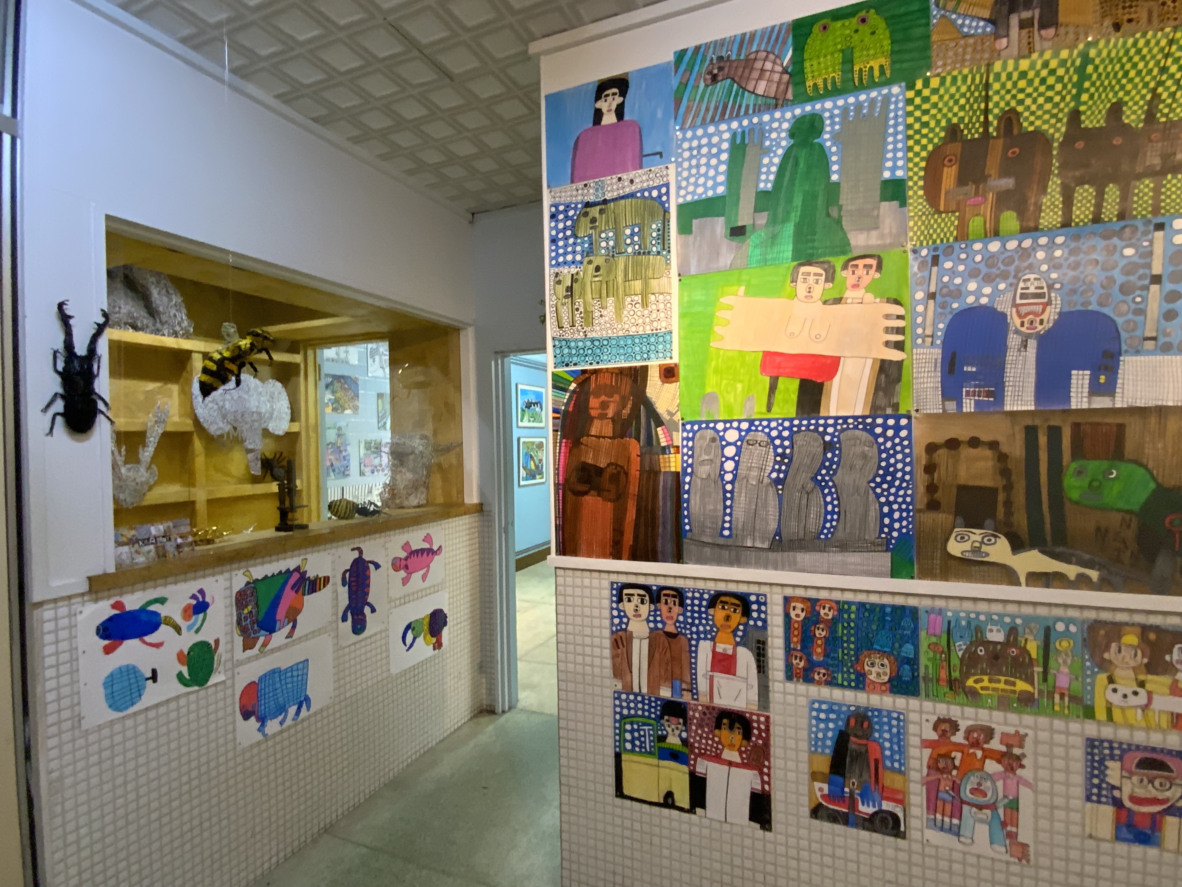 (第3室南側パネル 上左から下右へ) 『大好きな君』『犬・犬・犬・・・?!』(無題)(無題)『アトランティス』『あしたへ』『あしたへ』『地球』『緑の街~KUNITANI 』
