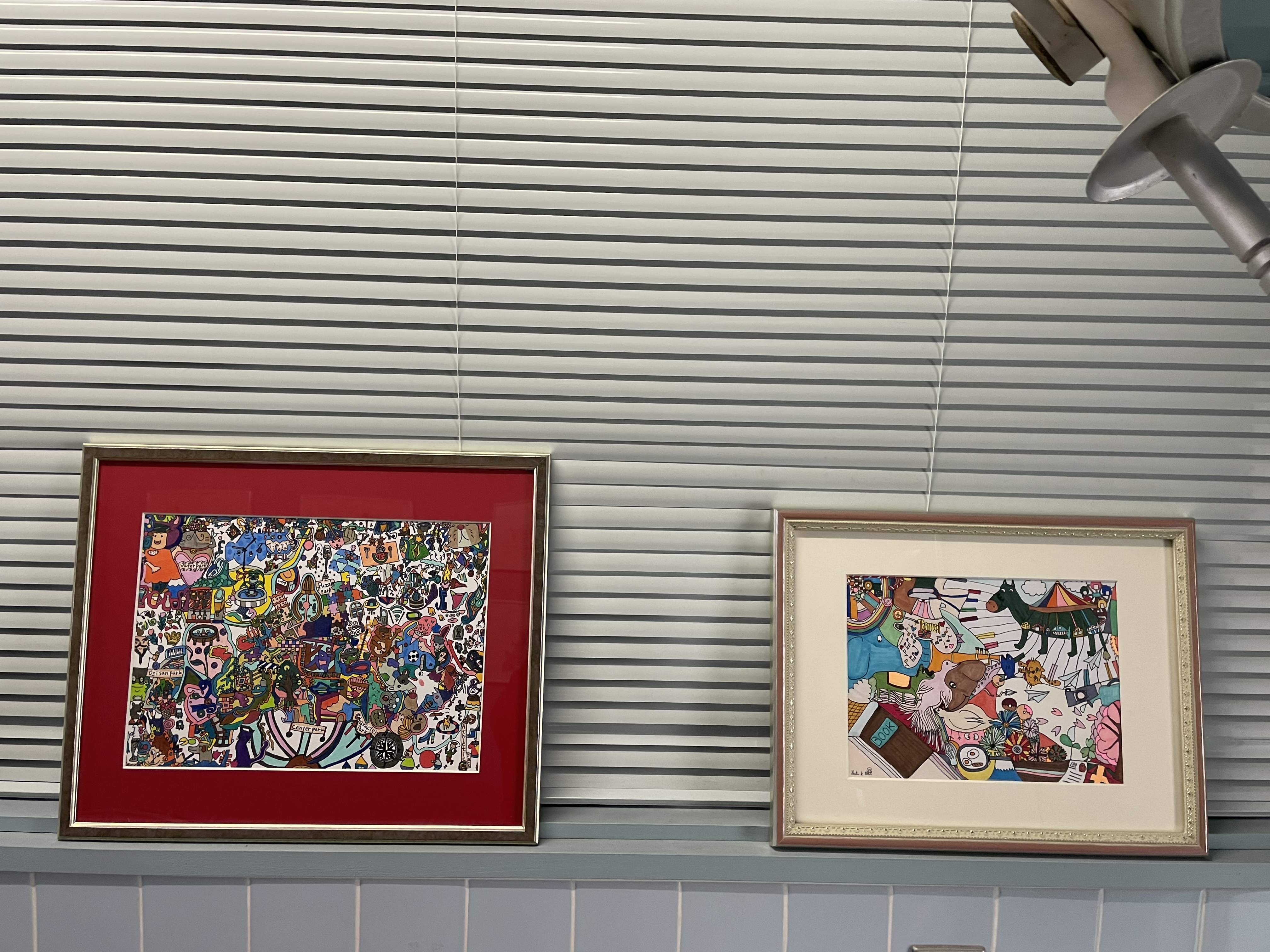 さらに、ギャラリーから続く、小部屋には相良徹とyukiの作品が展示されていた。恐竜のようであったり植物のようであったりと不可思議な形態のカラフルな生物たちの生態が描かれた相良の作品と大小さまざまなモチーフで画面を分割して鮮やかに彩ったyukiの作品。額装されたそれらの作品は、ソファや机のある空間と協奏し、日常の狭間に夢想の世界への窓口を作っていた。