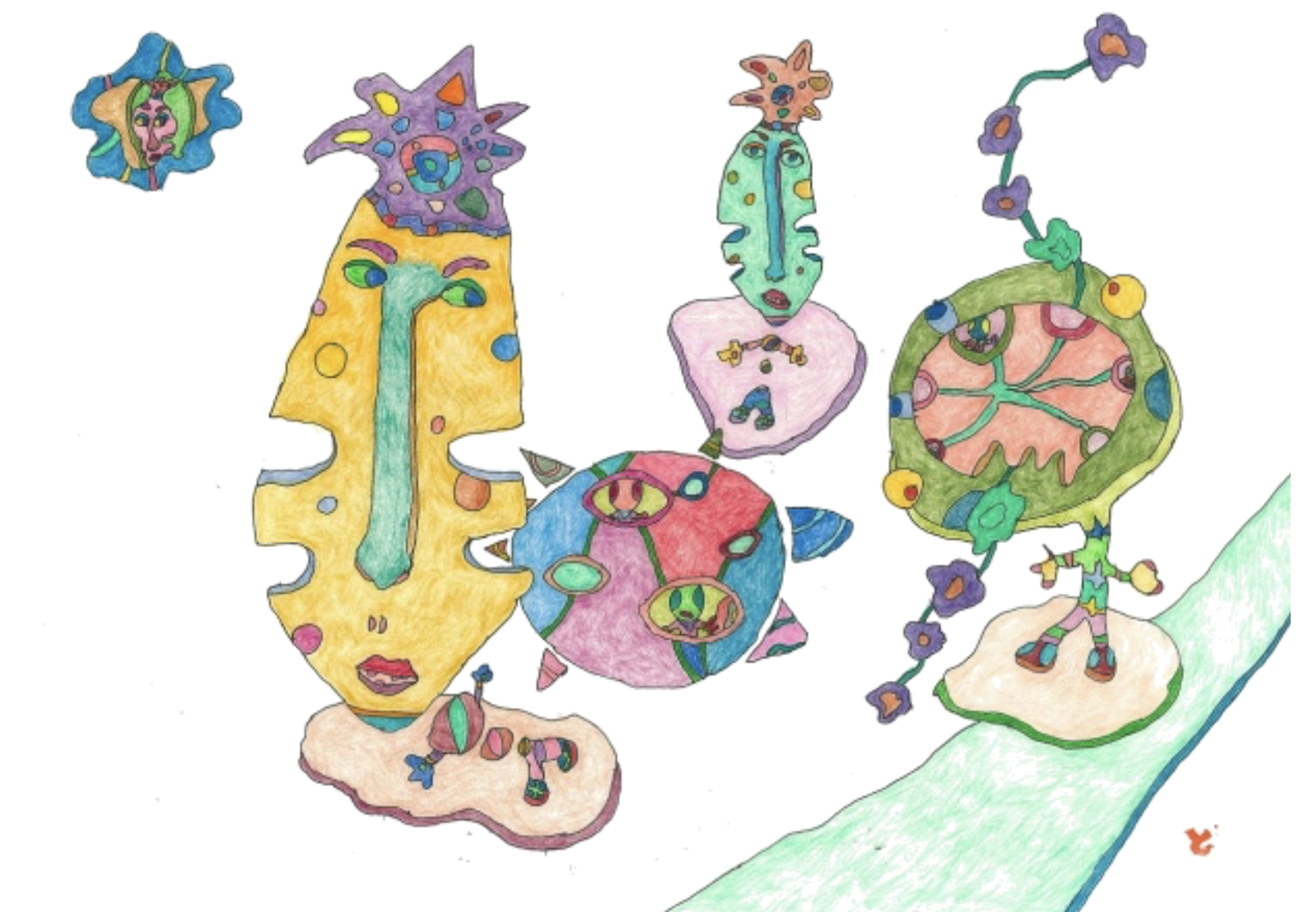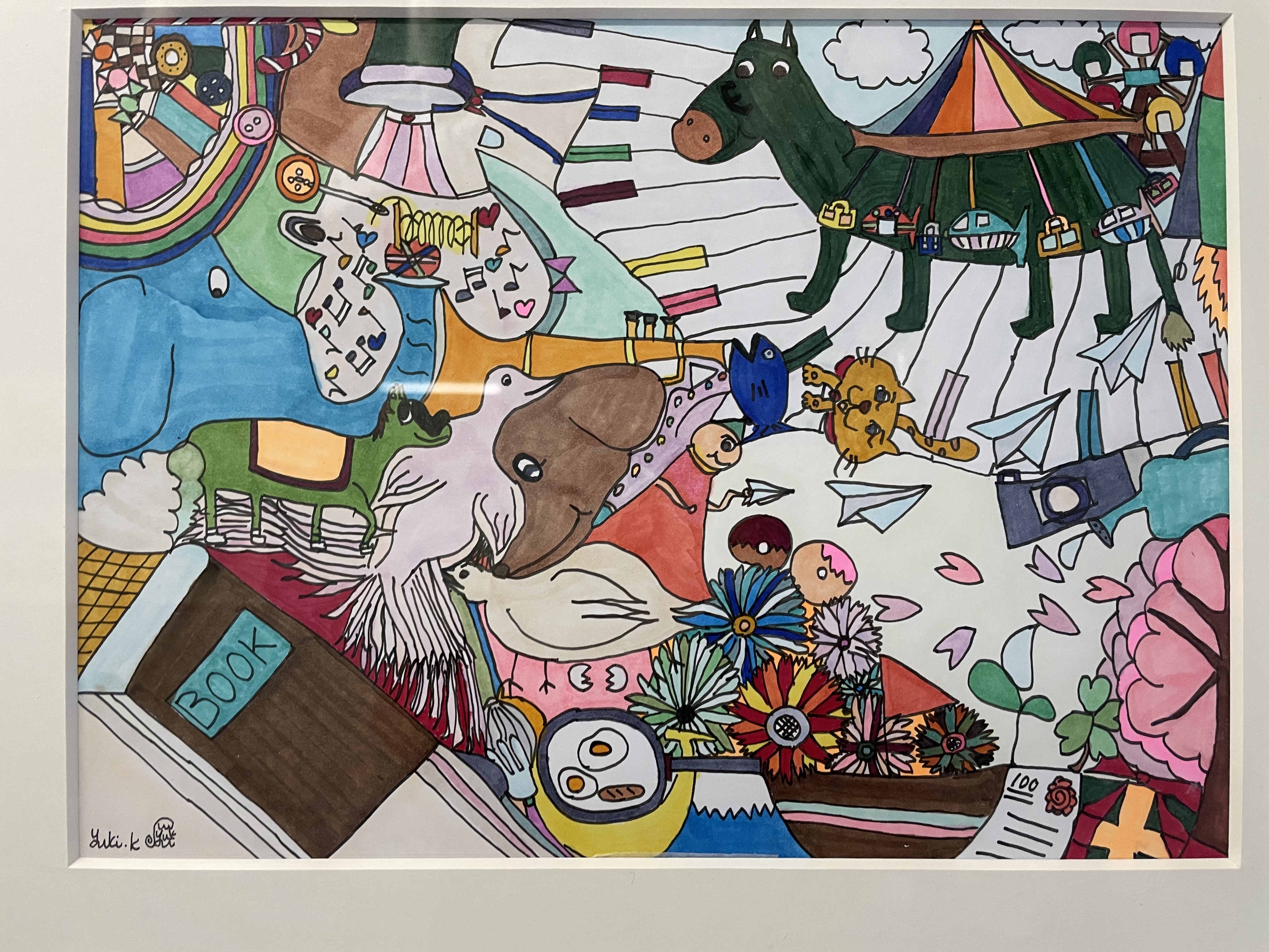 120色の色えんぴつからうまれるフシギな、ちょっとシュールな宇宙世界。やわらかな色づかいや登場するキャラクターのかわいらしさにご来場の何名かの方がこの作家さんは10代の女の子?とおっしゃいました。が。今年、還暦の男性。働きざかりのお年頃に脳梗塞を発病。リハビリ施設の絵画サークルに参加されて以来、麻痺のため動かない利き手でなく、左手で描いていらっしゃいます。(たら子)