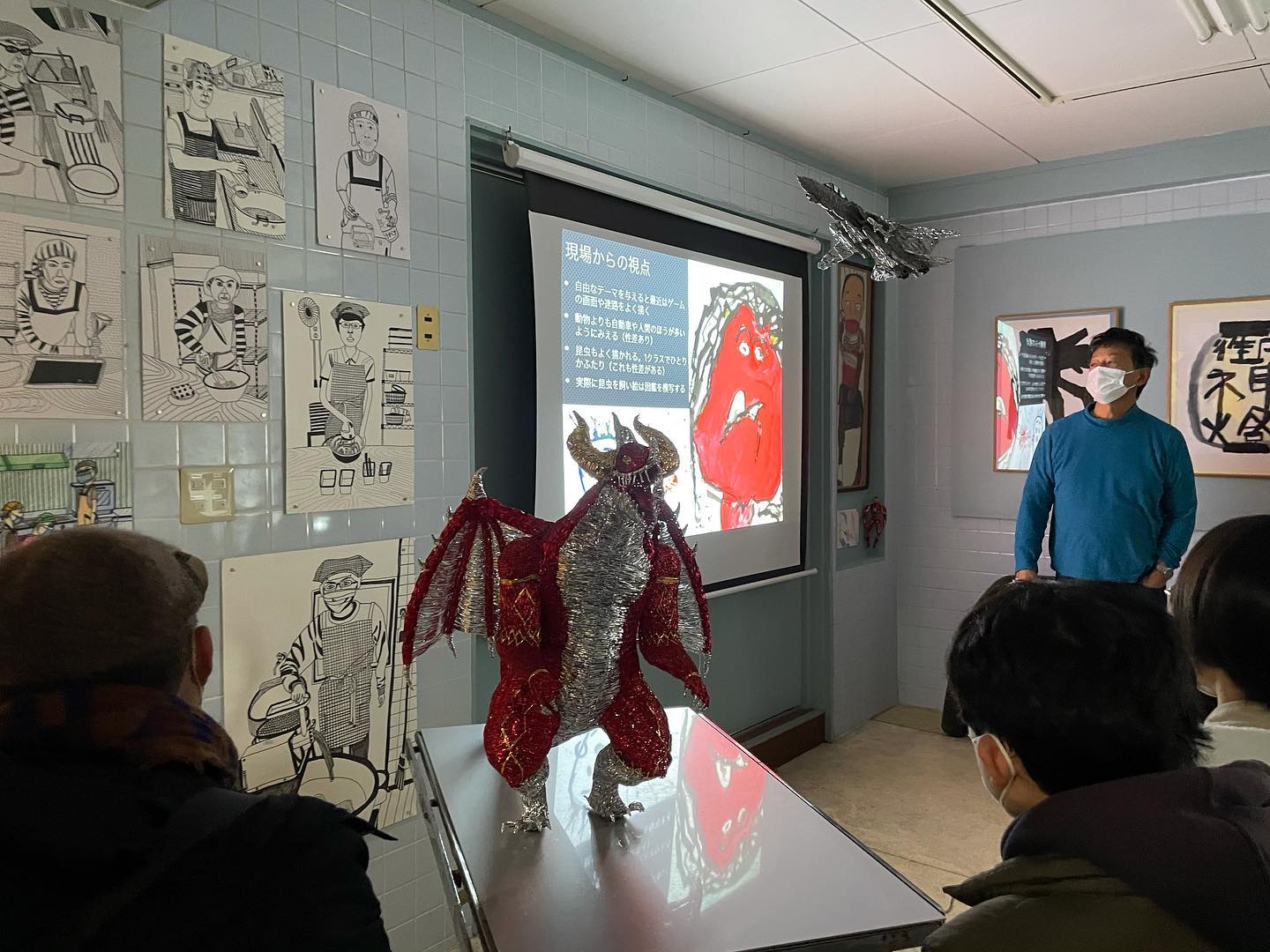 12月18日(土)は竹川先生の講演「ヒトはなぜ動物を描くのか?ーアールブリュットからの視線」が行われました。QMACでは2年ぶりのトークイベント、演題の魅力もあってひさびさの密の会場となり、多くの参加者がありました。人間を描く/自然を描く/動物を描く/表現すること、対象と向き合うアプローチの個人差、民族性、東洋・西洋の比較がリサーチとインタヴューに基づいて語られ、興味津々の話題が盛り沢山、おまけに竹川先生幼少期のまさにアール・ブリュットな作品群も見せていただきました!