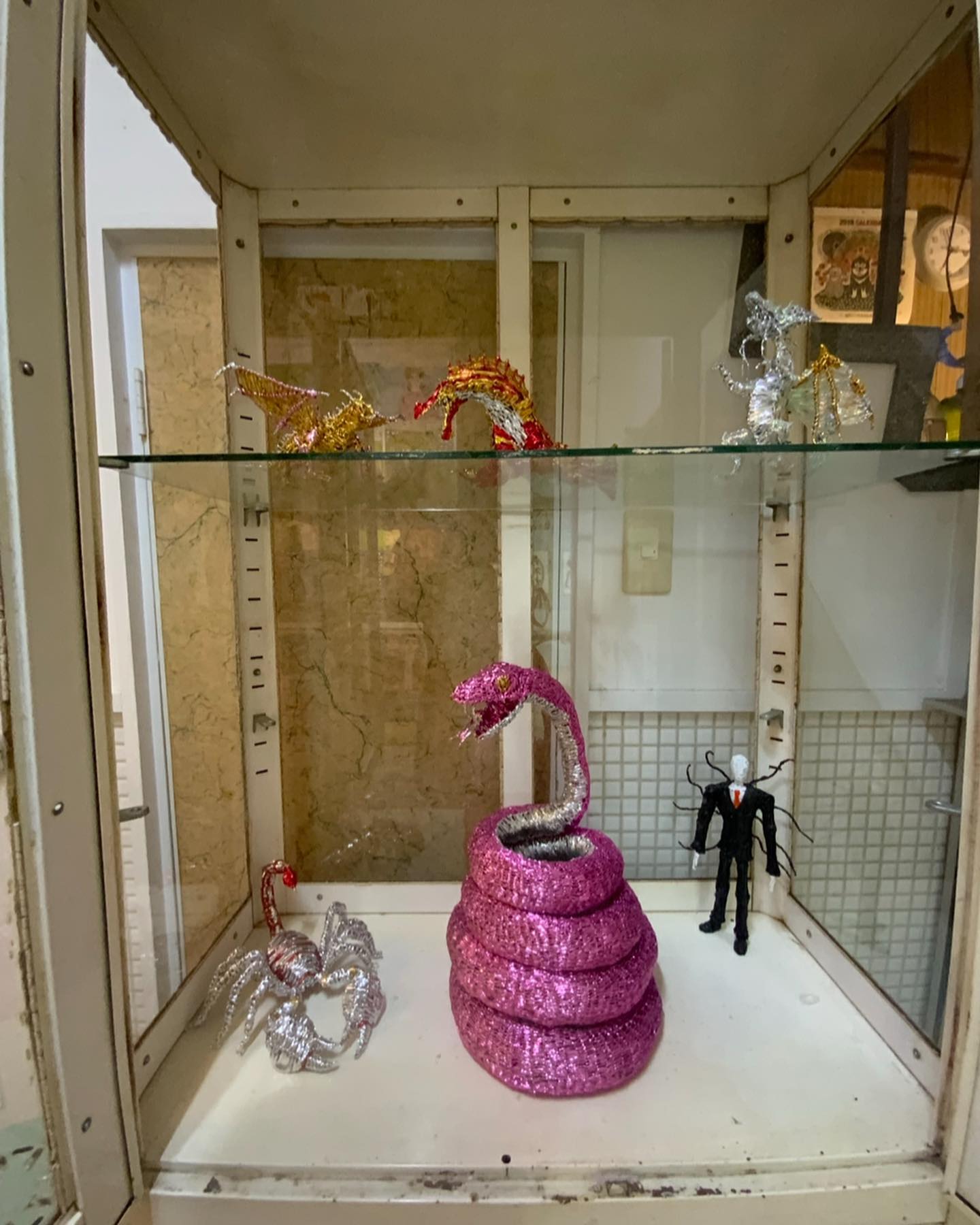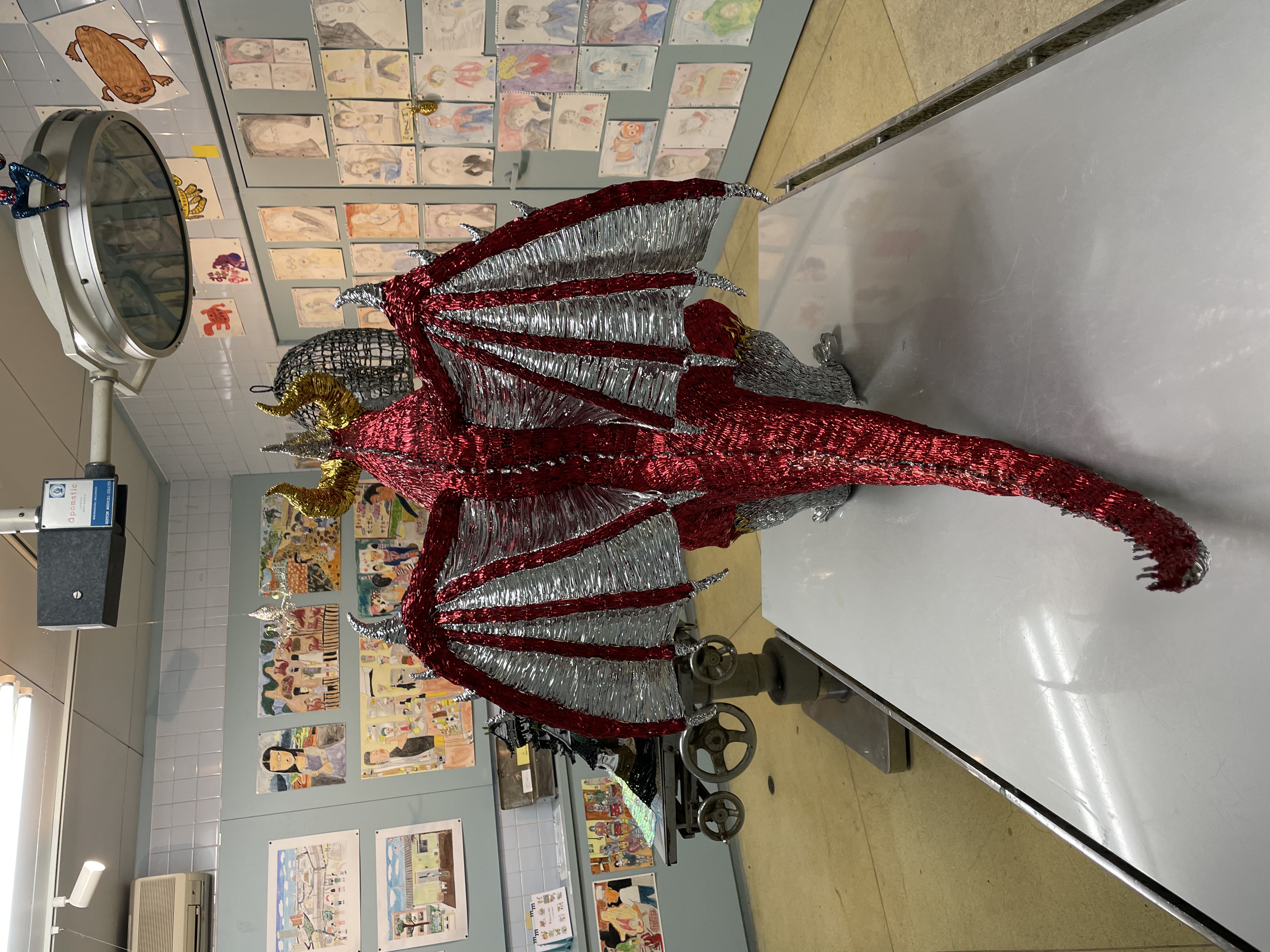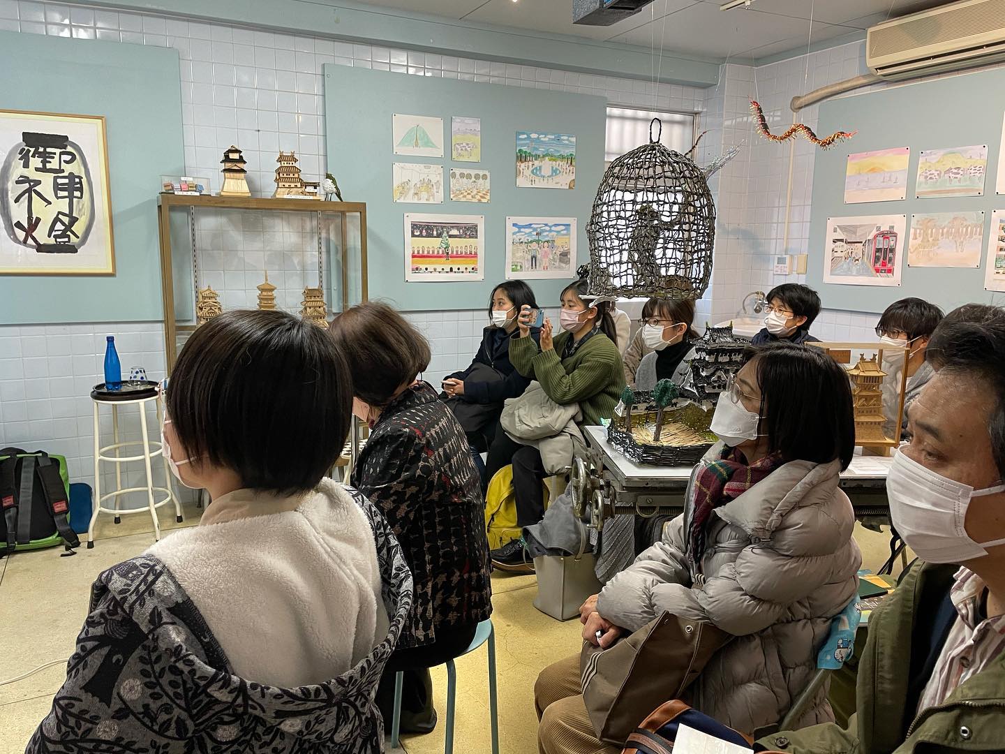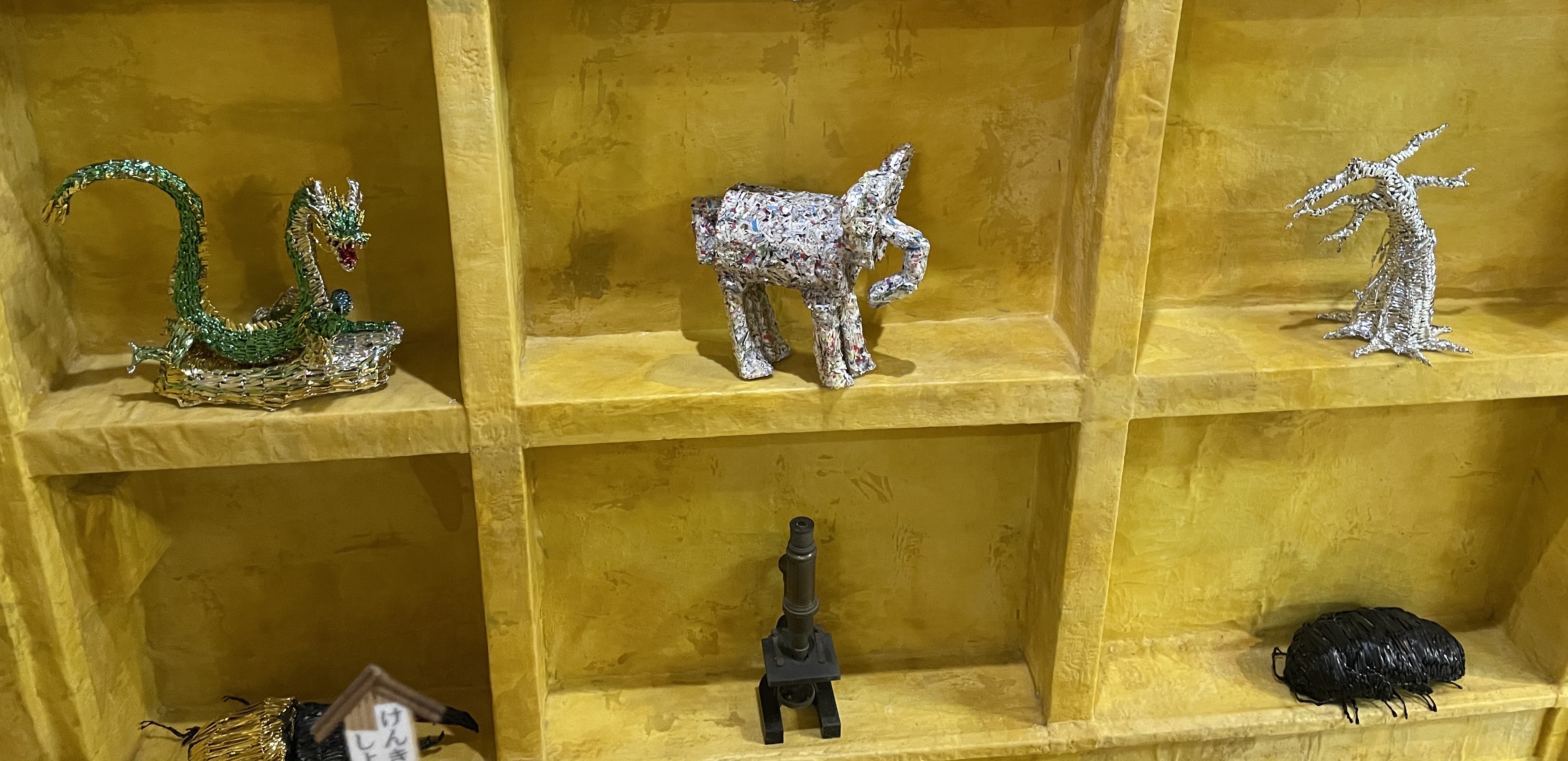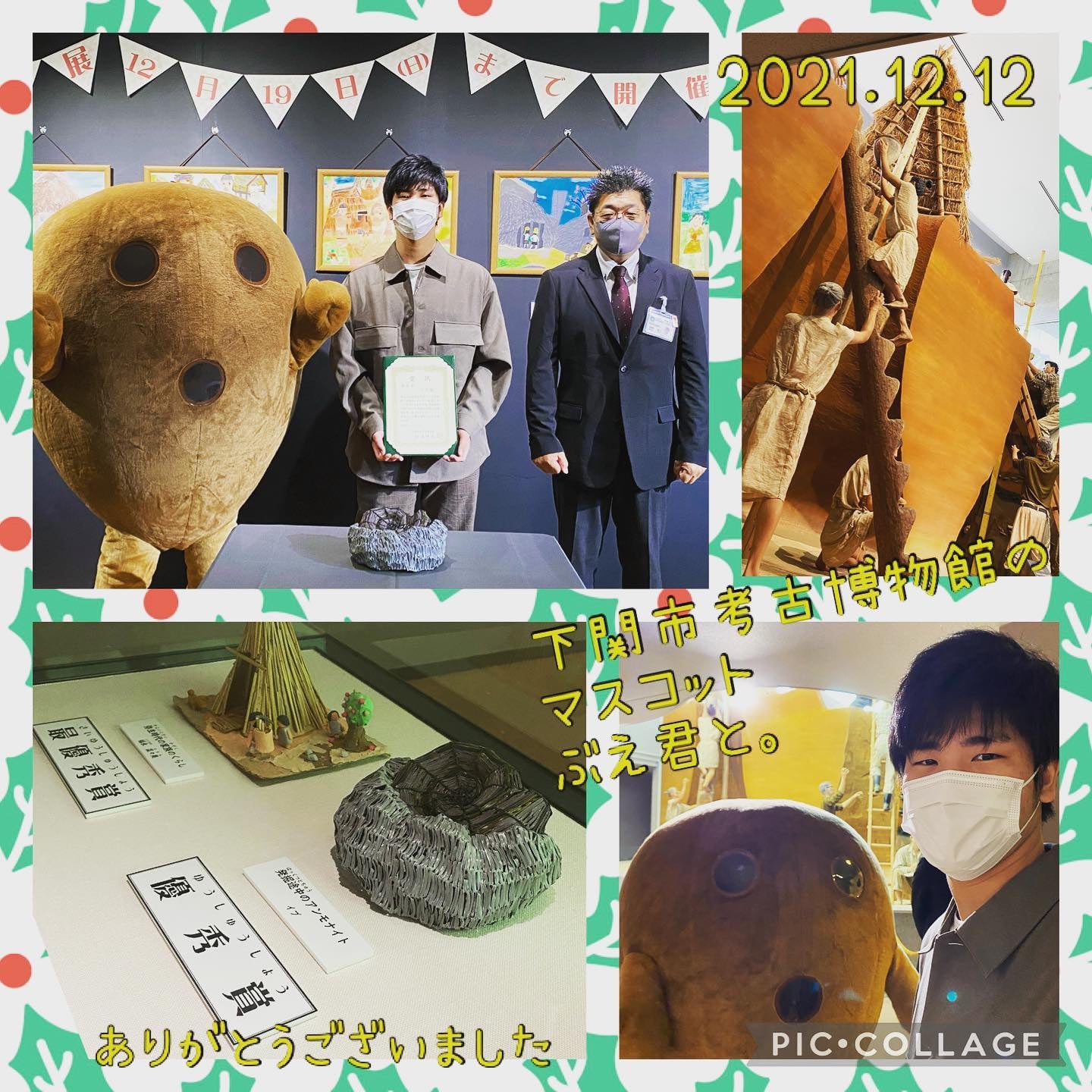 イブの作品はビニールタイといいう、10cmほどの梱包用のビニールワイヤーを素材にして編み上げたオブジェ、恐竜や虫やアニメのキャラターなどのほか、イブさんの想像力から生み出された不思議なヒトや生き物もいる。一番大きなドラゴンは、戸畑の障害者福祉協会アートセンターに常設されていたもの。ひさしぶりに対面して、懐かしそうに手や足の先を動かしてかたちの手直ししていた。イブの作品は置いたり引っ掛けたり吊るしたりできるので、会場いっぱいに神出鬼没であった。12日午前中は下関市立考古博物館で開かれた「遺跡deあーと」応募作品展の授賞式に参加された。イブが応募した「発掘途中のアンモナイト」が優秀賞となって出品されたのである。12月16日まで下関市立考古博物館に展示され、1月に入ってKitaQ BRUT会場にも追加展示となった。