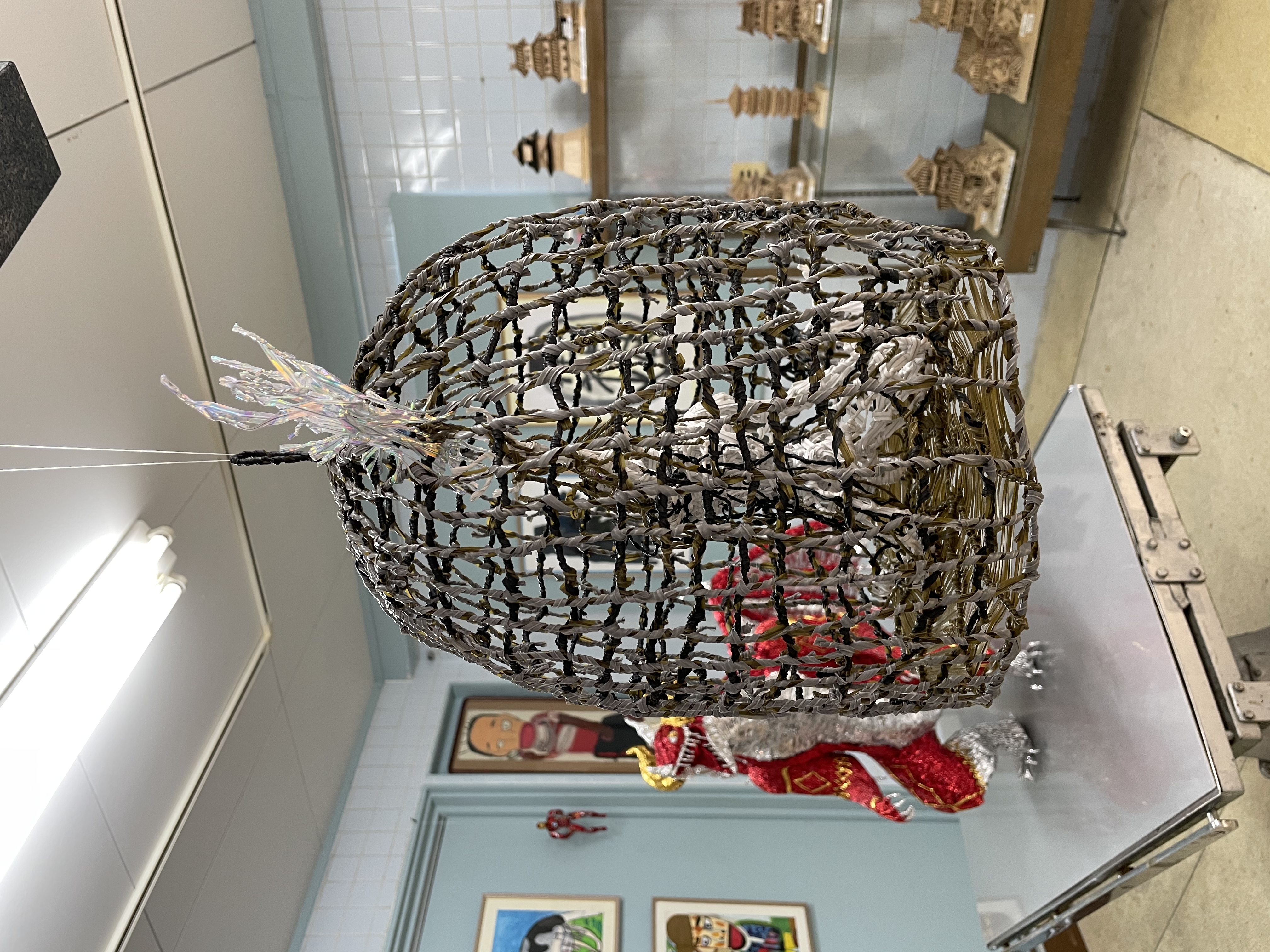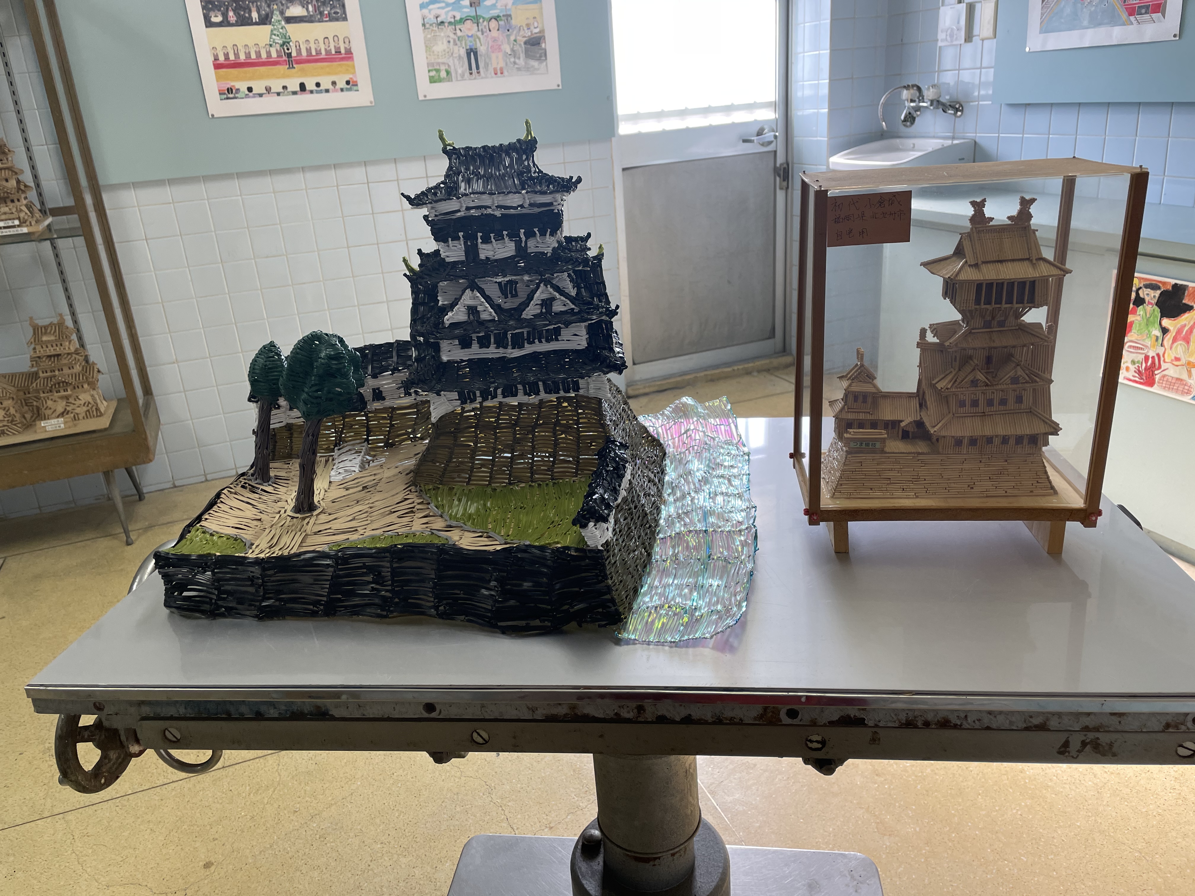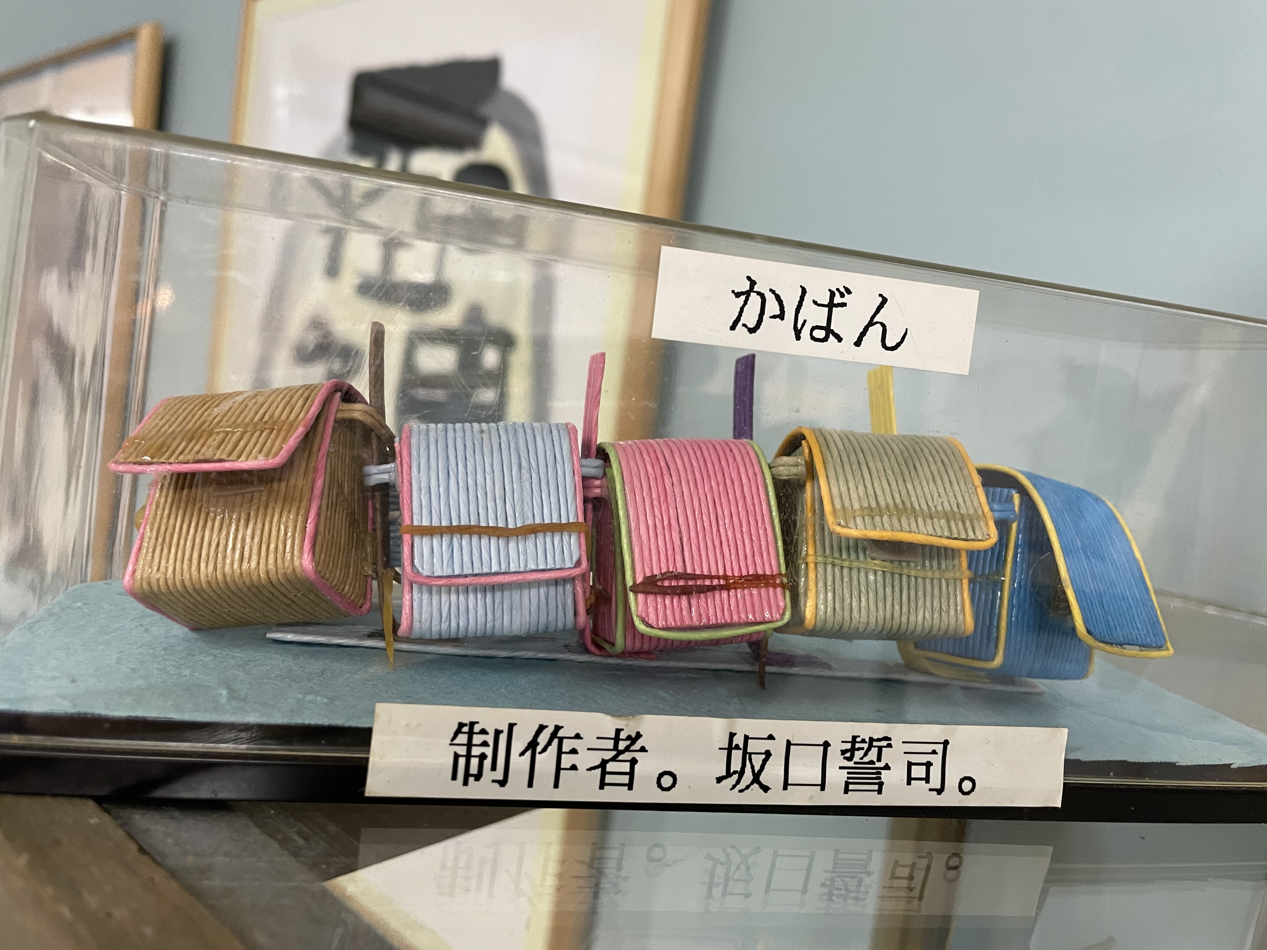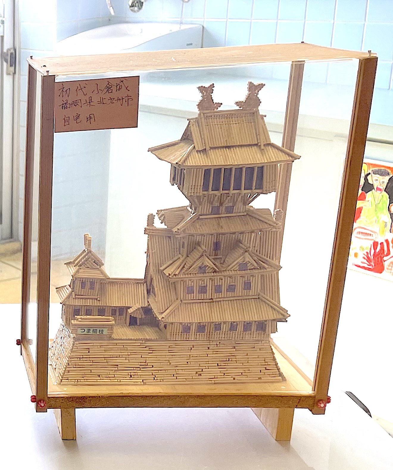 驚くことに今年(数え歳で)米寿を迎えるという坂口誓司は爪楊枝で作られた日本の名城シリーズを出品。坂口が城の模型をマッチ棒で作ってみたのは23歳のとき、今ではマッチ棒が爪楊枝に代わり、小倉城をはじめとする日本各地の名城を制作している。最近はお城の他に、カラフルな梱包用紙紐で編んだ籠や小さなランドセル、そしてワンちゃん101匹も生まれた。坂口さんは、惜しげもなくそれらのワンちゃんや籠を出品作に付けて、「会場でみなさんにお持ち帰りいただいてよいです!」と、提供。会期終了間近には、ワンちゃんたちもすっかり小さな行列となった。