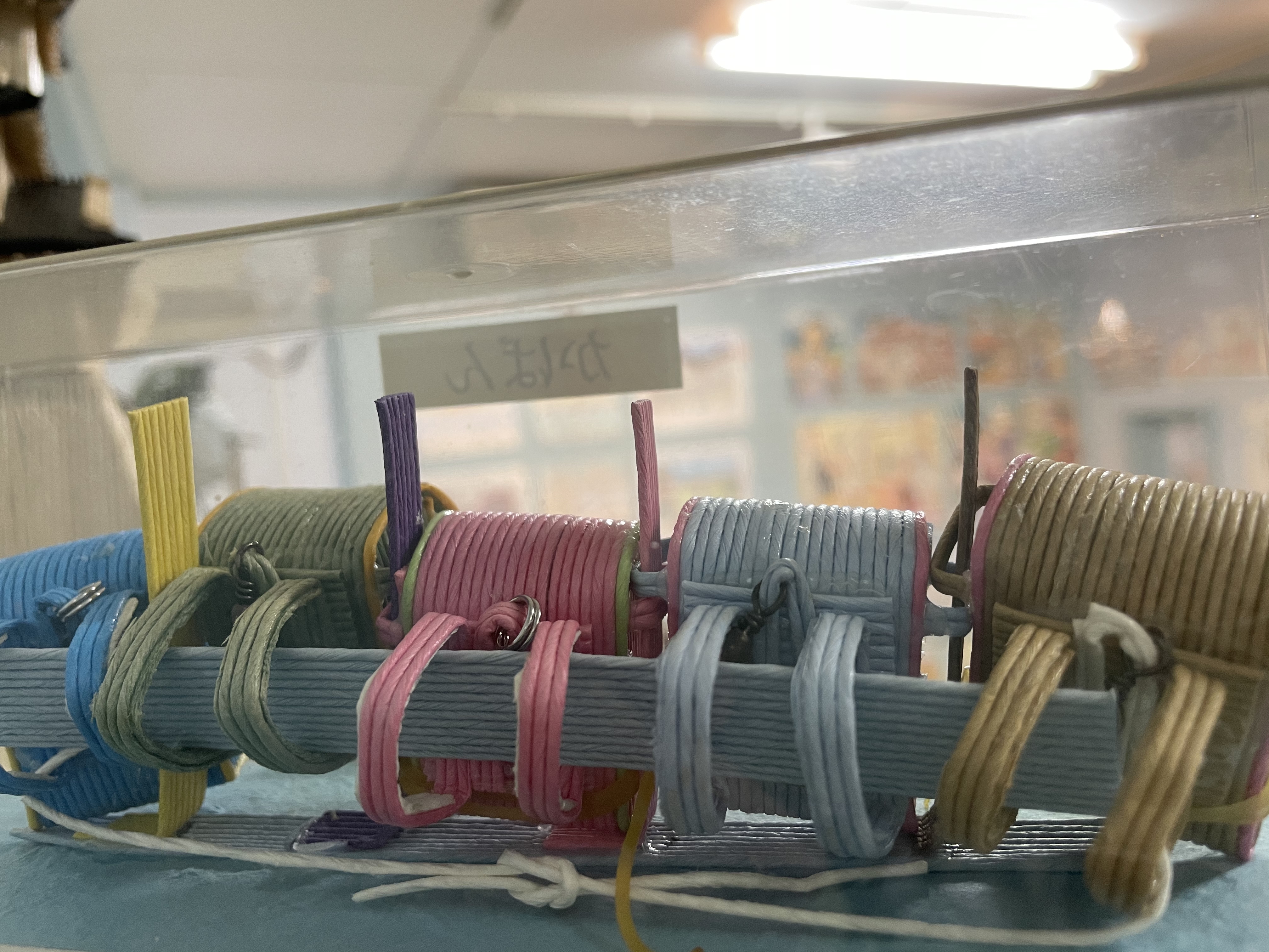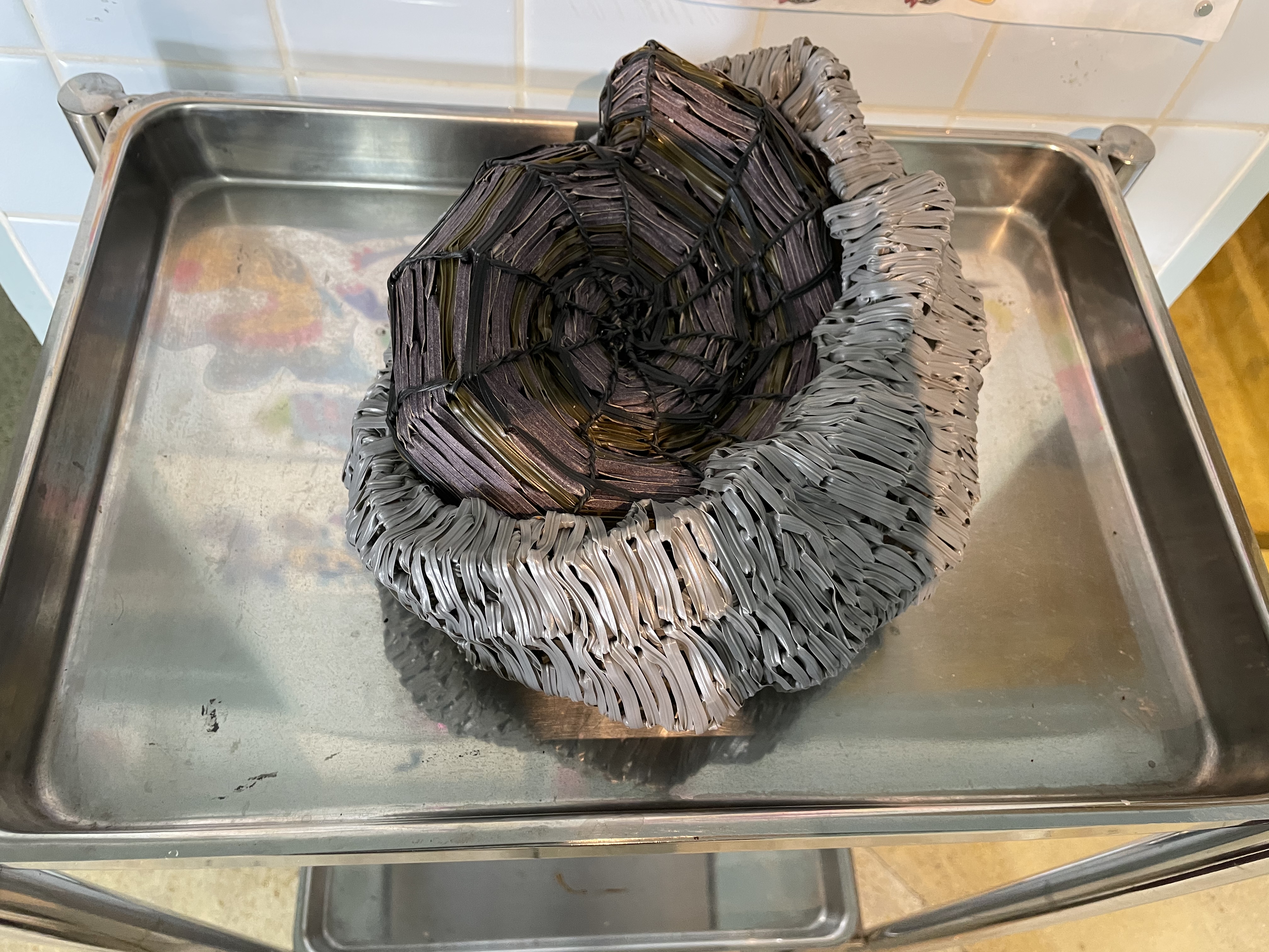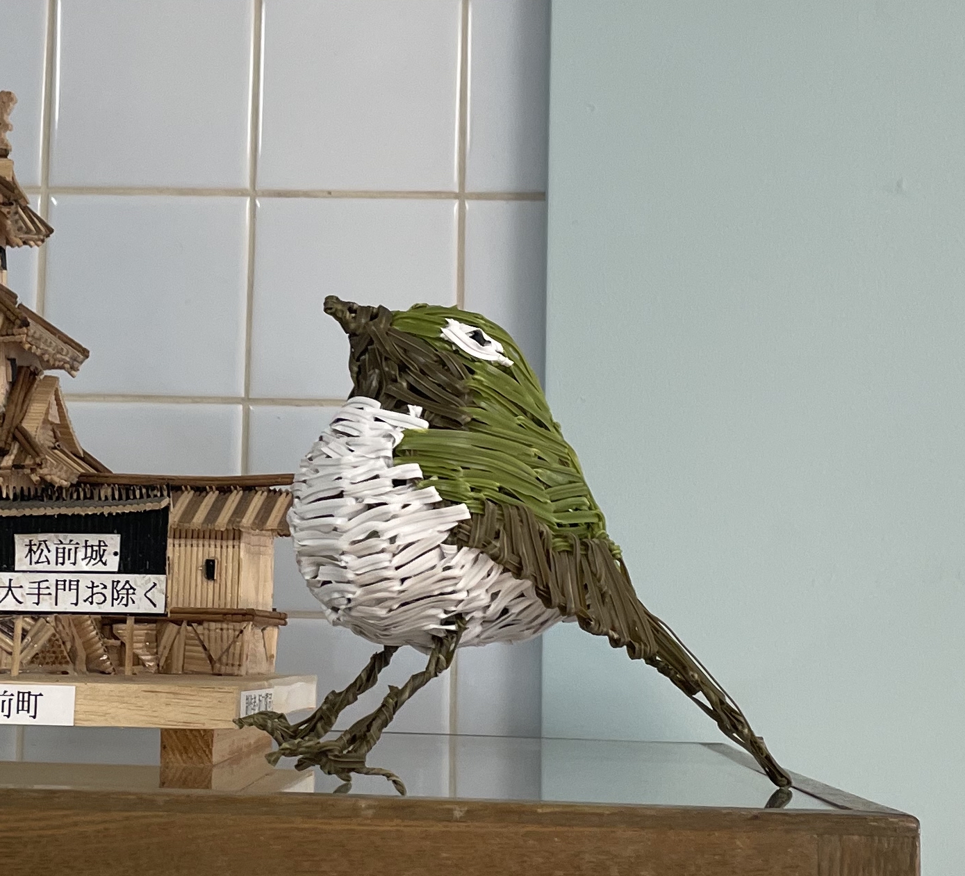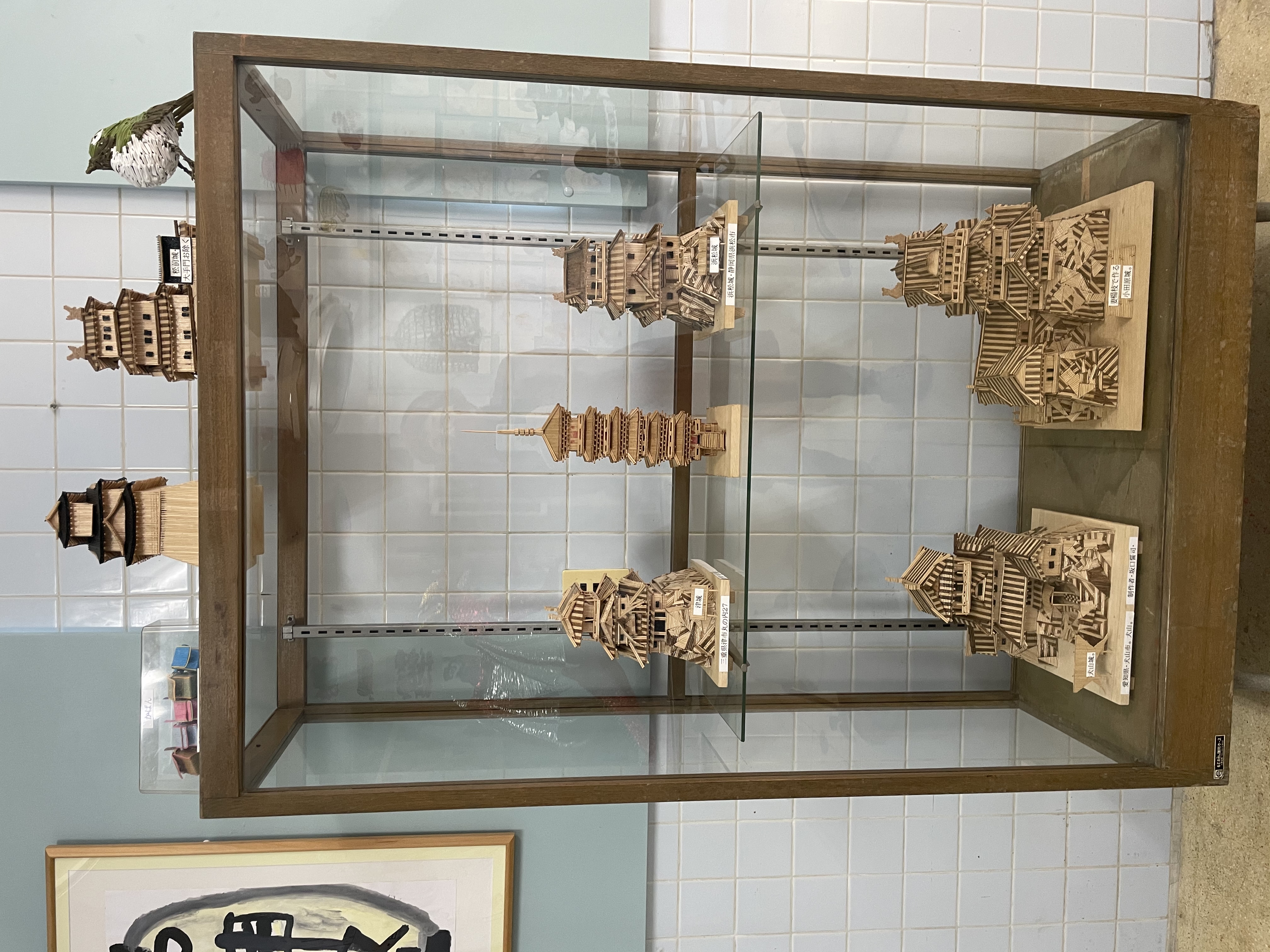 驚くことに今年(数え歳で)米寿を迎えるという坂口誓司は爪楊枝で作られた日本の名城シリーズを出品。坂口が城の模型をマッチ棒で作ってみたのは23歳のとき、今ではマッチ棒が爪楊枝に代わり、小倉城をはじめとする日本各地の名城を制作している。最近はお城の他に、カラフルな梱包用紙紐で編んだ籠や小さなランドセル、そしてワンちゃん101匹も生まれた。坂口さんは、惜しげもなくそれらのワンちゃんや籠を出品作に付けて、「会場でみなさんにお持ち帰りいただいてよいです!」と、提供。会期終了間近には、ワンちゃんたちもすっかり小さな行列となった。