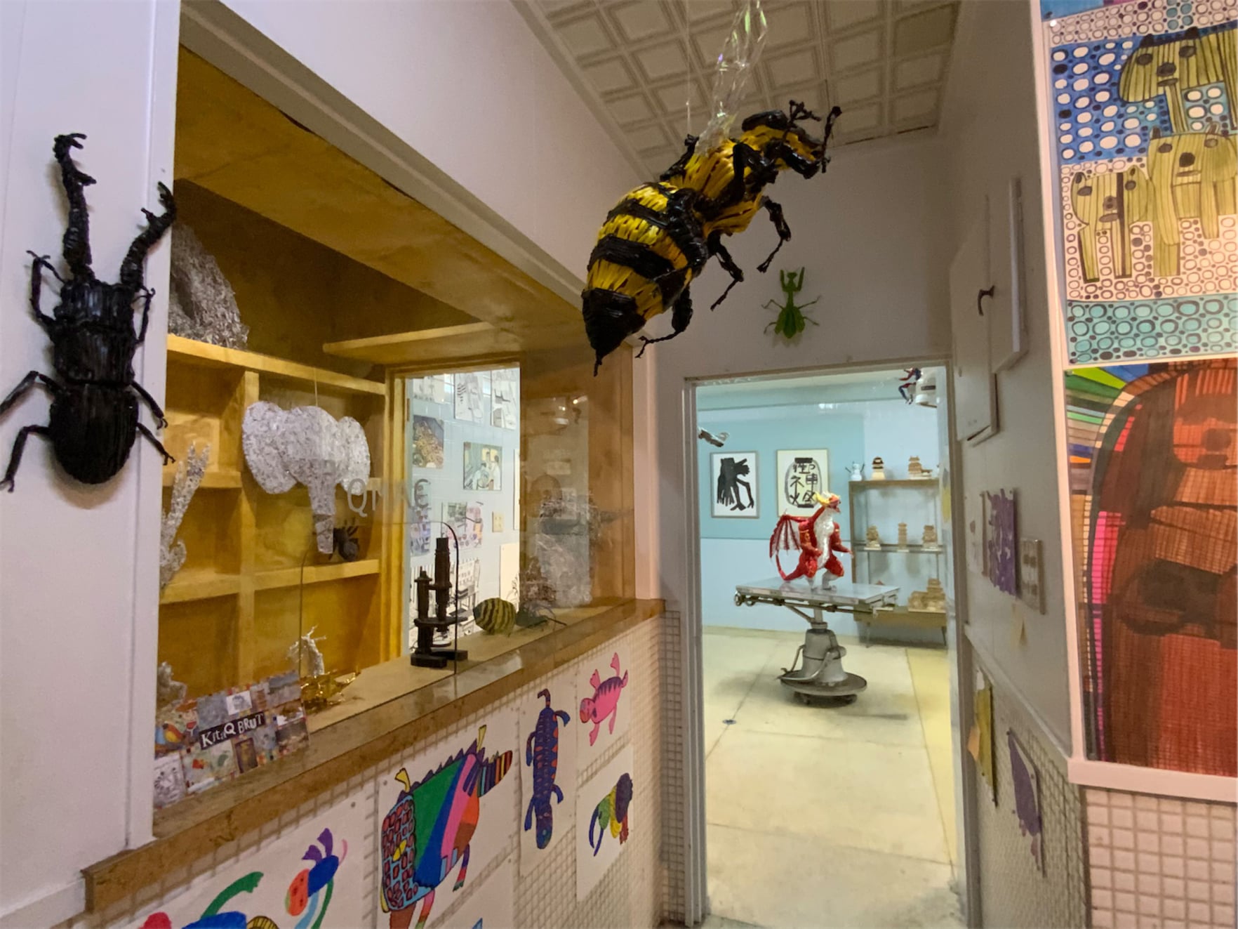 まず玄関を入ってすぐは上述のように友近邦宏やMARUのドローイング作品が展示されていた。細やかな線で描かれたMARUの作品が額装され個々に完結した世界を提示しているのに対して、画面を埋め尽くす丸や分割線も印象的な友近邦宏の作品は、大小の剥き出しの紙を支持体にして壁を埋め尽くすように広がっていた。好対照な「KitaQ BRUT」のはじまりから足をすすめると、展示室手前の受付カウンターにはシュレッダーに裁断された紙を固めた網岡俊介の作品に、イブのビニールタイによる作品、坂口誓司の爪楊枝による作品に、優太のドローイング。町屋を作った坂口以外の三者の作品が、主に生き物をモチーフにしたユーモラスな造形となっているためか、どこか楽し気な雰囲気が漂う。白を基調としつつも騒めくとりどりの色彩を内包した網岡に、ビニールの明快な色と独特の光沢が印象的なイブ、鮮やかなピンク、緑、青、紫、オレンジなどの鮮烈な色彩が目を引く優太に、茶系の落ち着いた色彩と質感の坂口と四者四様の個性がひしめき合う。受付内は蜜蝋で覆われたグリッド状の棚となっているのだが、そこからはみ出んばかりの作品配置も、エネルギー溢れる生き生きとした印象に繋がっているのだろう。