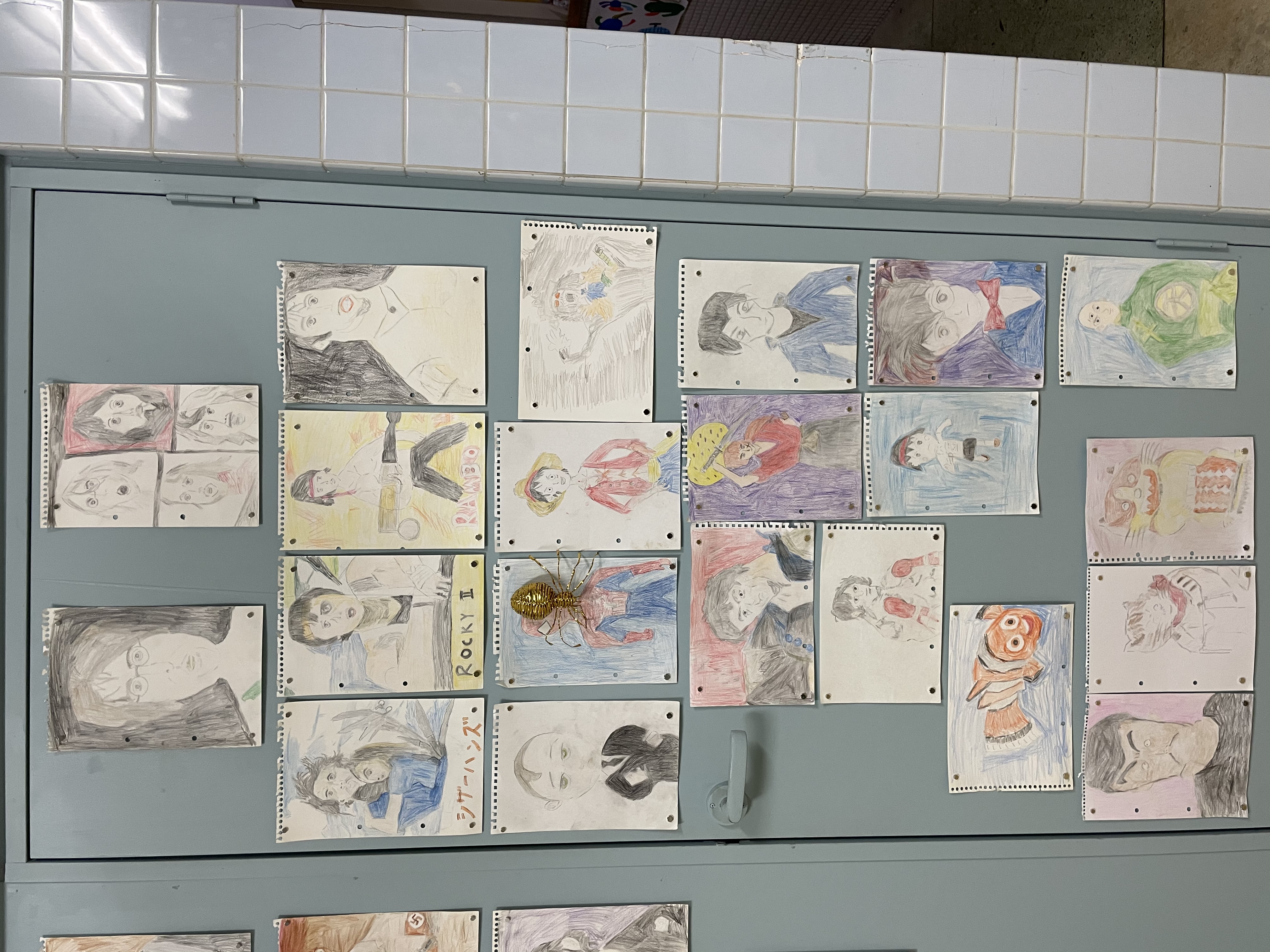 (右壁面タイル部分): アニメ・マンガのキャラクター ほか第3展示室に大きめのサイズ作品がファイルが置いてあった。