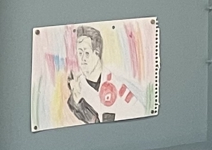 宇津宮賢司の作品は色鉛筆で薄っすらと描かれたポートレートのシリーズ。派手な色彩で鳥や動物を描いた魅力的な作品も多くあったが、人物ばかり見ていると、モデルと似ているところ、独自の解釈が出ているところが興味津々だったのでポートレートを集めてみた。〈名画シリーズ〉〈歴史上の人物シリーズ〉〈アニメや映画のヒーローたち〉の3つのグループに分かれて壁をびっしりと埋めつくしている。五郎丸選手だけは石江さんにも五郎丸を描いたものがあったので、石江作品のそばに並べた。