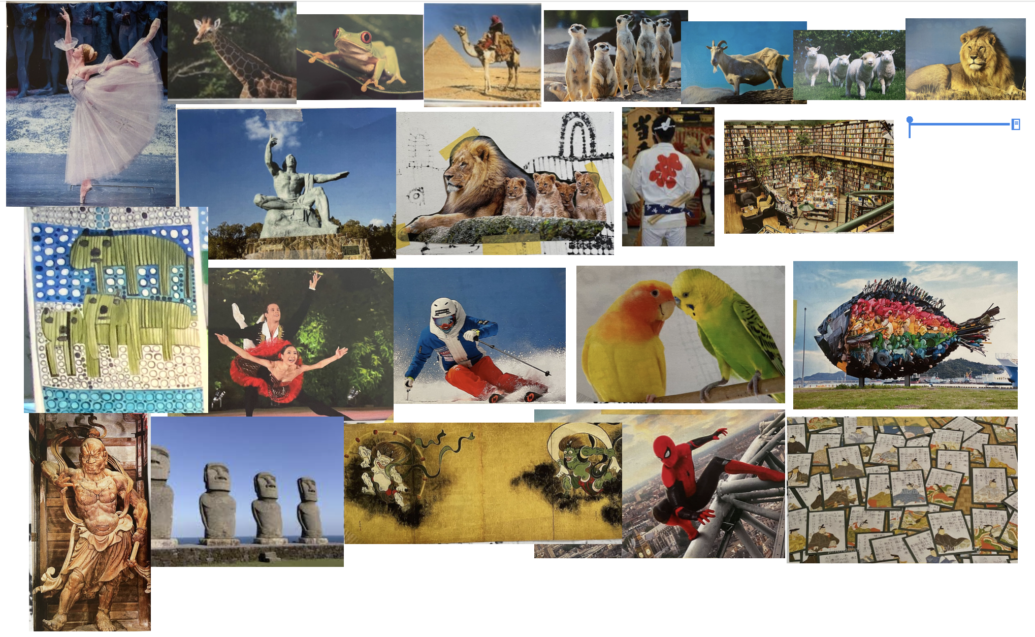 (第1室右壁面) :スポーツ選手/日本の古典絵画・彫刻/海外の歴史的記念碑・建造物や風物詩/動物たち