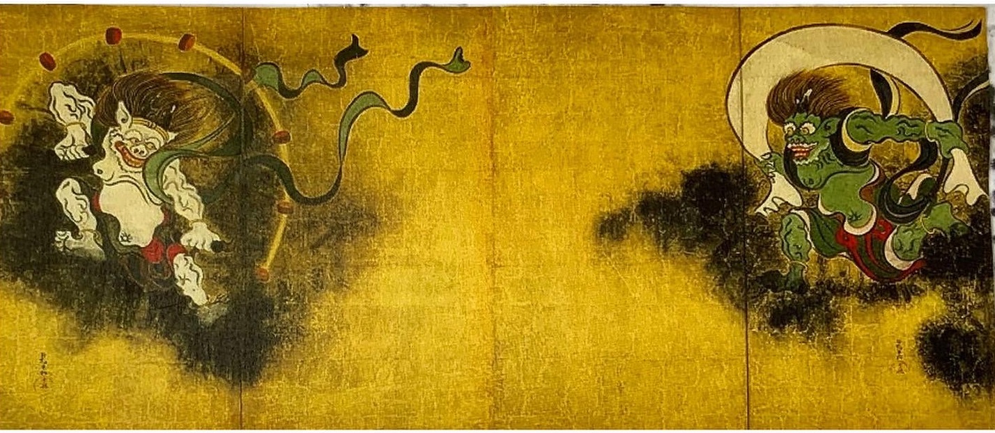 弾けそうなエネルギーに満ちた石江祐一の作品、牧場の牛や、釣りするお父さんなど、何気ない日常も迫力いっぱい活劇調で描かれている。神社の提灯の横に八咫烏が並ぶとありがたい雰囲気も漂う。真ん中に立つのはラグビーの五郎丸選手、キックポーズ。
