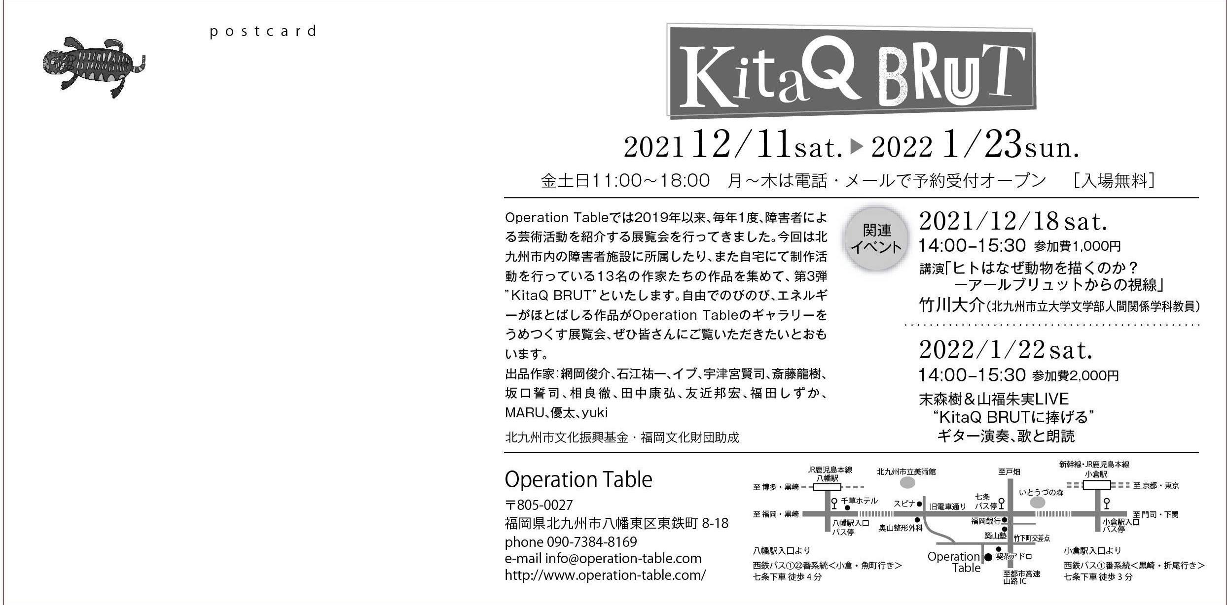 展覧会 “KitaQ BRUT”ご案内します。北九州市内の障害者施設に所属したり、自宅にて制作活動を行っている13名の作家たちの作品を集めました。見慣れた世界の見過ごされている片隅を捉えたもの、誰も見たことのない夢やファンタジーの世界、そしてみなが知っている動物たちや有名人、アニメや漫画のキャラクターも思いもよらぬ変身を遂げています。エネルギーがほとばしる作品150点がOperation Tableのギャラリーをうめつくす展覧会、ぜひ皆さんにご覧いただきたいとおもいます。