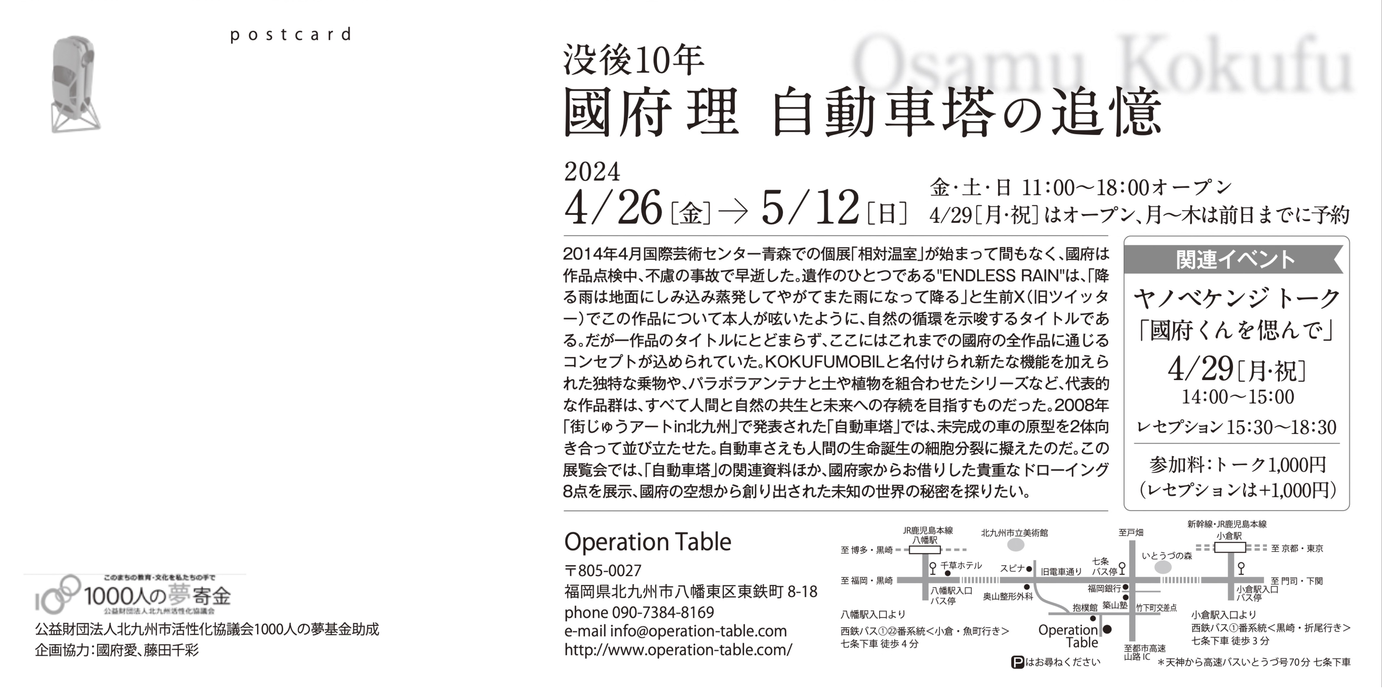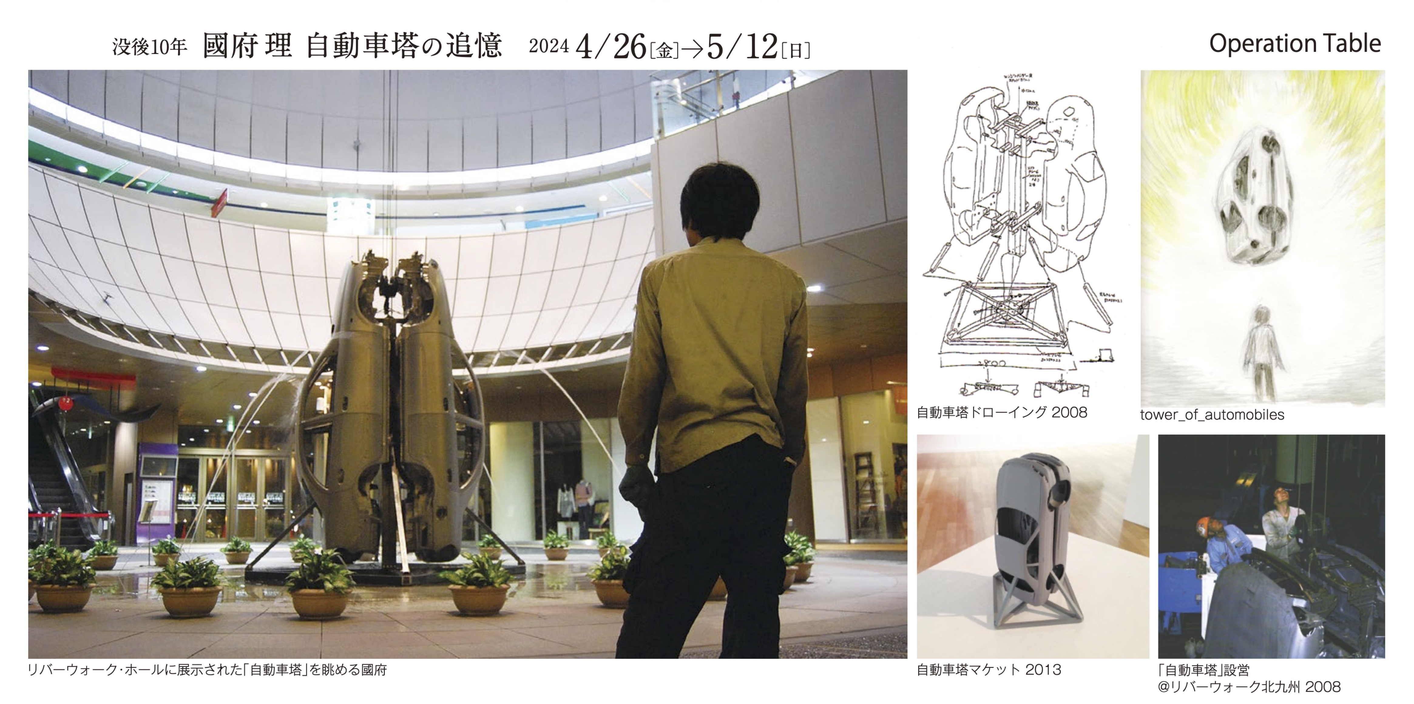 2014年4月国際芸術センター青森での個展「相対温室」が始まって間もなく、國府は作品点検中、不慮の事故で早逝した。遺作のひとつであるENDLESS RAIN"は、「降る雨は地面にしみ込み蒸発してやがてまた雨になって降る」と生前X(旧ツイッター)でこの作品について本人が呟いたように、自然の循環を示唆するタイトルである。だが一作品のタイトルにとどまらず、ここにはこれまでの國府の全作品に通じるコンセプトが込められていた。KOKUFUMOBILと名付けられ新たな機能を加えられた独特な乗物や、パラボラアンテナと土や植物を組合わせたシリーズなど、代表的な作品群は、すべて人間と自然の共生と未来への存続を目指すものだった。2008年「街じゅうアートin北九州」で発表された「自動車塔」では、未完成の車の原型を2体向き合って並び立たせた。自動車さえも人間の生命誕生の細胞分裂に擬えたのだ。この展覧会では、「自動車塔」の関連資料ほか、國府家からお借りした貴重なドローイング8点を展示、國府の空想から創り出された未知の世界の秘密を探りたい。