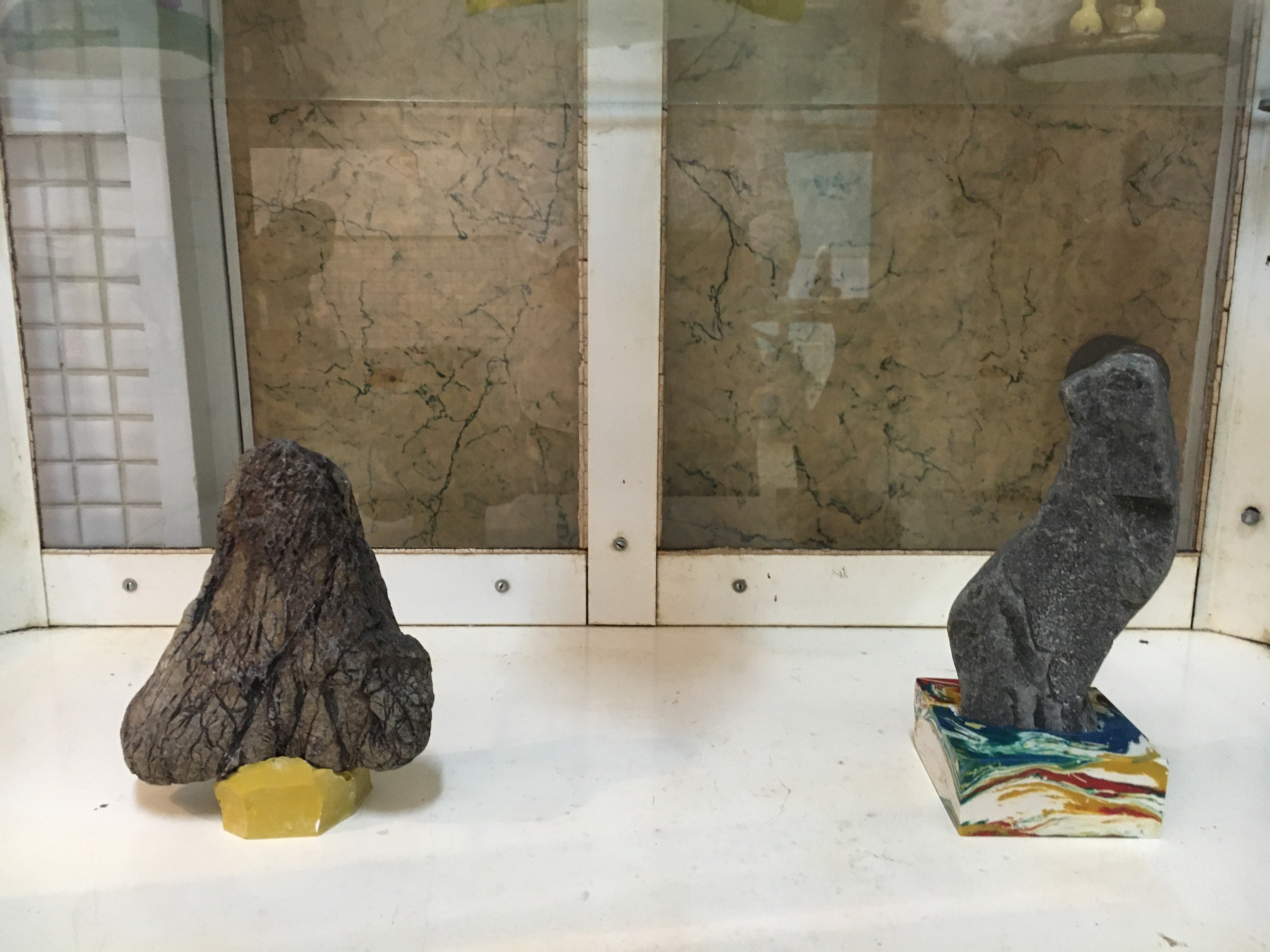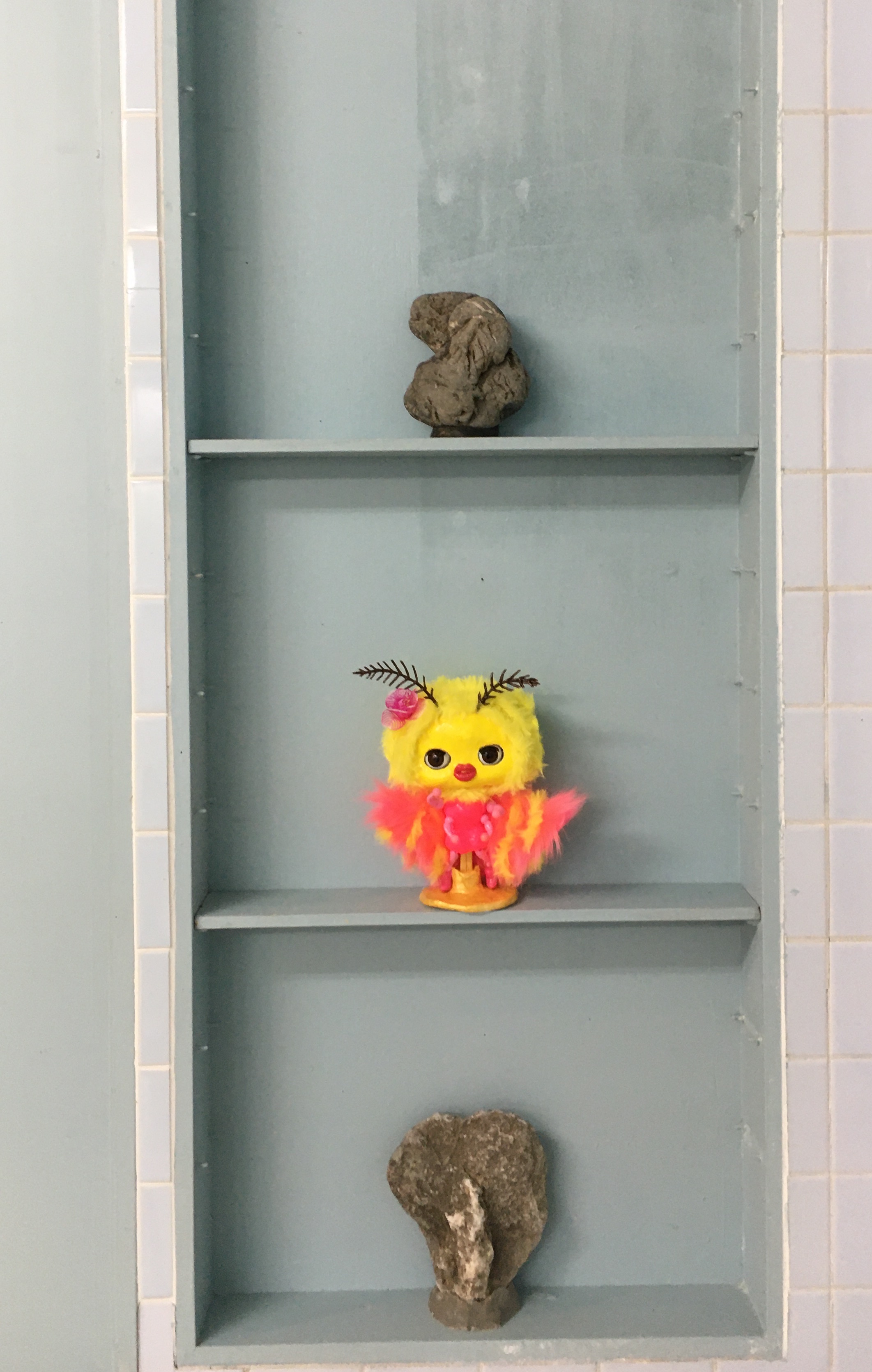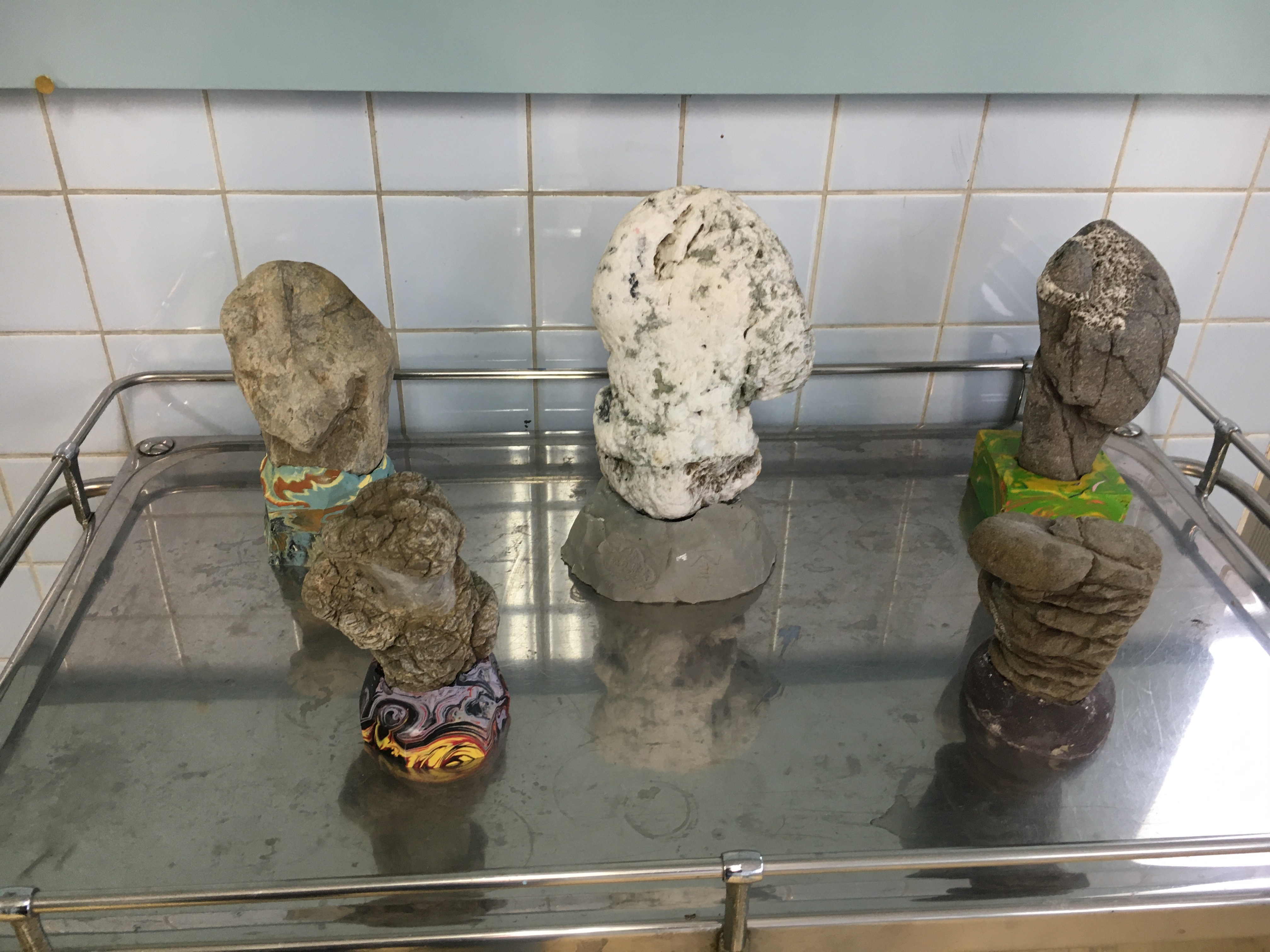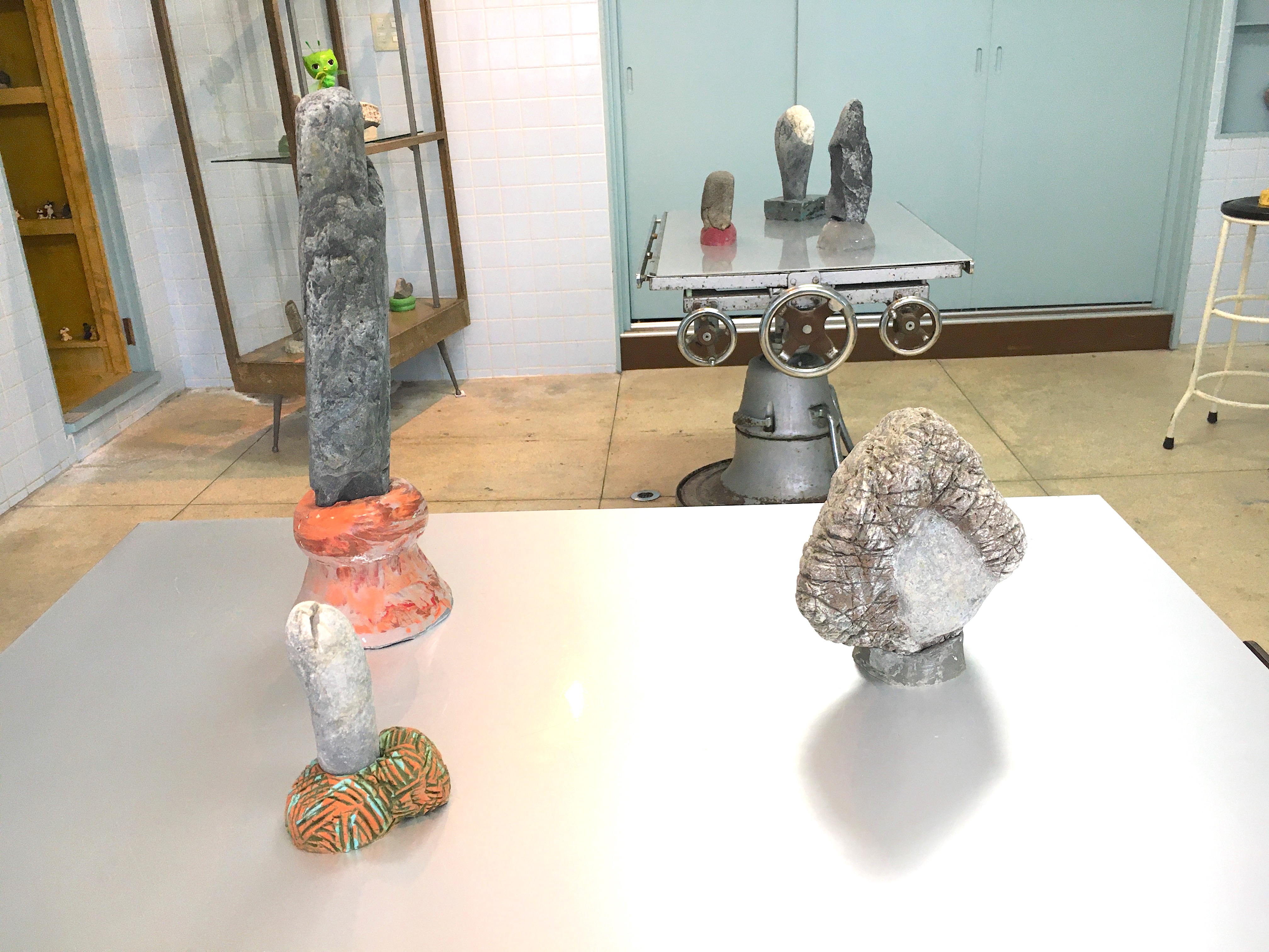 まるで昭和のアングラ演劇を連想させるようなタイトル。久保田弘成と鈴山キナコという異色のカップリングによる二人展であるが、久保田はファルス的シンボルのような自然石を自らの立体作品でもある「根立」という台座で屹立させた「根石」を、鈴山は昆虫をモチーフにしたデコラティブなクレイオブジェを並べる。象徴的な男と女の造形が並置されるその展示からは、ジェンダーフリーが声高に叫ばれる現代という時代に逆行するかのような性差の強調を感じとる人も多いかも知れない。しかし、手術台や医療器具の棚など動物病院時代の記憶がそのまま残る展示空間によって、単純な「男らしさ」と「女らしさ」の対比に止まらない、両者の作品の実験的交わりの印象が強化される。そこから我々は何を読み取るべきだろうか。
